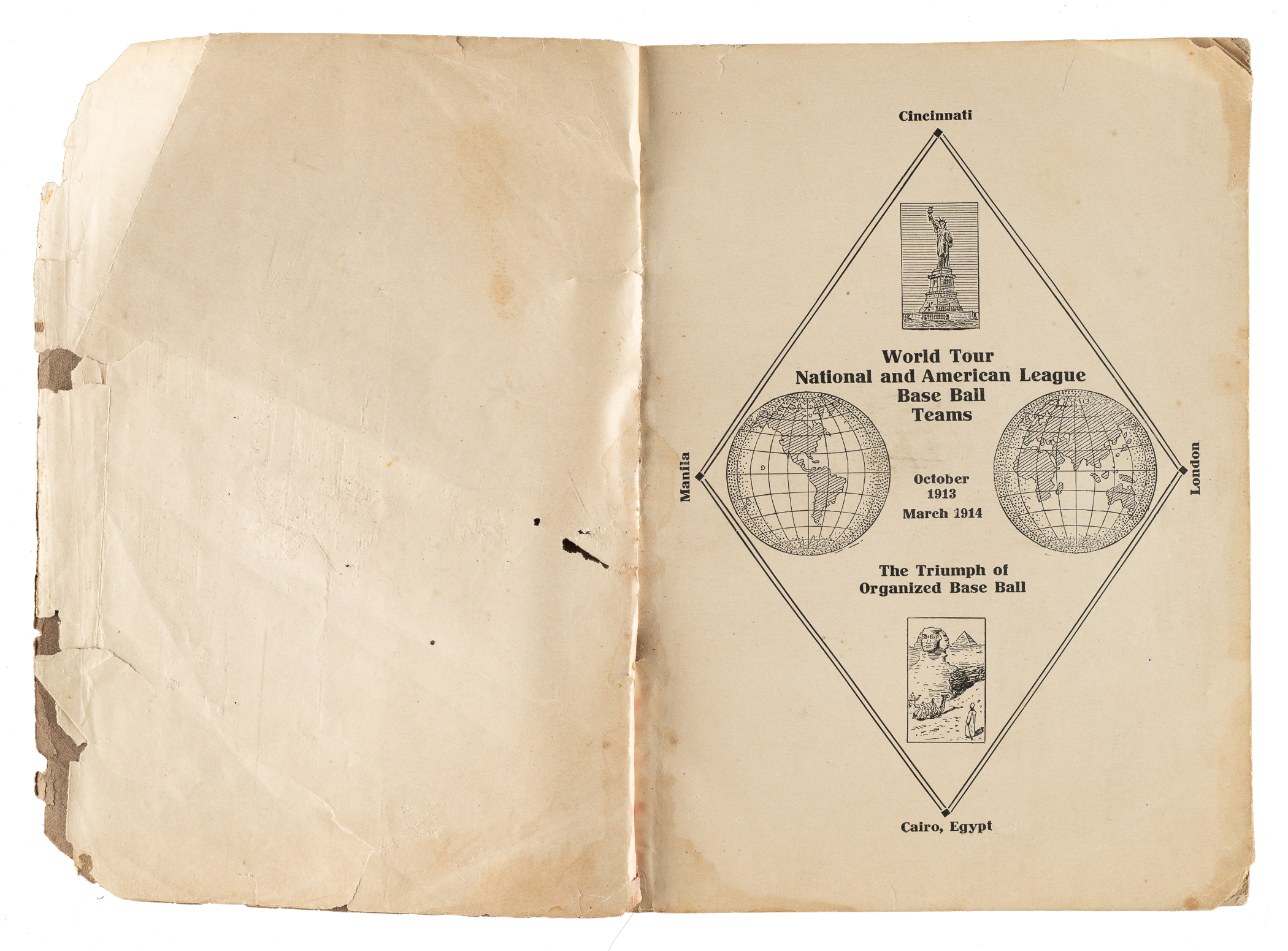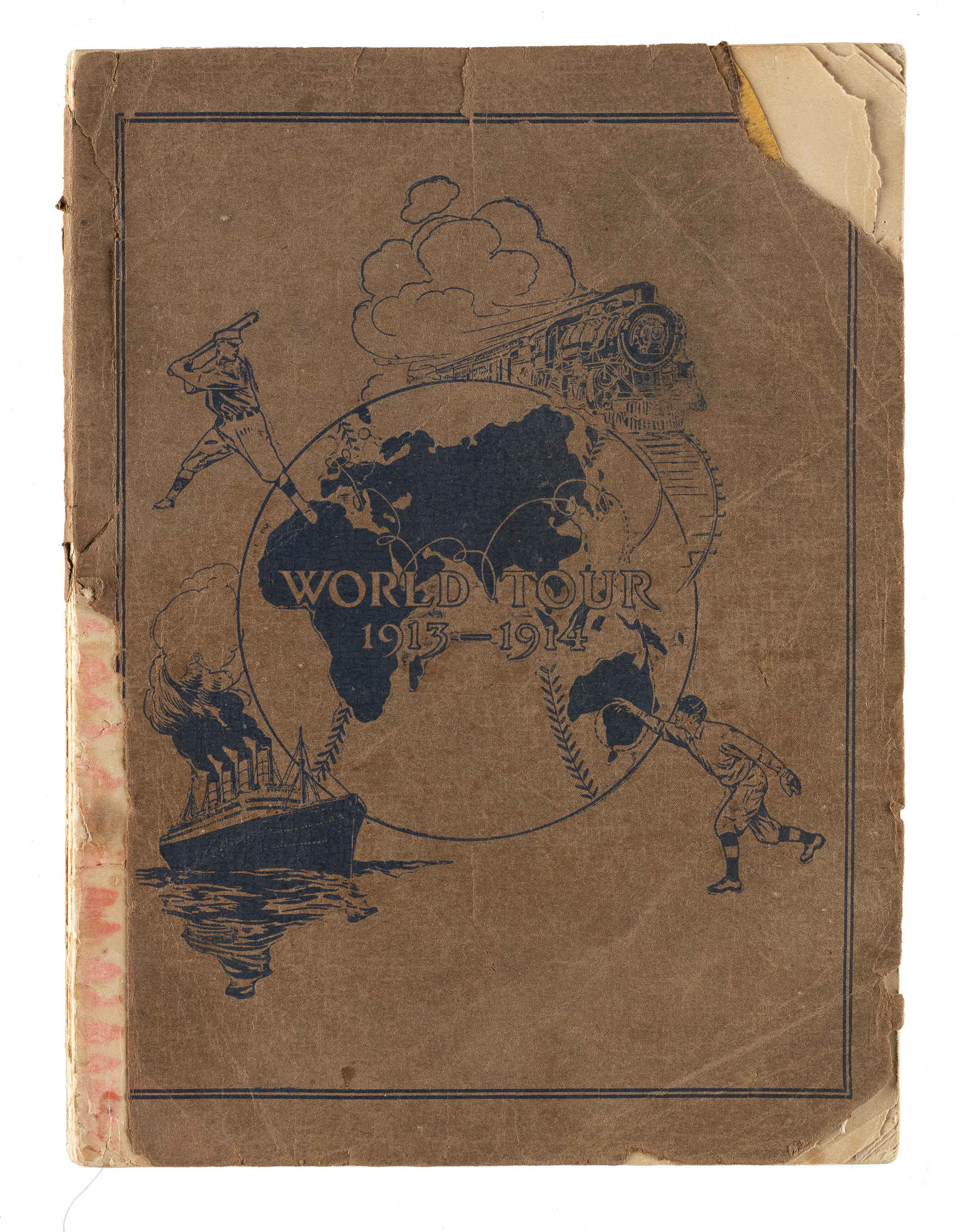 Rare publication issued to commemorate the Chicago White Sox and New York Giants World Tour of 1913-1914. Published by S. Black Willsden & Co. (Chicago) in 1914 immediately following the tour, the 128-page book features hundreds of photos as well as a day-by-day diary of the trip. Included among the images are full-page photos of Charles Comiskey (organizer of the tour and owner of the White Sox), John McGraw (manager of the Giants), and James Callahan (manager of the White Sox), as well as individual portrait images of all of the tour members including Jim Thorpe, Tris Speaker, Buck Weaver, Sam Crawford, Urban Faber, Hans Lobert, Fred Merkle, and Mike Donlin. These same players and many others are pictured throughout the book, both on and off the field, in such faraway lands as Australia, Japan, Egypt, Italy, France, and England. This was one of the great world baseball tours, which was inspired by the World Tour of 1888-1889 and preceded the famous tours of Japan of the 1930s. The brown, soft-cover book (7.25 x 10 inches) displays numerous tears and creases to the front and back covers. Several of the pages display small edge tears. In Fair condition overall, but still a fine representative copy of this seldom-seen program.