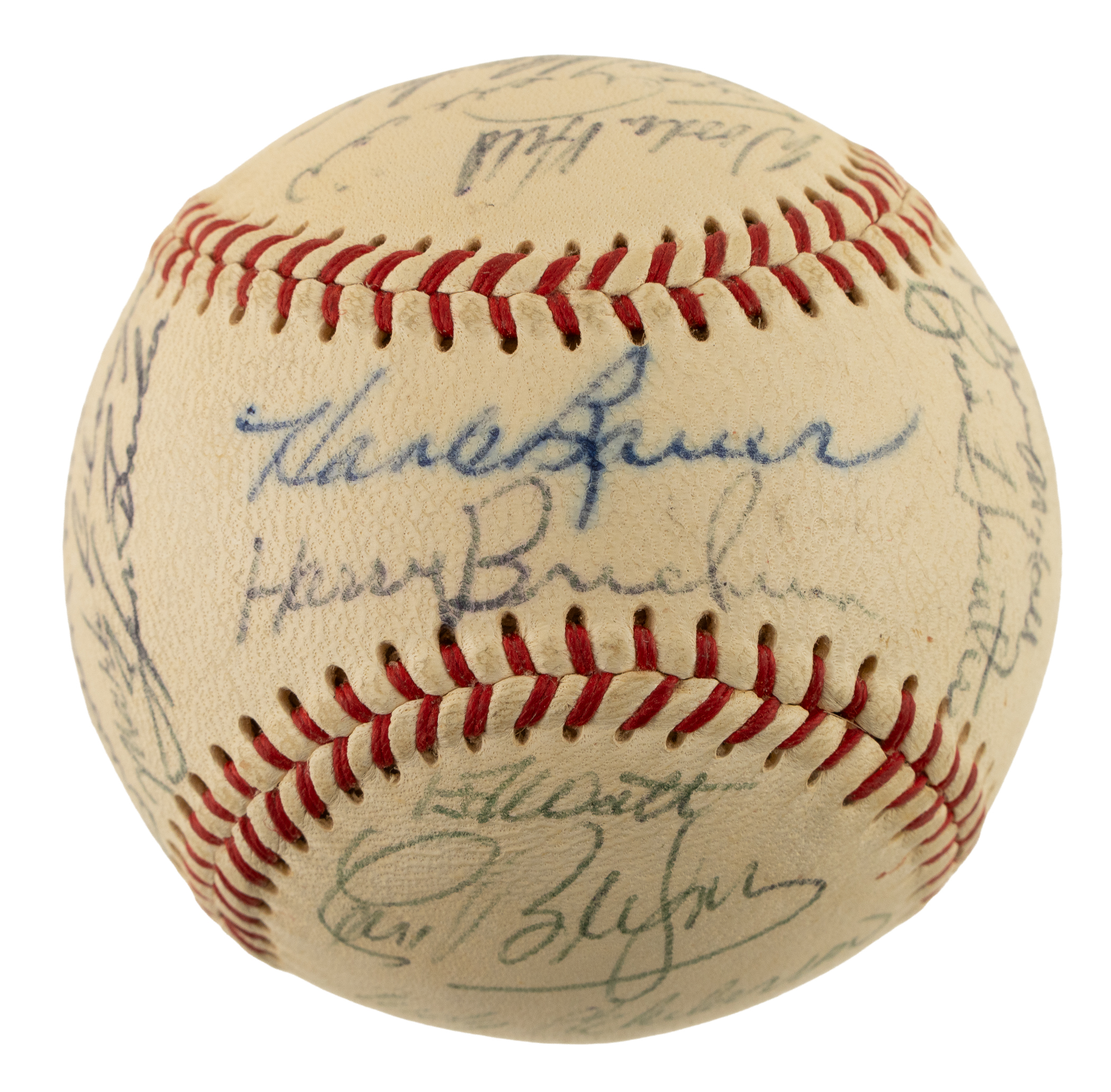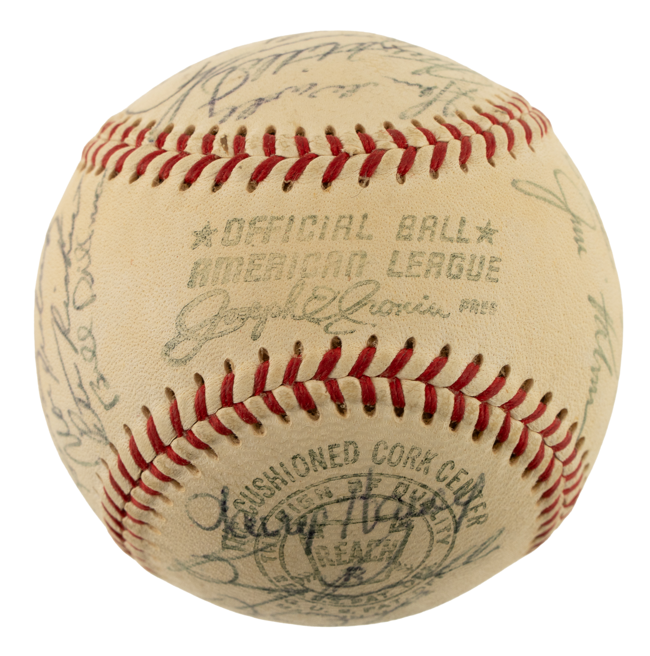 Official American League baseball (Cronin) signed in blue ink by 27 members of the 1967 Baltimore Orioles, including F. Robinson, B. Robinson, Aparicio, Palmer, Bauer (Mgr. sweet spot), Brecheen (coach, sweet spot), Belanger, Woodling (coach), Barber, Haney, Powell, D. Johnson, McNally, Hunter (coach), Watt, Blefary, Etchebarren, E. Fisher, Dillman (only season with the O’s was 1967), Richert, Drabowsky, Bowens, Blair, Bunker, Held, S. Miller, and Roznovsky. Near Mint condition overall. Auction LOA from James Spence/JSA.