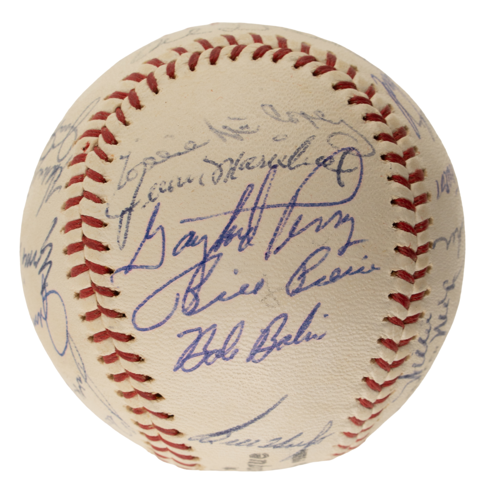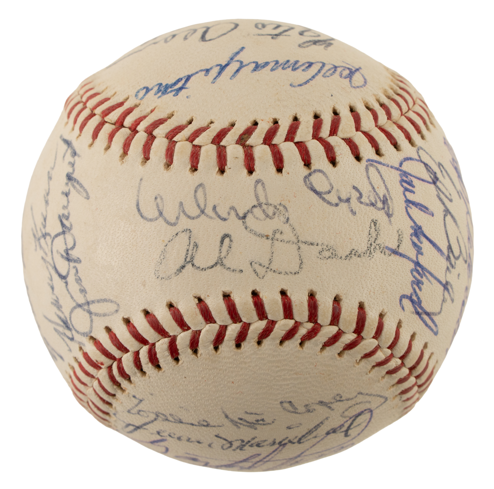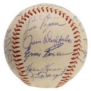 Official National League baseball (Giles) signed in blue ink by the following twenty-six members of the 1963 San Francisco Giants: Mays, McCovey, Cepeda (sweet spot), Marichal, Perry, Larsen, Pagan, Bowman, Duffalo, O’Dell, Kuenn (deceased in 1988 at the young age of 57), Davenport, Peterson (deceased in 1980 at the young age 37), Fisher (1963 was his only season in SF), Bailey, Sanford, Pierce, Bolin, Hoeft, Hiller, Haller, M. Alou, Amalfitano, F. Alou, and Stanek (1963 was his only season in SF). According to JSA the signature of Al Dark along sweet spot is a stamp (a common practice on Giants team balls). The 1963 Giants finished 88–74, placing third in the National League under manager Alvin Dark. Willie Mays delivered another elite season with 38 home runs and 103 RBI, while Willie McCovey added big power with 44 homers. Juan Marichal led the pitching staff with a 25–8 record and a 2.41 ERA, emerging as one of baseball’s dominant aces. Despite strong individual performances and one of the league’s most dangerous lineups, San Francisco couldn’t catch the Dodgers and Cardinals in a tightly contested pennant race. The ball remains in Near Mint condition overall. This is an outstanding San Francisco Giants team signed ball. Auction LOA from James Spence/JSA.