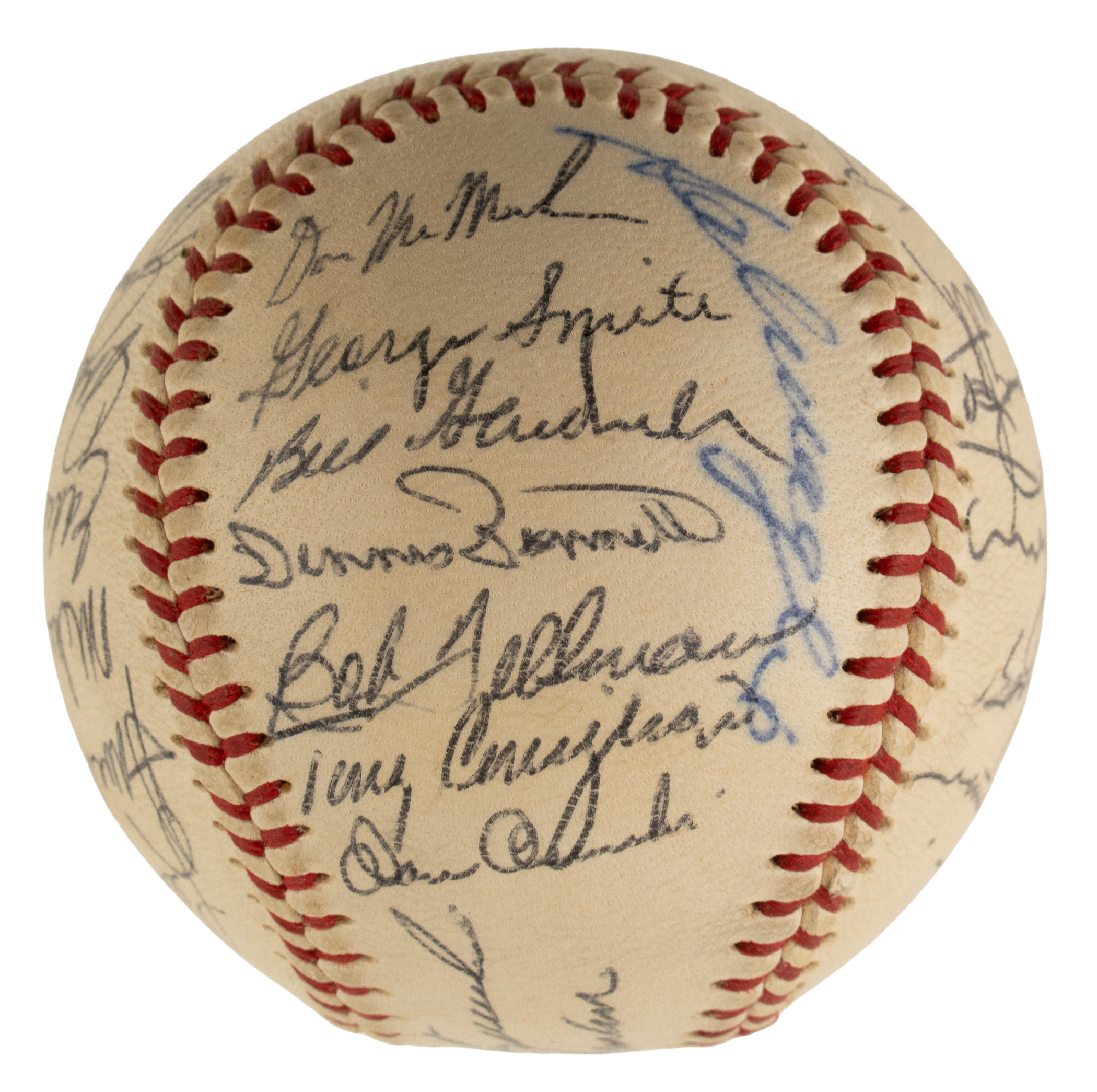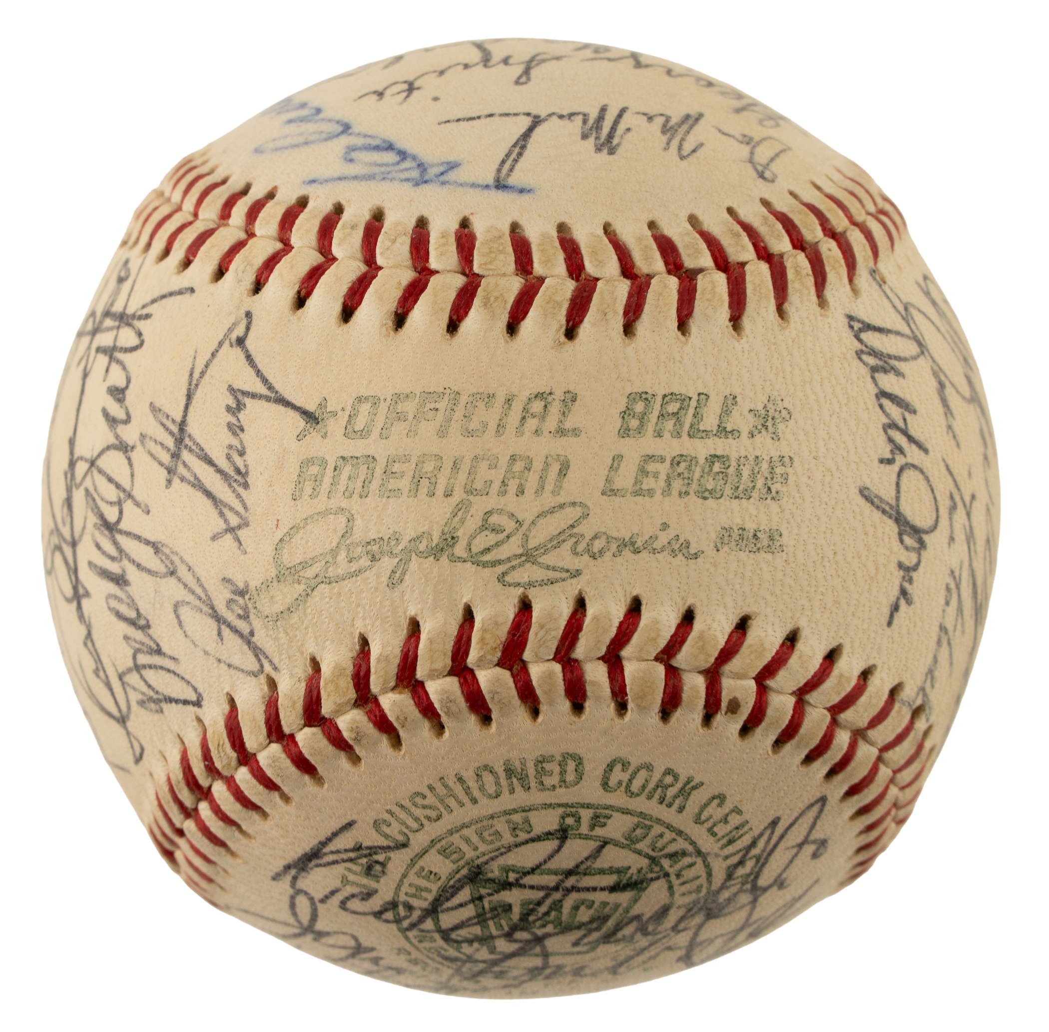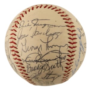 Official American League baseball (Cronin) signed predominantly in black ink by 28 members of the 1966 Boston Red Sox, including Yastrzemski (sweet spot), Herman (Mgr, sweet spot), Conigliaro (deceased in 1990 at the young age of 45), Osinski, Tillman, Bennett, Gardner (coach), G. Smith, McMahon (deceased in 1987 at the young age of 57), Maglie (coach), Petrocelli, Lonborg, Runnels (coach), Foy (deceased in 1989 at the young age of 46), Sheldon (his only season with the Red Sox), Jones, Tartabull, Wyatt, Kasko, Ryan, Morehead, Okrie (coach), Stigman, Santiago, Thomas, Stange, and Scott (rookie season). The 1966 Red Sox went 72–90 and finished ninth in the American League. It was a transition year that set the stage for the 1967 “Impossible Dream” season. Carl Yastrzemski and Tony Conigliaro provided the main power, while rookie George Scott impressed with solid defense and 27 home runs. Pitching was inconsistent despite flashes from Jim Lonborg and Jose Santiago. Manager Billy Herman was dismissed late in the year, and interim manager Pete Runnels closed out a rebuilding season. The ball displays a couple light spots of discoloration but is otherwise in Near Mint condition overall. Auction LOA from James Spence/JSA.