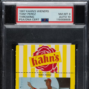 Outstanding signed example of Cincinnati Reds Hall of Famer Tony Perez's 1967 Kahn's Wieners card (throwing pose). PSA/DNA has encapsulated the card, grading the signature GEM MINT 10 and the card NM-MT 8. Perez has signed the card in black ink along the front. This is the ONLY signed example of this card ever encapsulated by PSA/DNA!