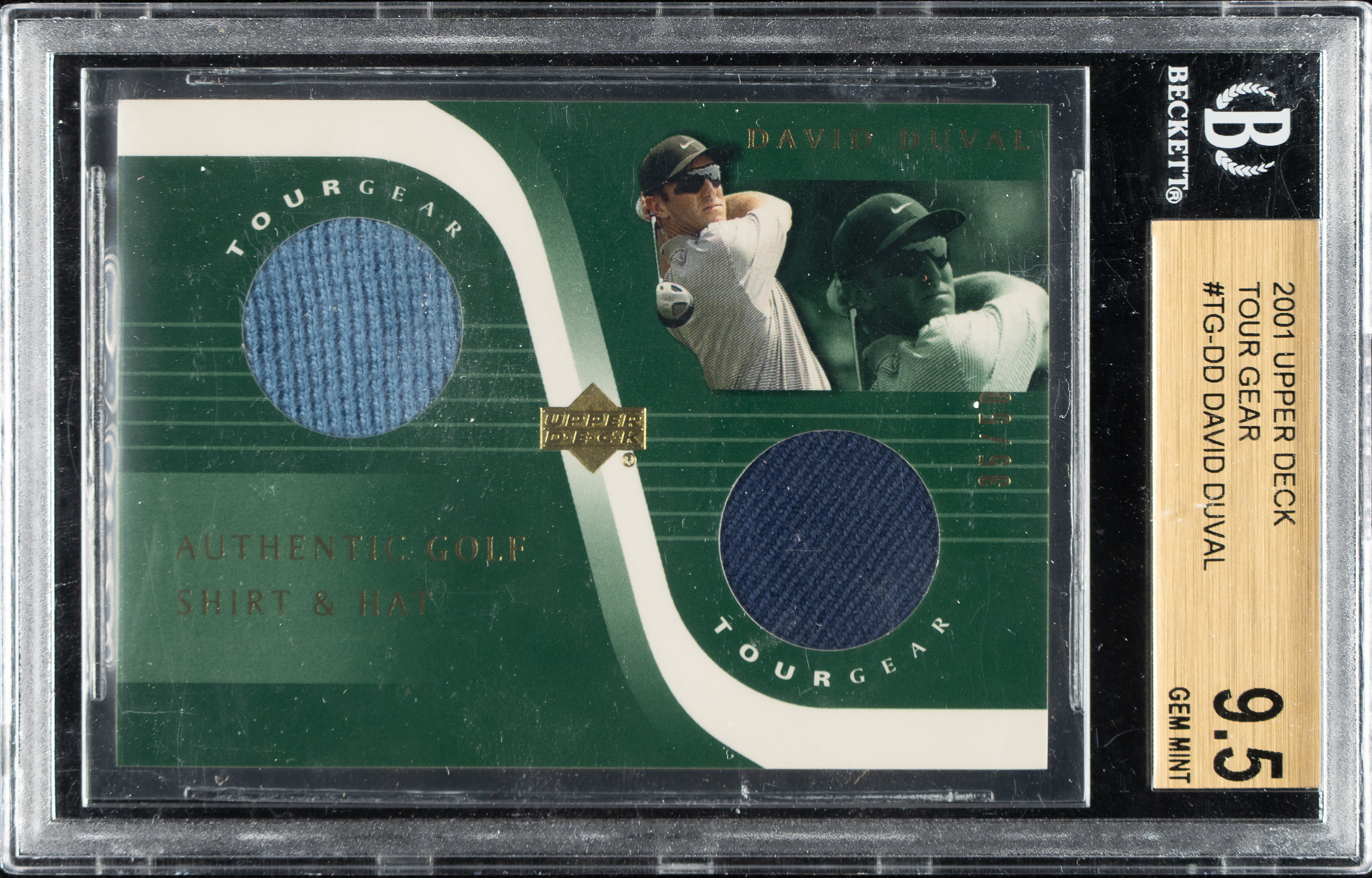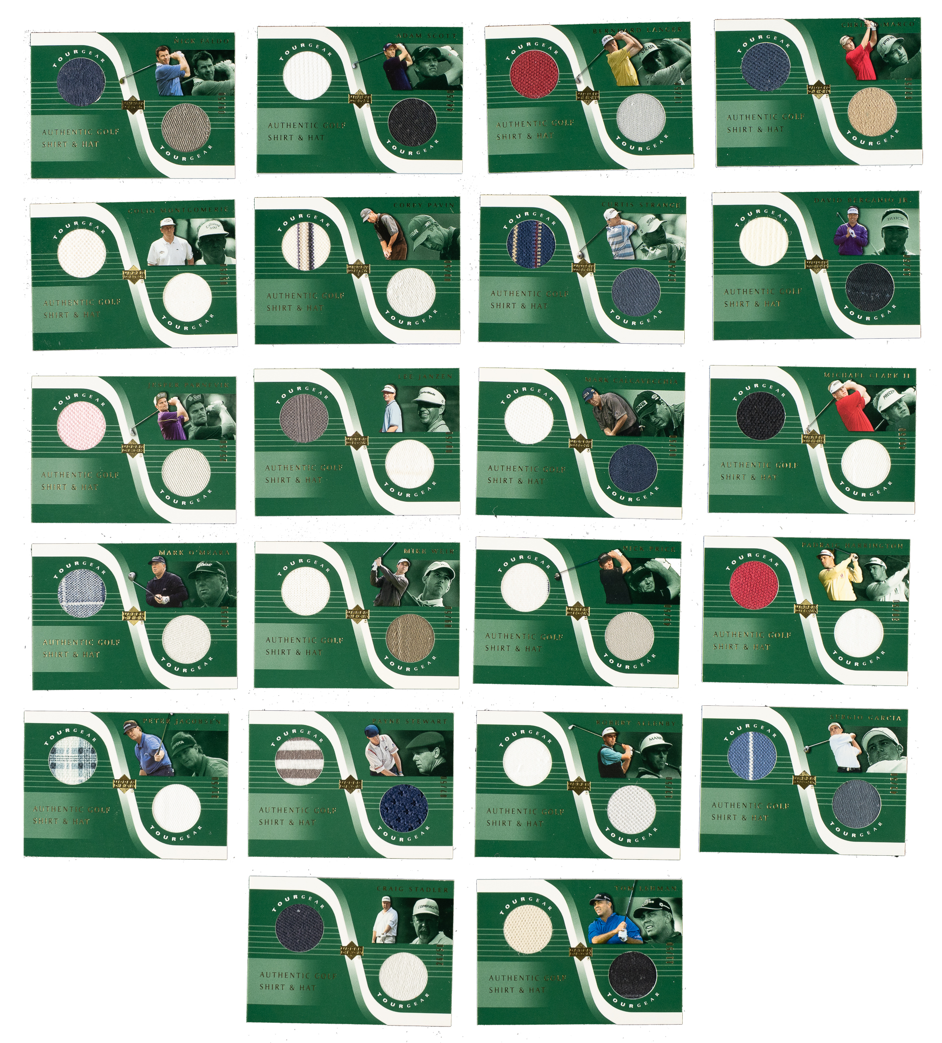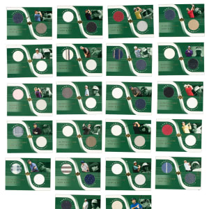 Presented is a complete 27-card set of 2001 Upper Deck Tour Gear golf cards, each numbered out of 50! This set is highlighted by Tiger Woods. Condition is mostly Nr/Mt-Mt to Mint, with a few Nr/Mt, a couple Ex to Ex-Mt, and two Vg-Ex. Keys: #TG-FC Couples (Nr/Mt-Mt, #50/50), TG-JD Daly (Nr/Mt-Mt+), TG-DDDuval (BGS GEM MINT 9.5), TG-NF Faldo (Ex+), TG-JNNicklaus (Vg-Ex+), and TG-TW Woods (Mint). Total: 27 cards.
