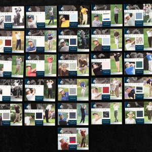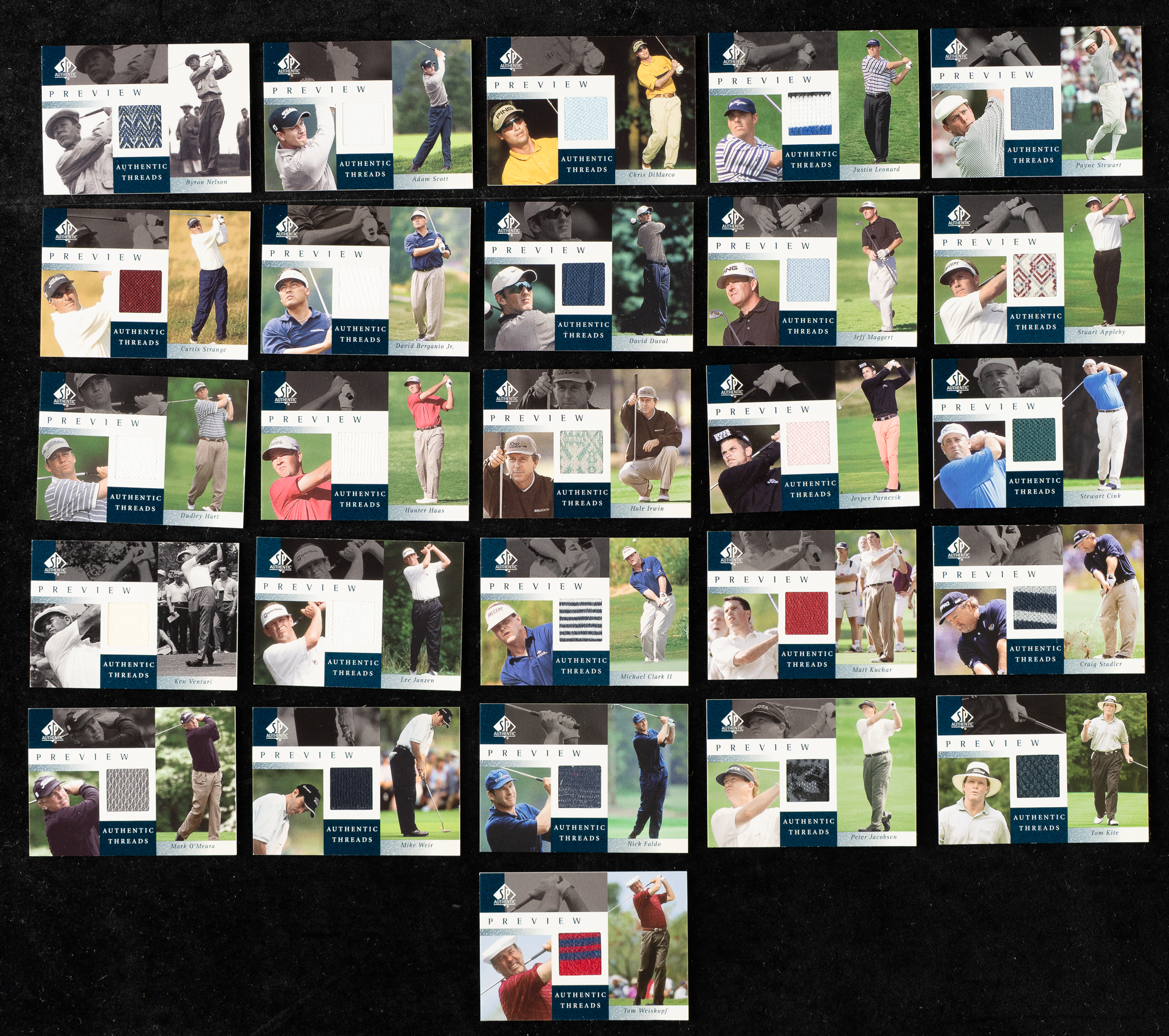 Offered is a complete 30-card set of 2001 Upper Deck SP Authentic Preview Authentic Threads golf cards, highlighted by Tiger Woods! Condition is 80% Nr/Mt to Nr/Mt-Mt (including a couple Mint) and 20% lesser (ranging from Vg-Ex to Ex-Mt). Keys: JD-AT John Daly (Nr/Mt-Mt+), SG-AT Sergio Garcia (Mint), BN-AT Byron Nelson (Ex-Mt), GP-AT Gary Player (Vg-Ex), and TW-AT Tiger Woods (Nr/Mt-Mt). Total: 30 cards.