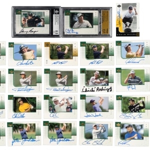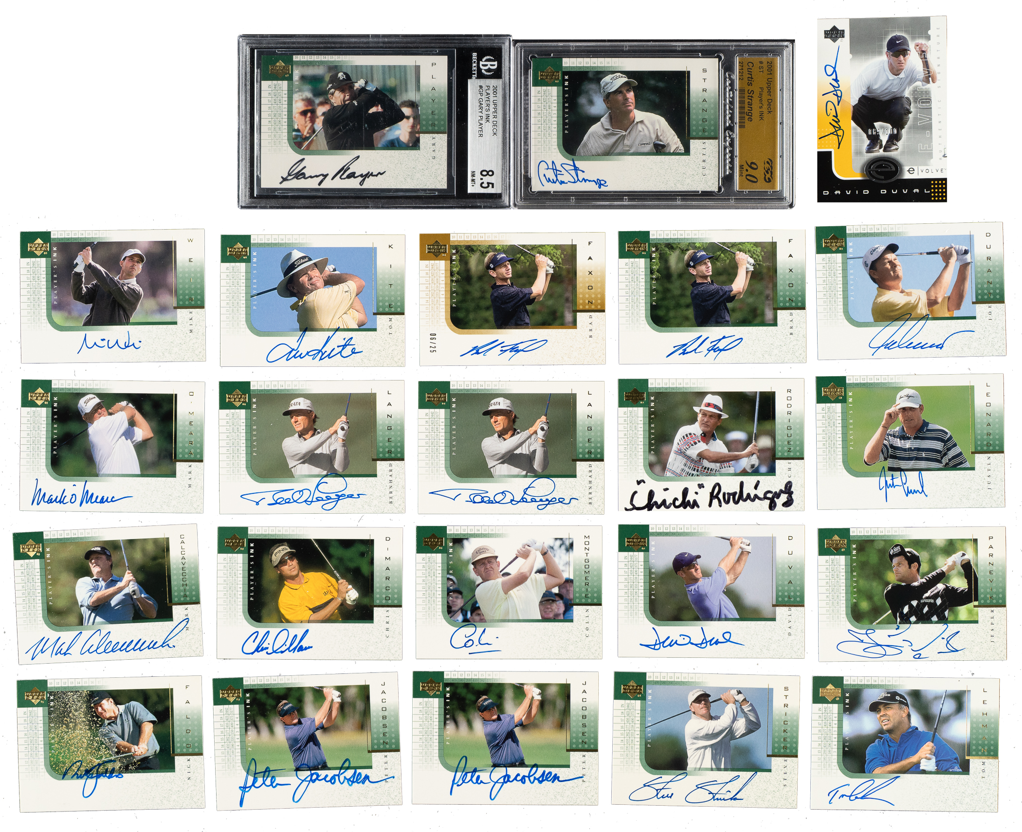Presented is a near-complete set (minus one) of 2001 Upper Deck Player's Ink Golf, consisting of 23 different cards (out of 24 in the set). Missing only #TW Tiger Woods for completion (offered separately in this auction). Included are two duplicates (Jacobsen and Langer), one Gold parallel insert (Faxon), and one 2001 Upper Deck eVolve Autograph card (Duval #069/100). Condition ranges from Nr/Mt to Mint, with a few lesser. The #ST Curtis Strange example resides in a Certified Express holder. Keys: #FC Couples (Ex+), JD Daly (Nr/Mt-Mt), BF Faxon (Mint, Gold #06/25), SG Garcia (Nr/Mt-Mt), TK Kite (Nr/Mt-Mt+), AP Palmer (Ex-Mt+), and GP Player (BGS NM-MT+ 8.5). Total: 27 cards.