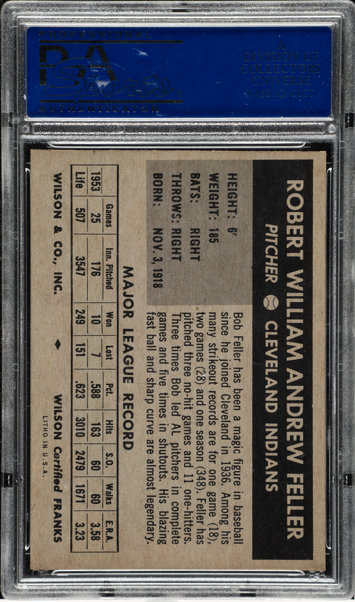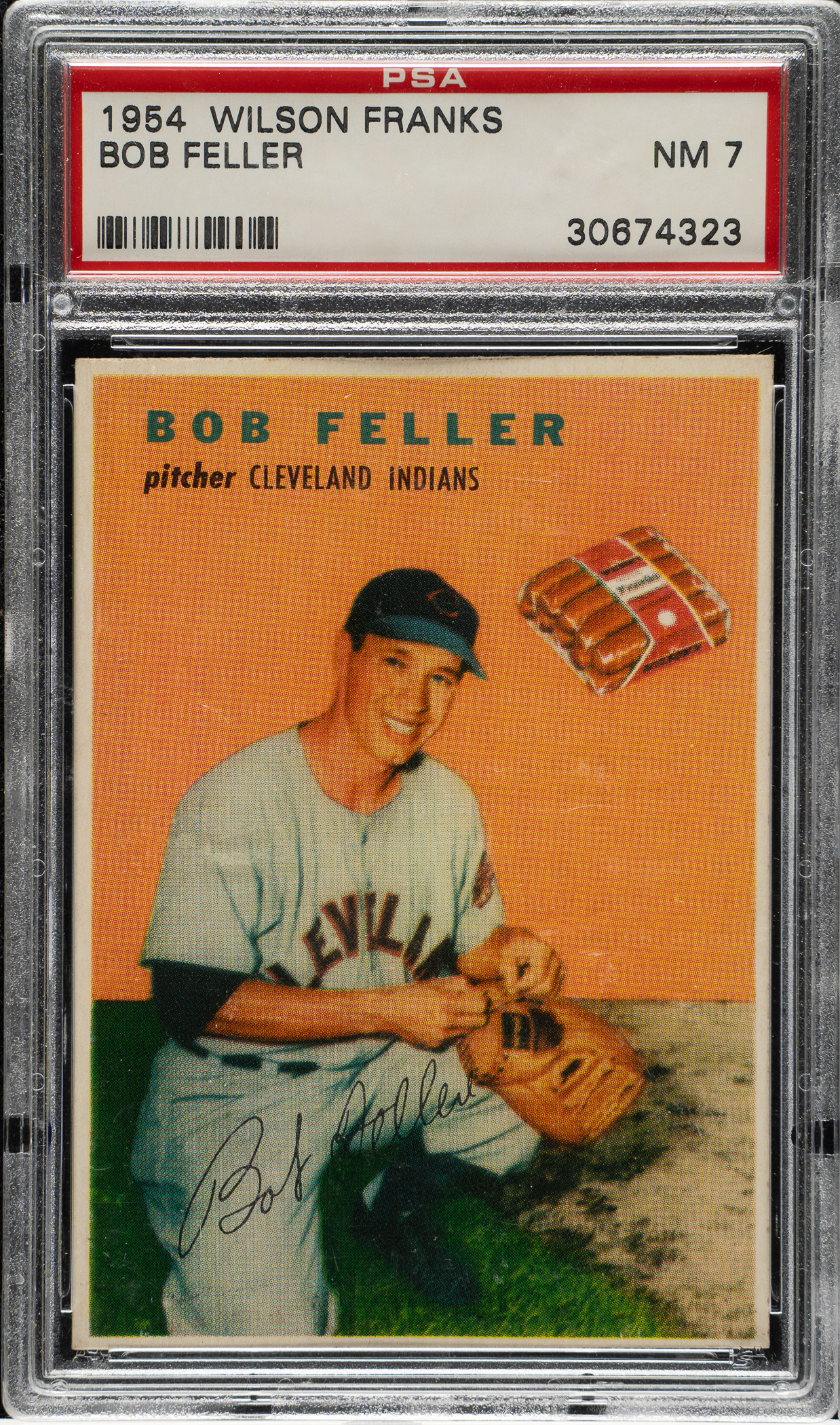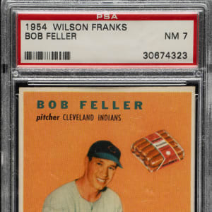 Graded NM 7 by PSA. Outstanding high-grade example of Cleveland Indians Hall of Famer Bob Feller from the very popular 1954 Wilson Franks set. The Wilson Franks set is one of the most attractive and desirable of all 1950s food issues. This card has vibrant colors, a crisp image, and strong corners. Boldly printed reverse. A superb high-grade example of one of the most sought-after of all Bob Feller cards, worthy of the finest Cleveland Indians collection or Wilson Franks set.