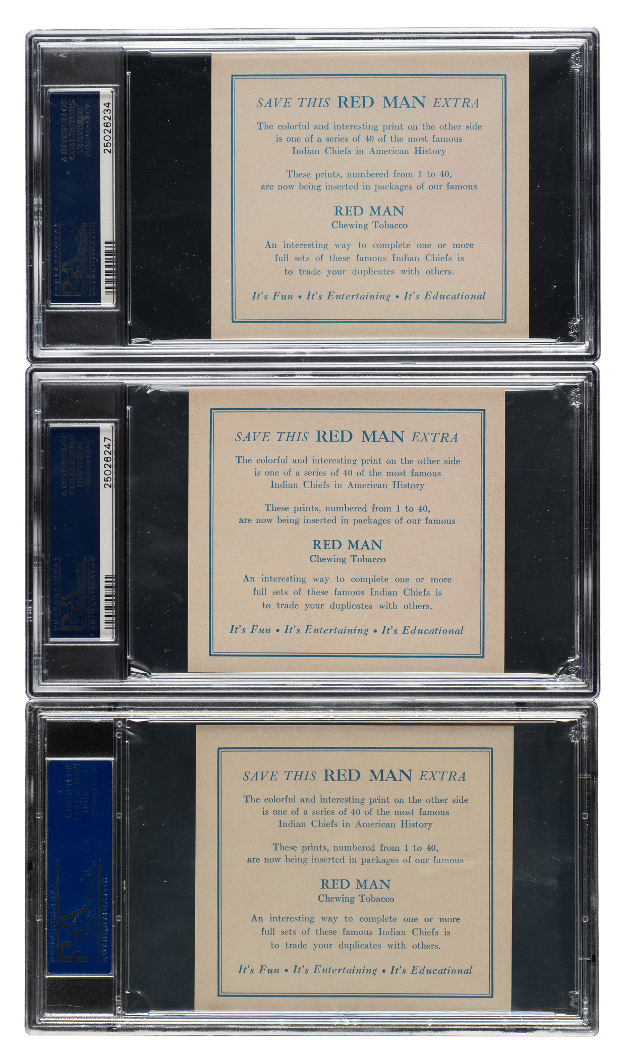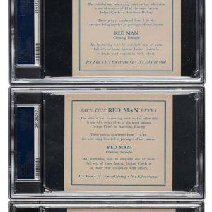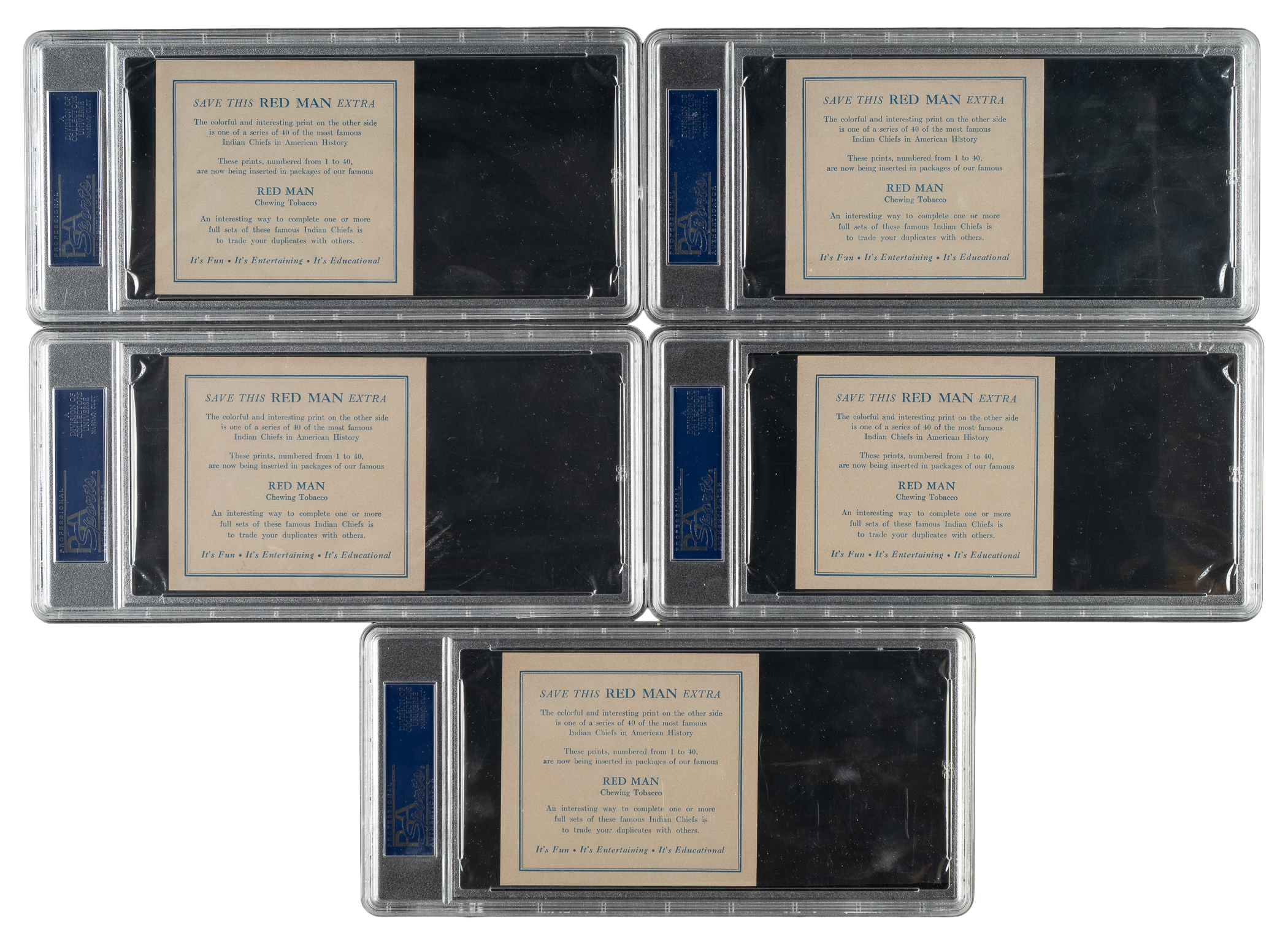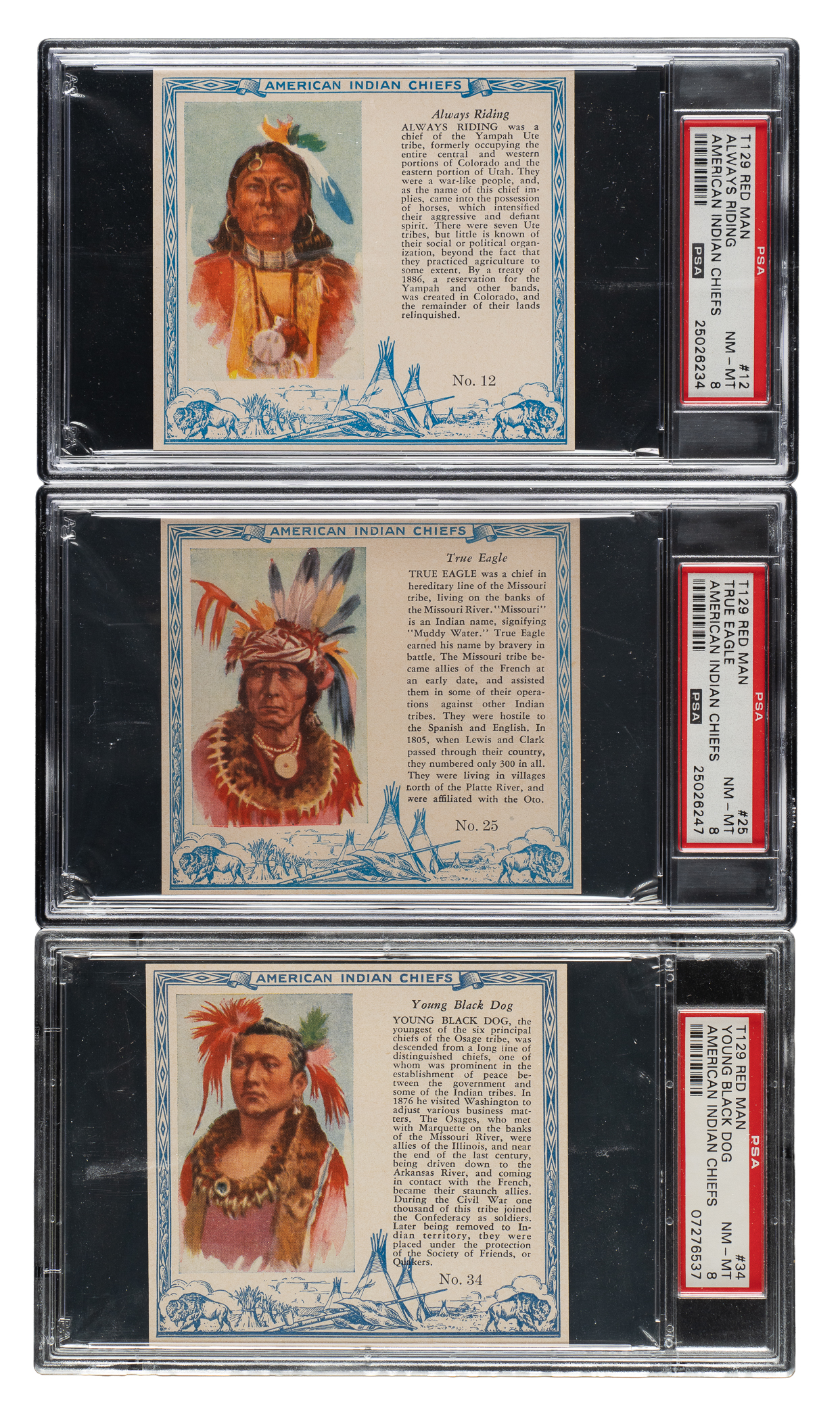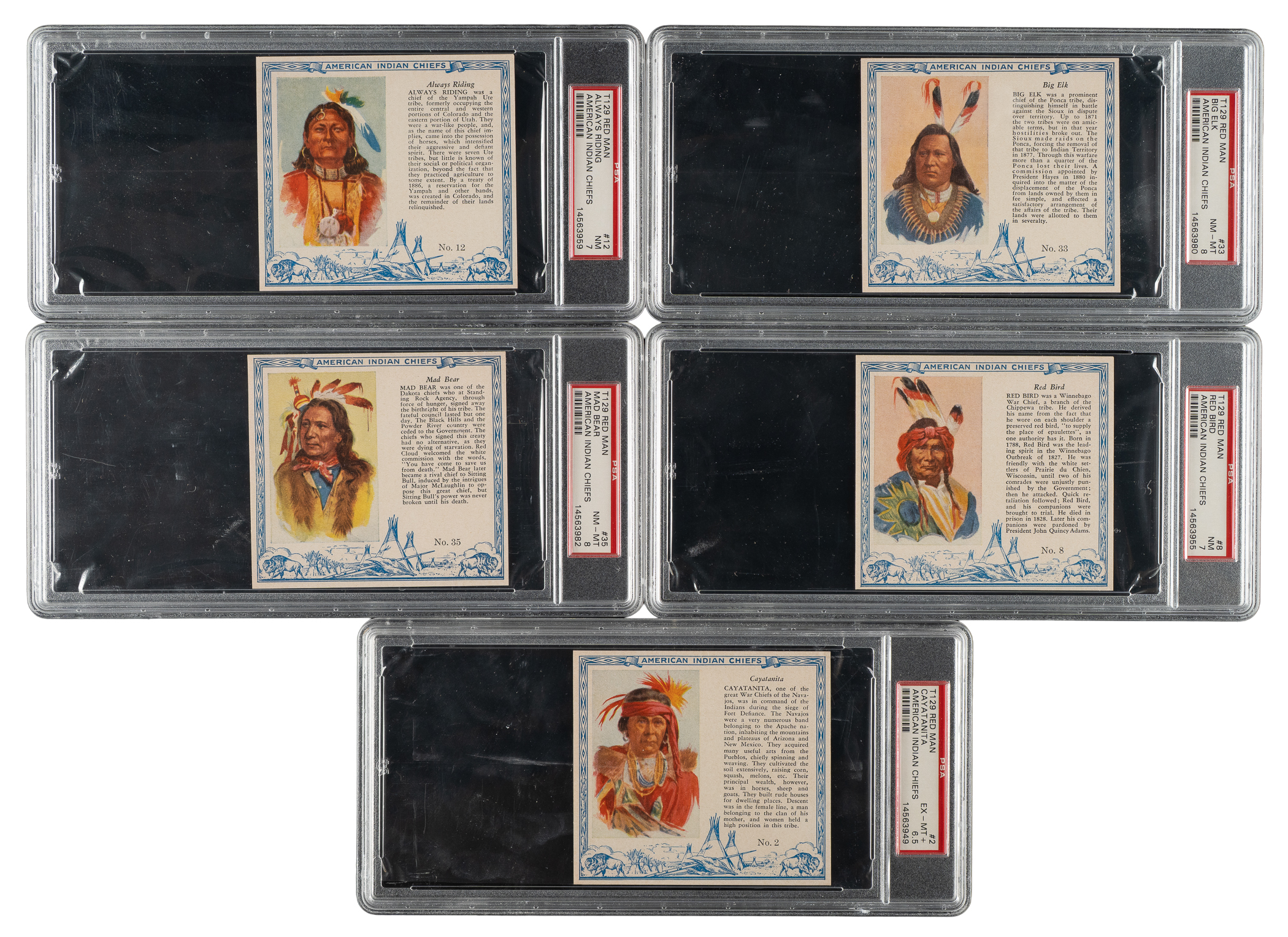 Presented is a collection of eight "American Indian Chiefs" cards issued by the Red Man Tobacco Co. in 1954, each professionally graded and encapsulated by PSA. This colorful series uses similar artwork that appears on the N2 Allen & Ginter American Indian Chiefs series issued in 1888 and features many of the most legendary American Indian Chiefs. This collection consists of the following: NM-MT 8 (5 cards): #12, 25, 33, 34, and 35. NM 7 (2 cards): #8 and 12. EX-MT+ 6.5 (1 card): #2. Total: 8 cards.