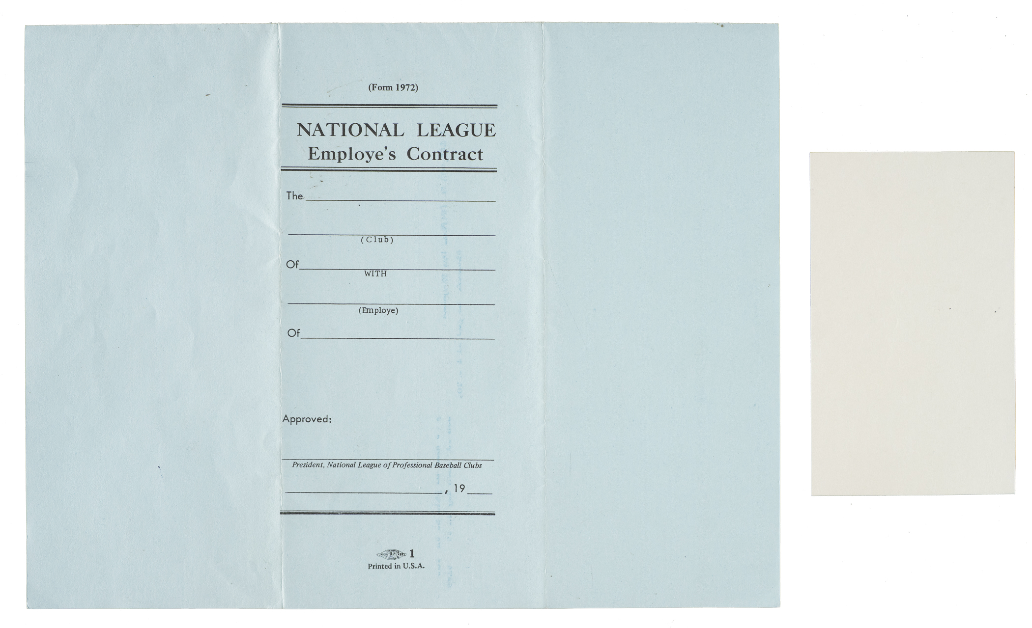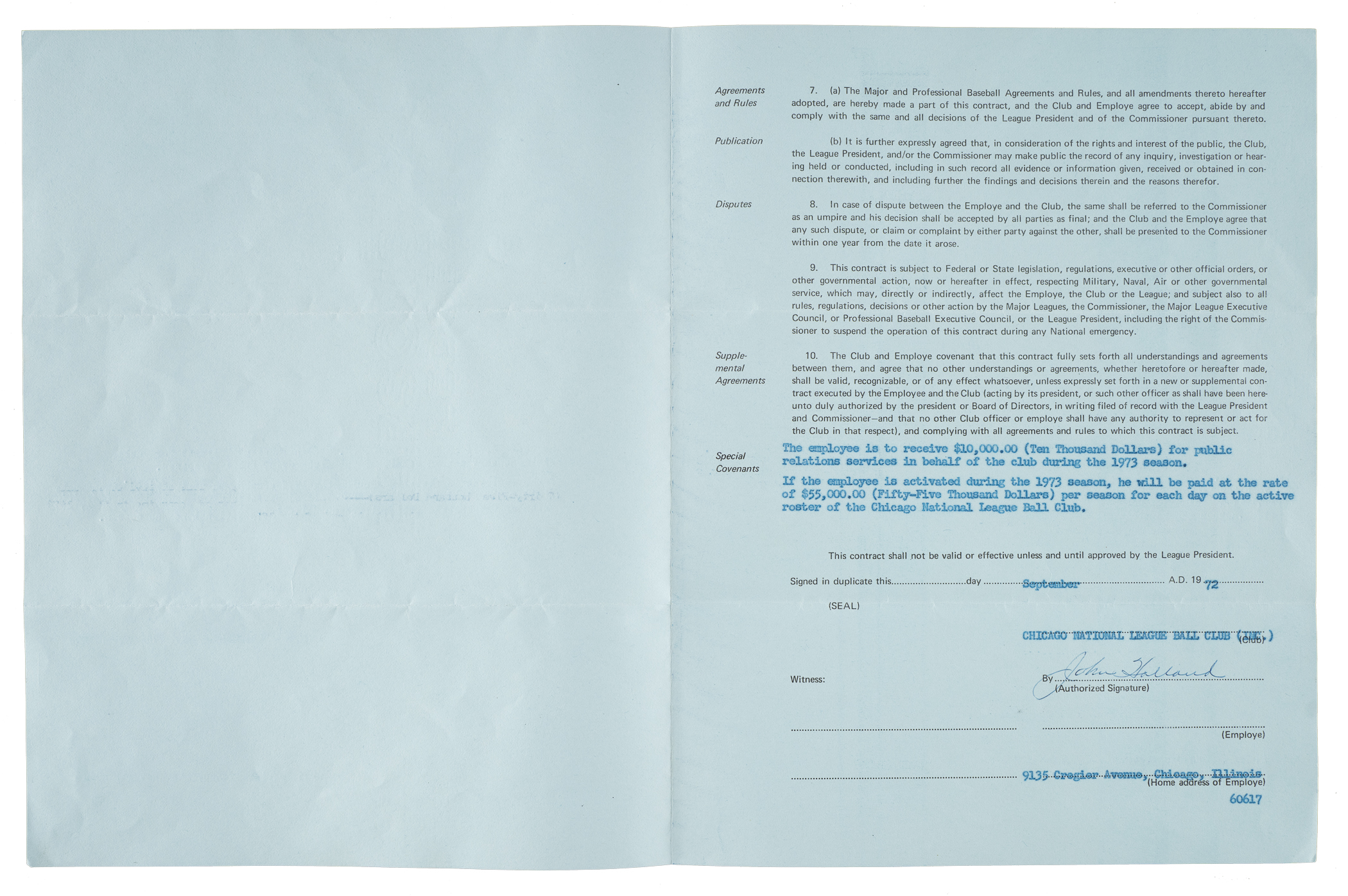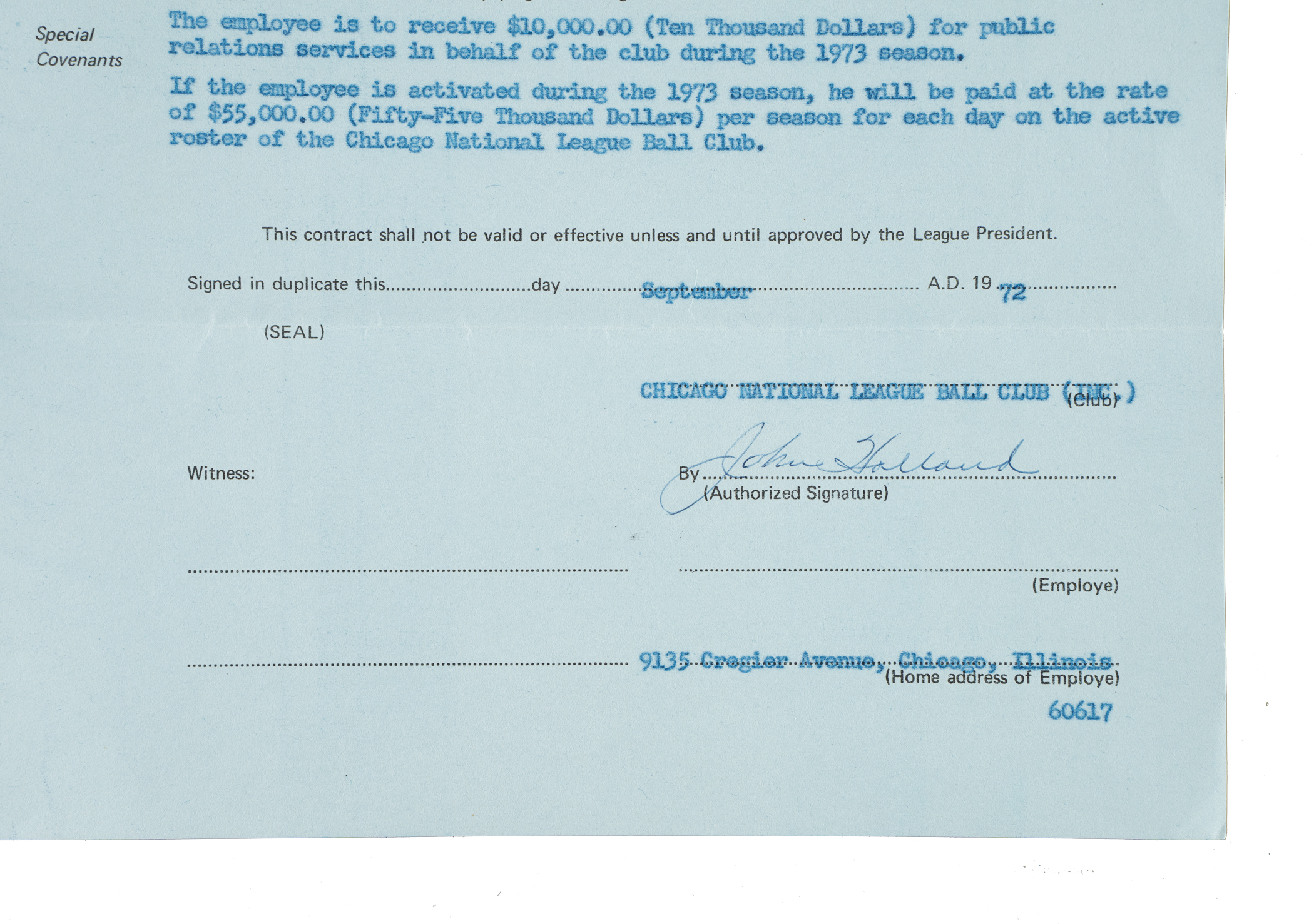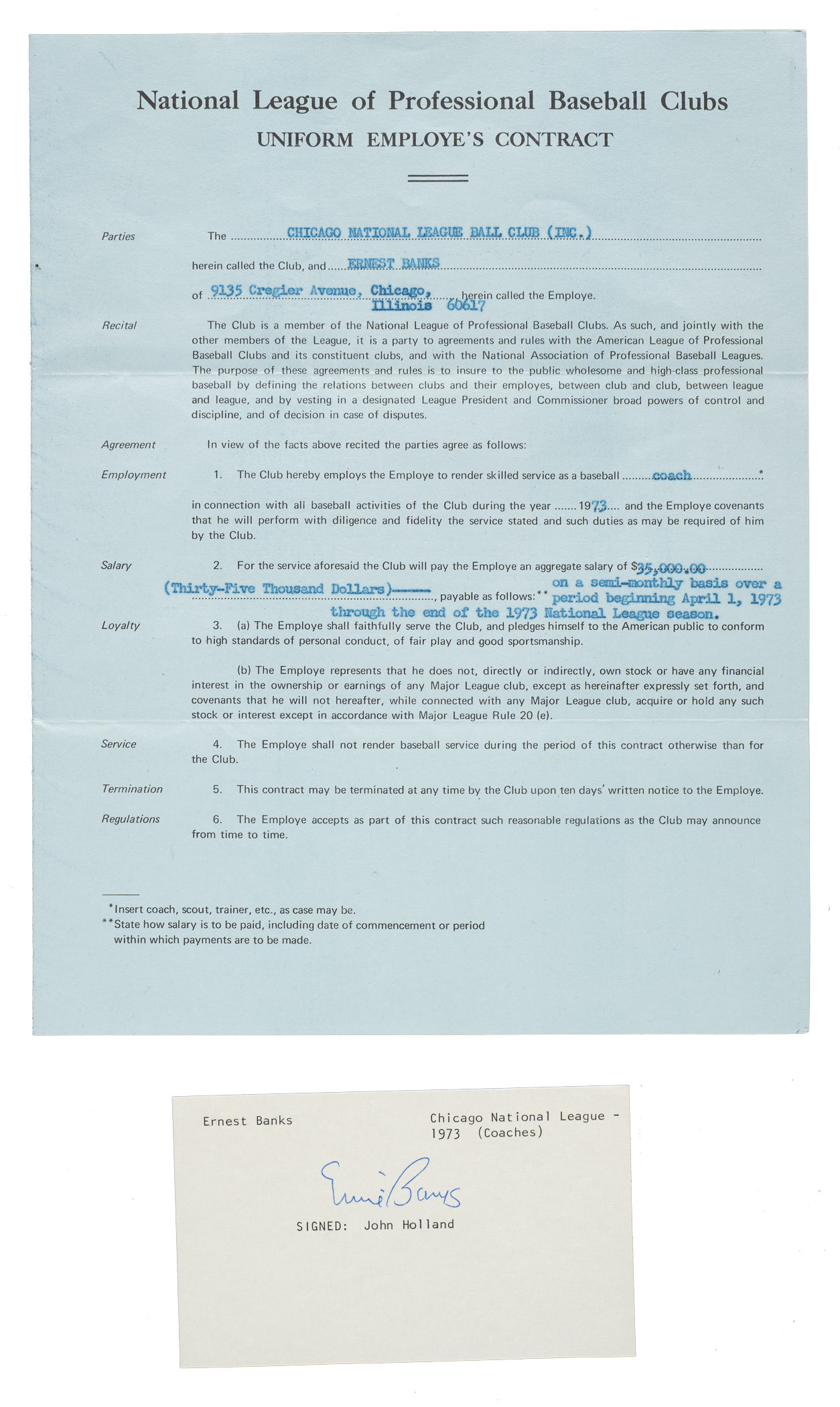 Official "Uniform Employe's (sic) Contract" dated February 11, 1943, between Ernie Banks and the Chicago National League Ball Club. Signed in blue fountain pen by team general manager "John Holland." The four-page agreement calls for Banks to receive a salary of $35,000 as a coach for the 1973 season. Banks served as the club's first base coach during the Cubs' 1973 campaign. The contract (8.5 x 11 inches) displays two horizontal folds and is in Excellent condition overall. Auction LOA from James Spence/JSA.