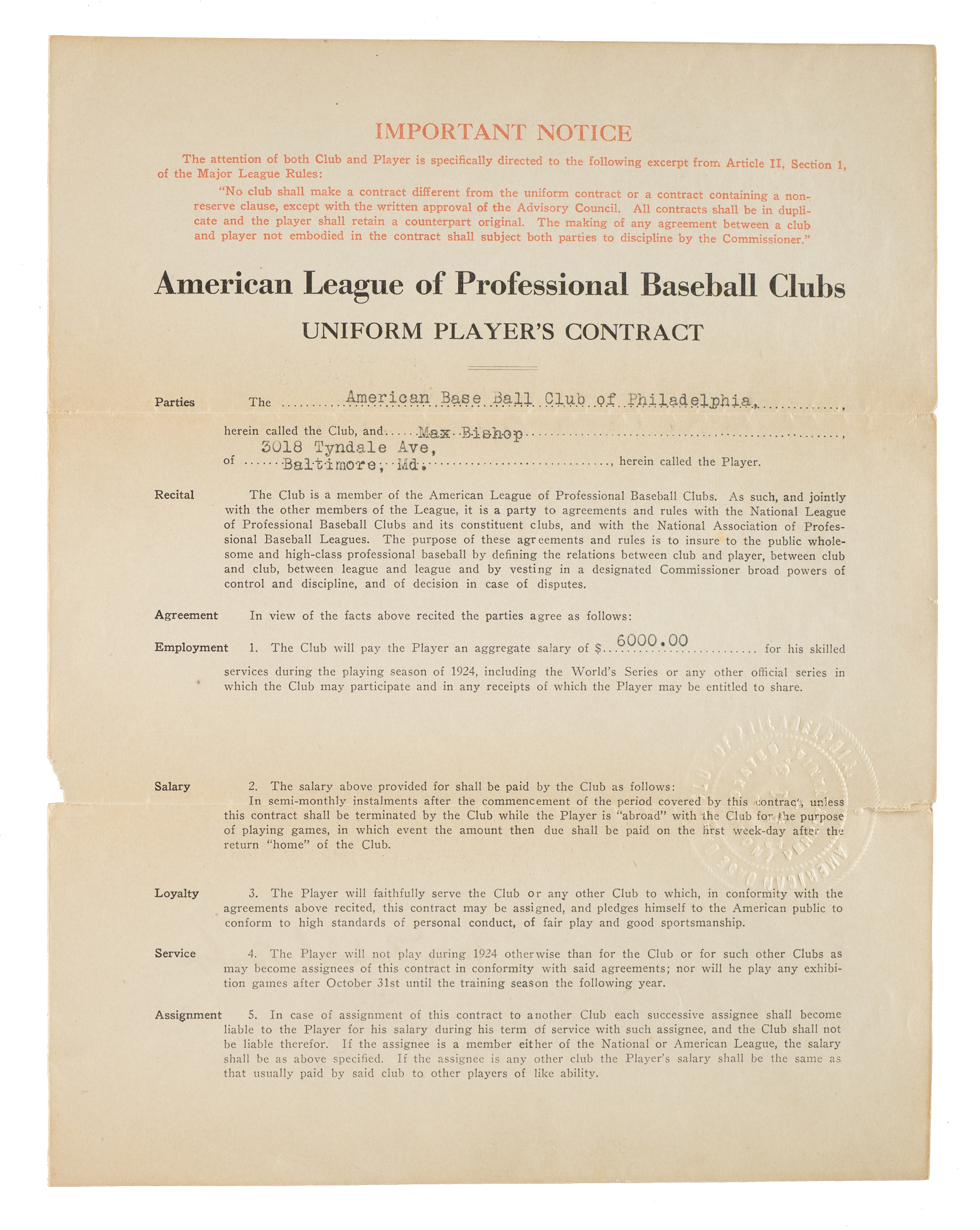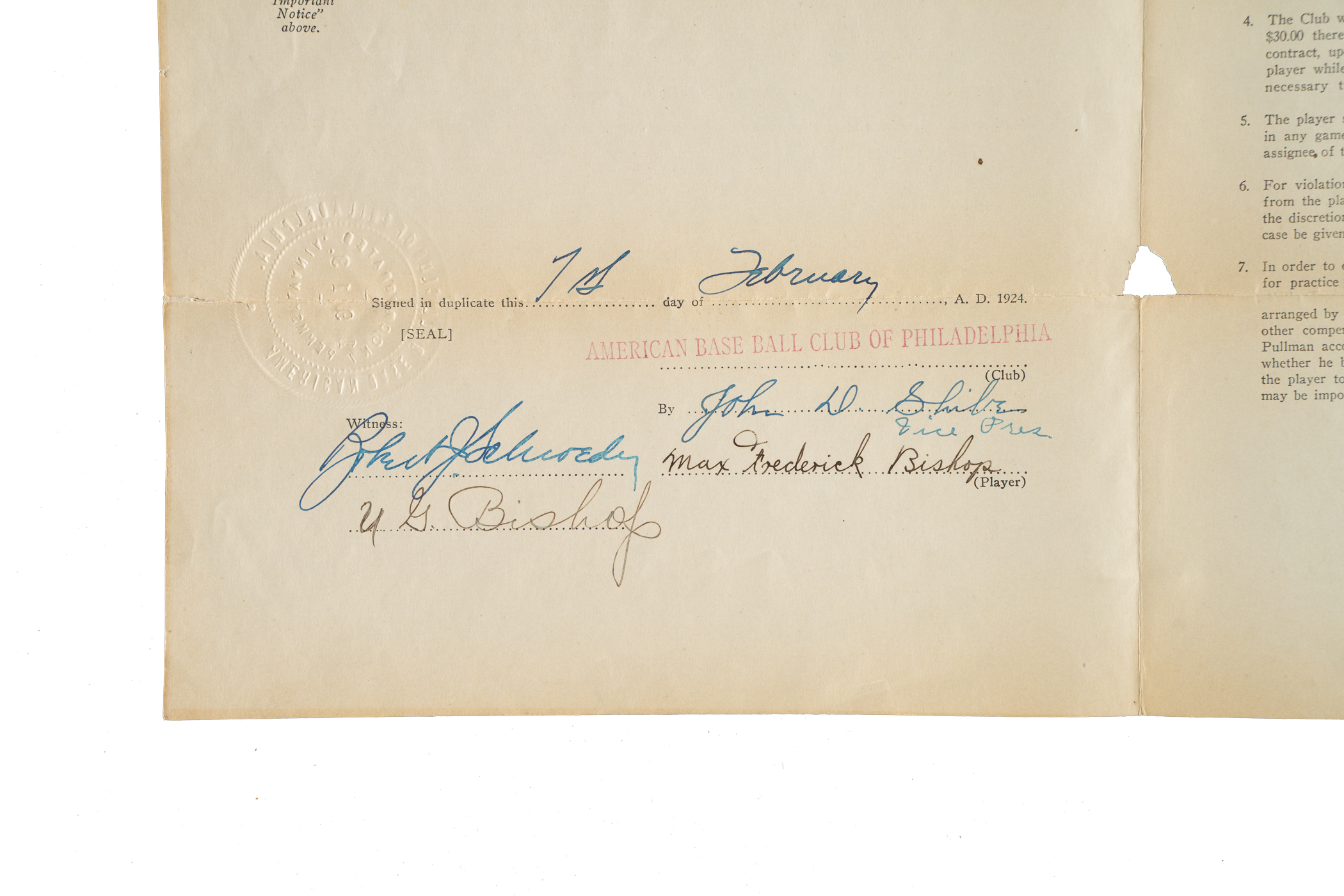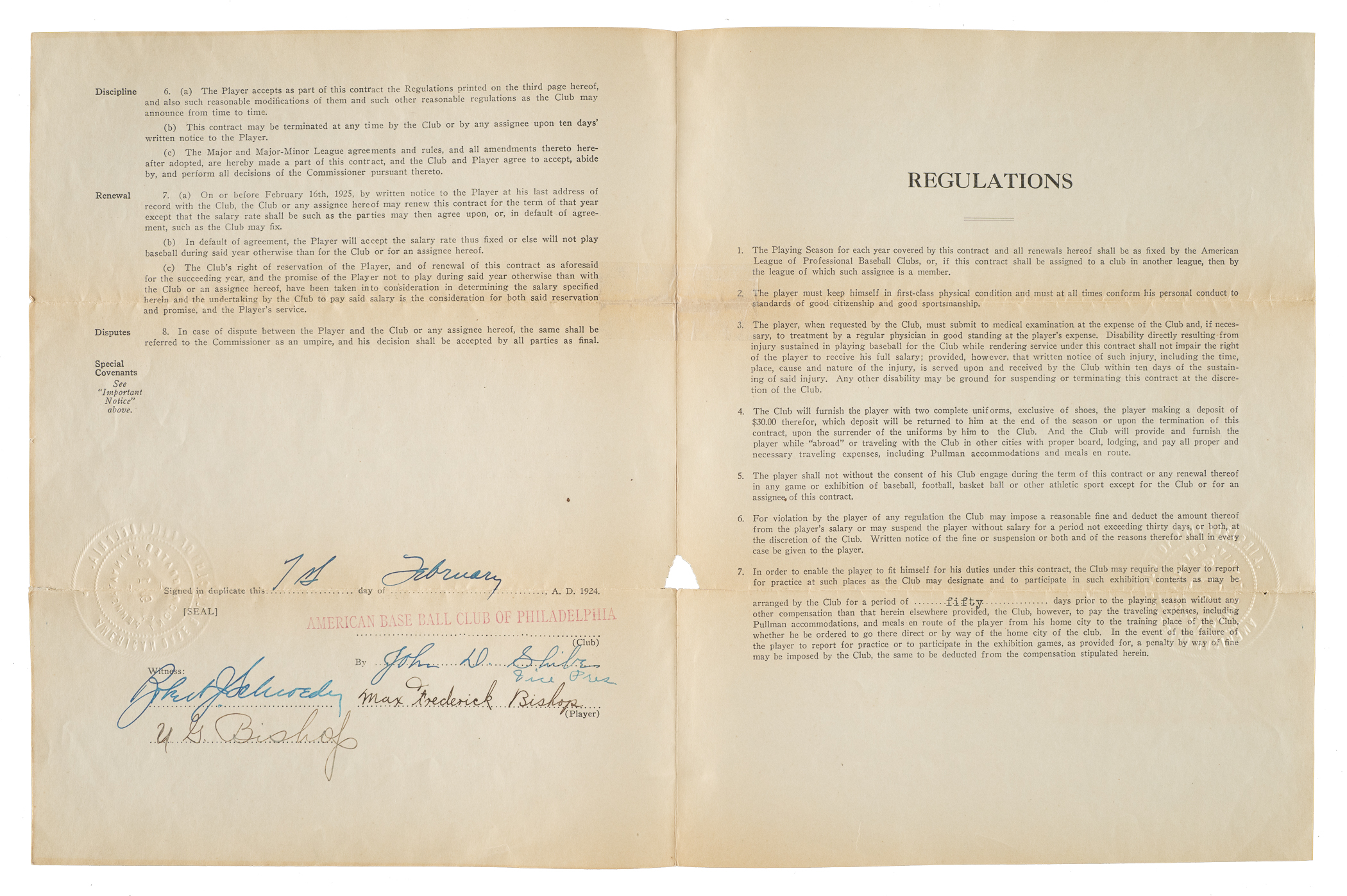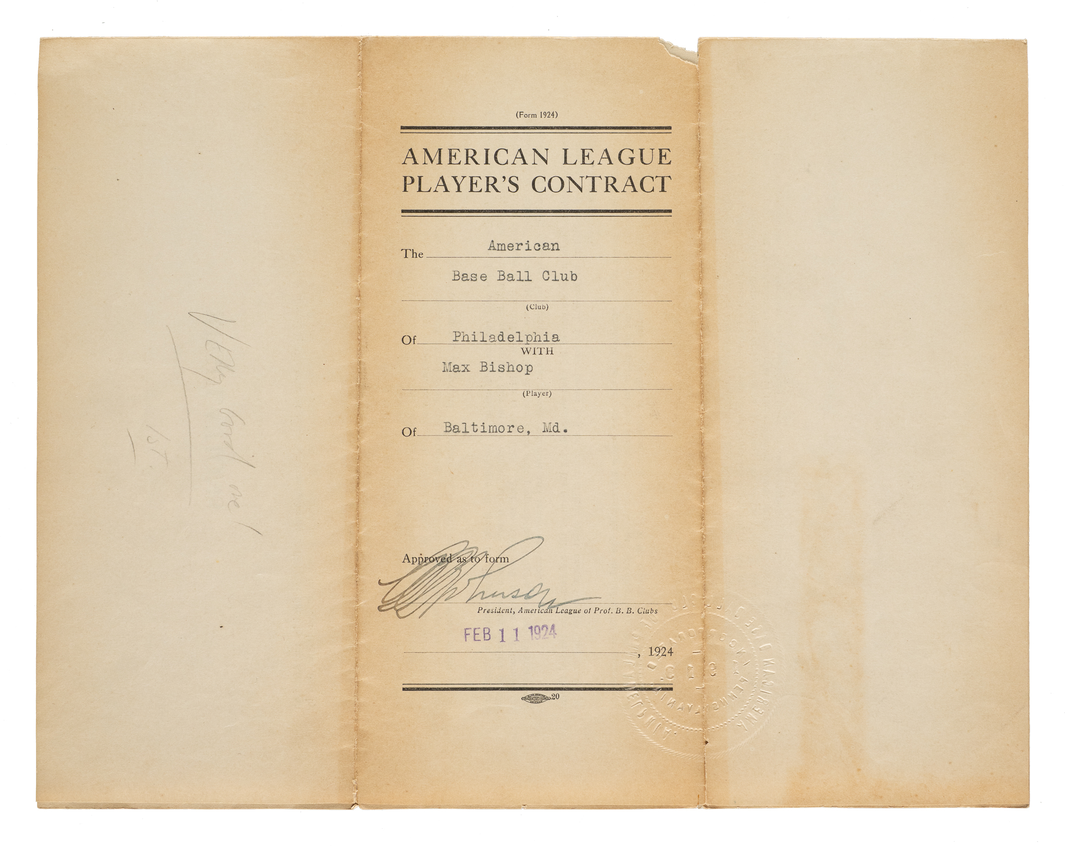 Official "Uniform Player's Contract" dated February 7, 1924, between Max Bishop and the Philadelphia American League Ball Club. Signed on the interior in blue and black fountain pen by "Max Frederick Bishop," "John D. Shibe" as vice president, and a pair of witnesses. Also signed on the front in black fountain pen by "B. B. Johnson" as American League President. The four-page agreement calls for Bishop to receive a salary of $6,000 for the 1924 season. This is Max Bishop's rookie contract. Bishop played six years of minor league ball before Connie Mack purchased his contract from the Baltimore Orioles of the International League at the end of the 1923 season. Over the next decade, Bishop anchored second base and handled leadoff duties for the Athletics, a stretch that saw the team win three American League pennants and two World Championships. Nicknamed “Camera Eye” for his elite ability to draw walks and get on base, Bishop finished his 12-year career with a .423 on-base percentage (15th on the all-time list). The contract (8.5 x 11 inches) displays two horizontal folds, along the ends of which there are a few small tears. A few pencil notations and light toning appear on the front. In Good condition. Auction LOA from James Spence/JSA.