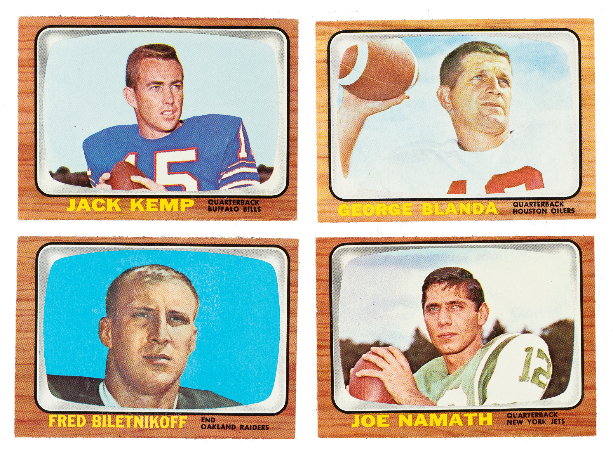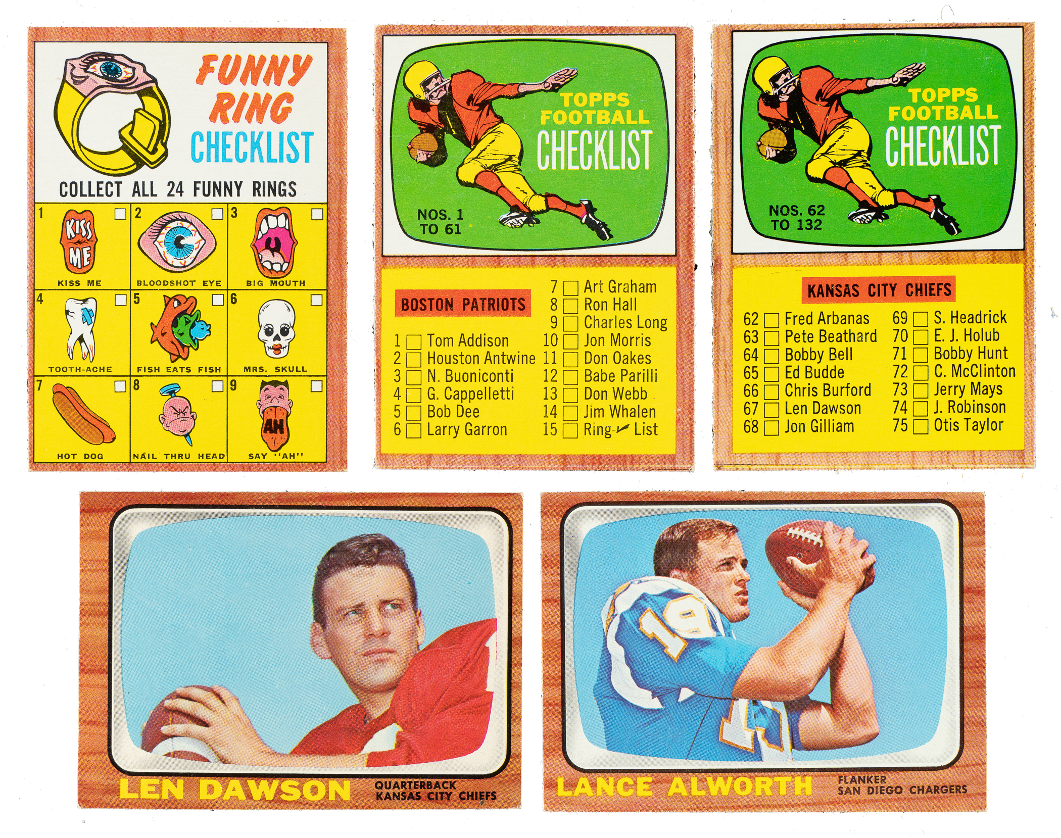 Complete 132-card set of 1966 Topps football, highlighted by Hall of Famers Joe Namath, George Blanda, Fred Biletnikoff, and Len Dawson. The condition is 34% Ex-Mt to Nr/Mt and 66% Vg-Ex to Ex (including a couple Vg). Keys: #15 Funny Ring Checklist (Ex), 26 Kemp (Vg-Ex), 48 Blanda (Ex-Mt), 61 Checklist (Ex), 67 Dawson (Vg), 96 Namath (Ex), 104 Biletnikoff (Ex-Mt), 119 Alworth (Ex), and 132 Checklist (Ex due to centering). Very attractive complete 1960s Topps football set, including many Hall of Famers and stars of the era. Total: 132 cards.