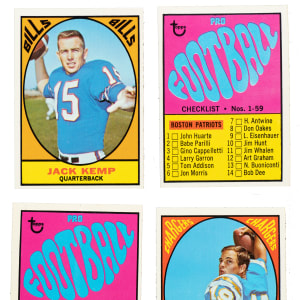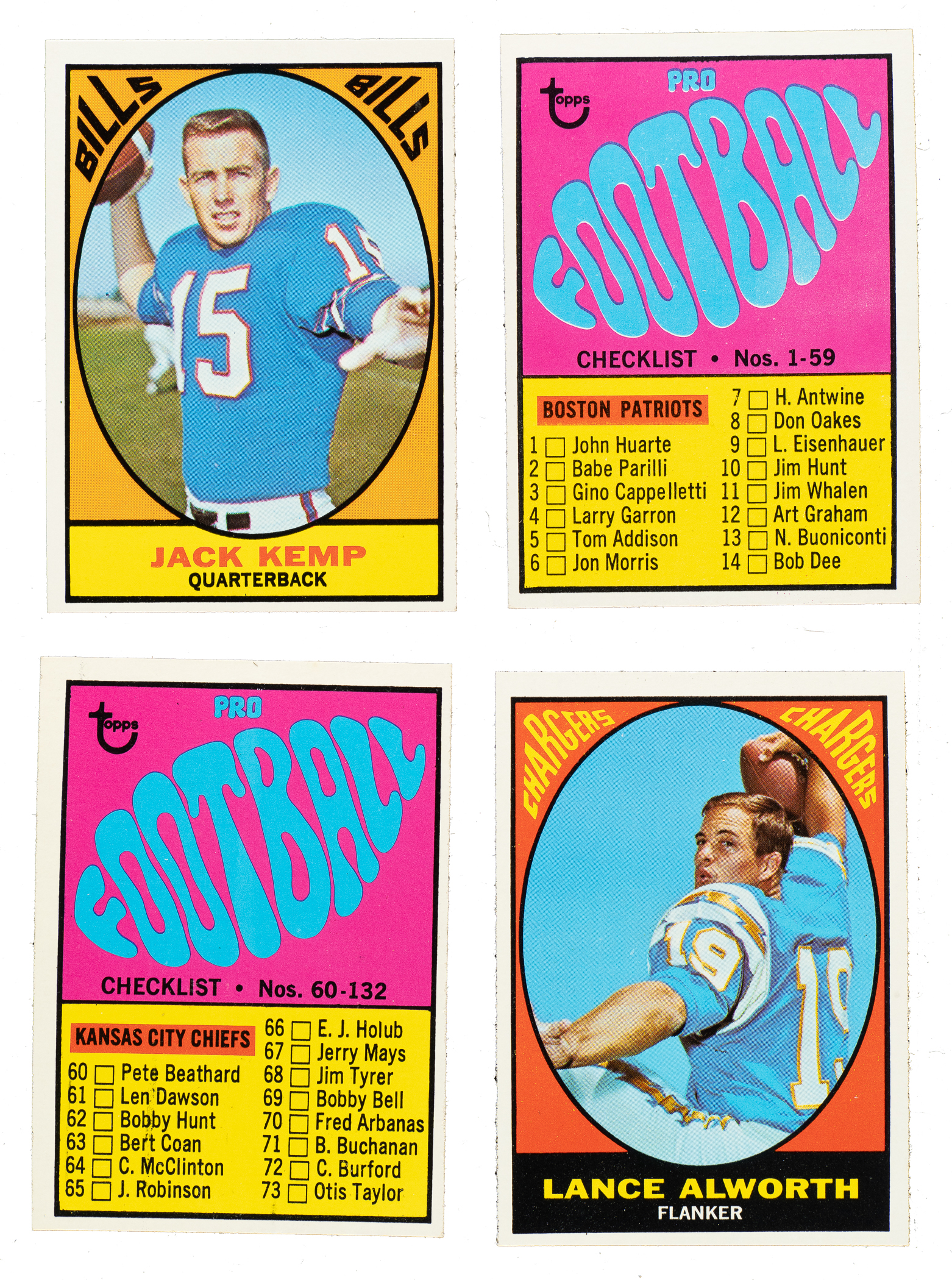 Complete 132-card set of 1967 Topps football. This classic set features all the AFL stars of the era, including Hall of Famers Len Dawson, Joe Namath, Fred Biletnikoff, and Lance Alworth, and stars such as Jack Kemp and Wahoo McDaniel. The condition is 66% Nr/Mt to Nr/Mt-Mt and 34% Ex to Ex-Mt (including a couple lesser and some due solely to centering). Keys: #24 Kemp (70/30 T/B, otherwise Nr/Mt+), 59 Checklist (Nr/Mt due mostly to centering), 61 Dawson (75/25 L/R, otherwise Nr/Mt), 82 McDaniel RC (70/30 T/B, otherwise Nr/Mt-Mt), 98 Namath (70/30 L/R, otherwise Nr/Mt), 106 Biletnikoff (Nr/Mt), 123 Alworth (65/35 T/B, otherwise Nr/Mt-Mt+), and 132 Checklist (75/25 L/R, otherwise Nr/Mt). Outstanding high-grade complete 1960s Topps football set, including many Hall of Famers and stars of the era. Total: 132 cards.