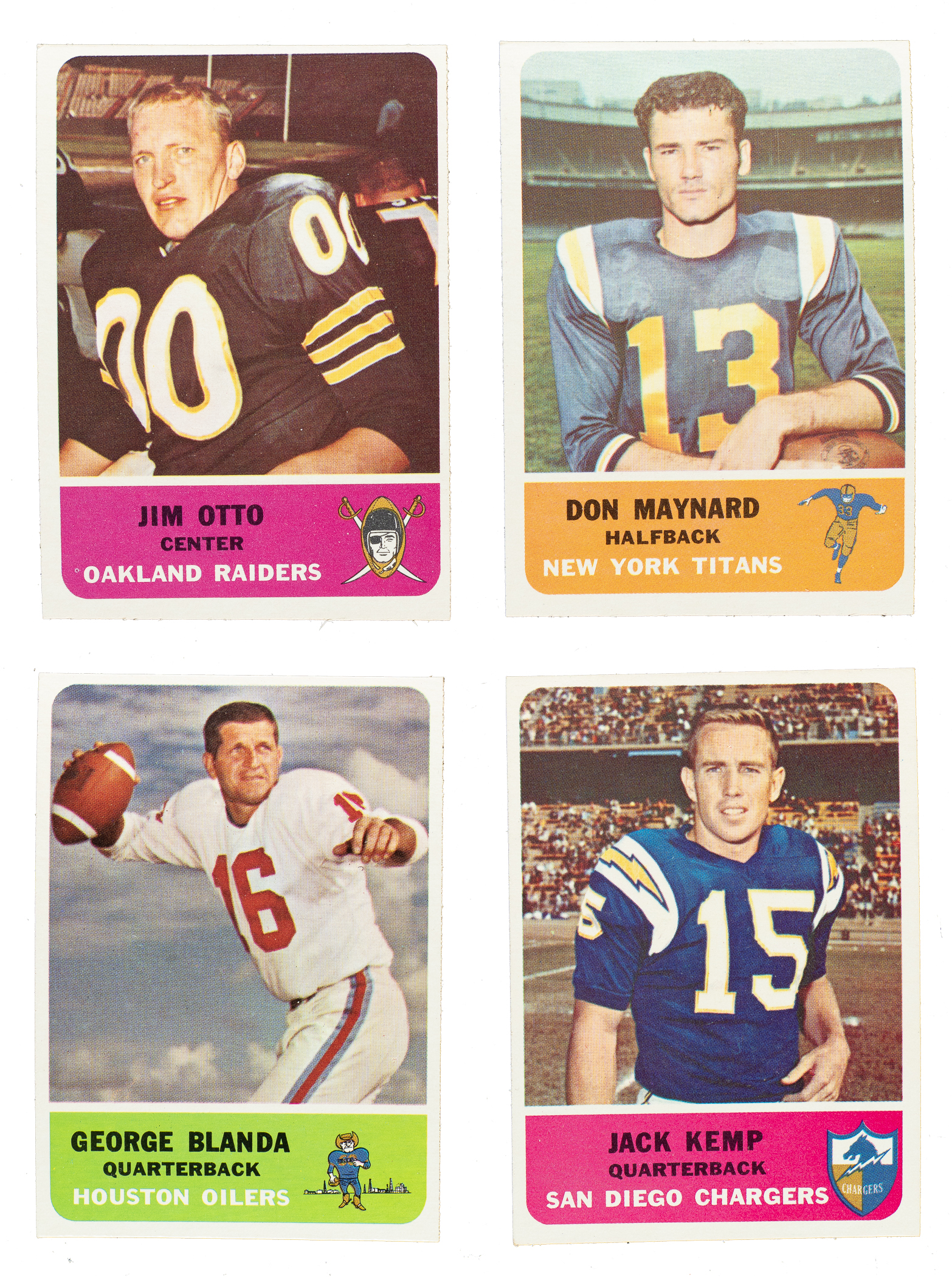 Presented is a complete set of 1962 Fleer football cards. Fleer issued four football sets during the early 1960s in an effort to compete with Topps' established efforts in the sport. The 1962 set consists of eighty-eight cards featuring AFL players and is highlighted by Hall of Famers Billy Shaw (rookie card), George Blanda, Don Maynard, Jim Otto, and Ron Mix as well as non-Hall of Fame rookie cards of Gino Cappelletti and Ernie Ladd. The Fleer sets are far rarer than their Topps counterparts from the same era. The condition is 34% Nr/Mt (including a few Nr/Mt-Mt) and 66% Ex to Ex-Mt (including a couple slightly lesser and a couple with a slight miscut). Keys: #3 Cappelletti RC (Nr/Mt), 16 Shaw RC (Ex due to centering), 46 Blanda (Ex-Mt), 59 Maynard (25/75 T/B, otherwise Ex-Mt+), 72 Otto (Ex), 79 Kemp (Nr/Mt), 82 Mix (Ex due to centering), and 86 Ladd RC (Ex due to centering). Extremely attractive mid- to high-grade complete 1960s Fleer football set, including many Hall of Famers and stars of the era. Total: 88 cards.