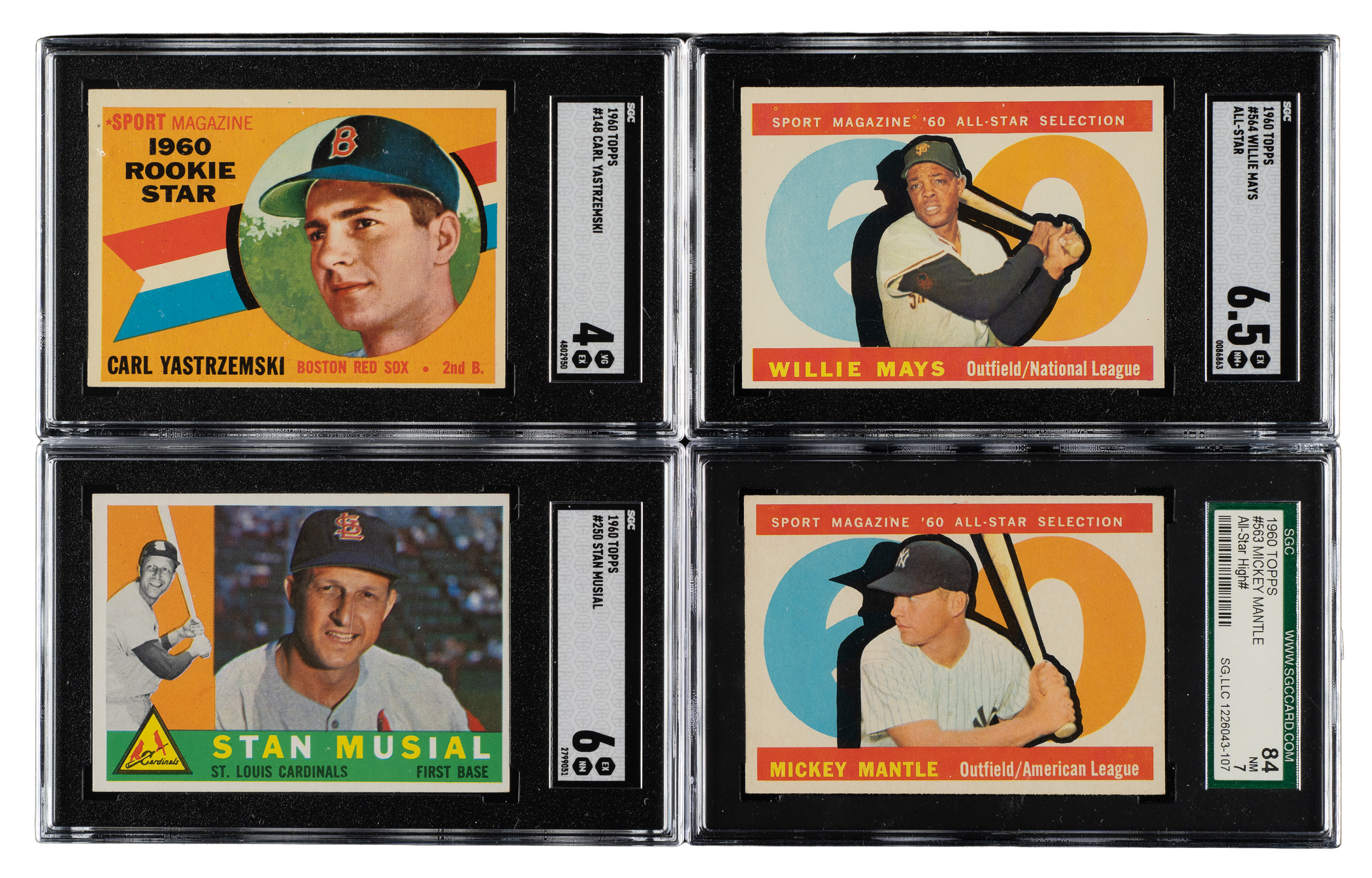 Presented is a complete set of 1960 Topps baseball, which was Topps' last horizontal issue, highlighted by the rookie cards of Hall of Famers Carl Yastrzemski and Willie McCovey. Many of the biggest stars in the set, including Mantle, Mays, and Aaron, appear in the set more than once due to the All-Star card series. Mantle has three cards in this set, as he also appears on the #160 "Rival All-Stars" card with Ken Boyer. Condition is 29% Ex-Mt to Nr/Mt and 71% Vg-Ex to Ex (including 2% lesser and a couple with a slight miscut). Eight cards have been professionally graded and encapsulated by SGC (7) and PSA (1). Keys: #1 Wynn (Ex), 10 Banks (Ex), 28 B. Robinson (Ex), 35 Ford (Vg-Ex), 50 Kaline (Vg-Ex), 73 Gibson (Vg-Ex+), 136 Kaat RC (Ex), 148 Yastrzemski RC (VG/EX 4), 160 Mantle/Boyer (Vg-Ex+), 200 Mays (NM 7), 210 Killebrew (Ex), 250 Musial (EX/NM 6), 300 Aaron (15/85 T/B, otherwise Ex+), 316 McCovey RC (EX 5), 326 Clemente (Ex), 332 Yankees Team (Vg-Ex+), 343 Koufax (SGC NM 84), 350 Mantle (PSA NM 7), 377 Maris (Ex), 420 Mathews (Ex), 445 Spahn (Ex), 475 Drysdale (Ex+), 480 Berra (Vg-Ex), 490 F. Robinson (Ex+), 493 Snider (Ex), 554 McCovey AS (Ex), 560 Banks AS (Vg-Ex+), 563 Mantle AS (SGC NM 84), 564 Mays AS (EX/NM+ 6.5), 565 Maris AS (Ex+), and 566 Aaron AS (Vg). This is a highly attractive mid- to high-grade complete set which, in addition to all the special cards and scarce high numbers (#507-572), is loaded with Hall of Famers and stars from the 1960s. Total: 572 cards.