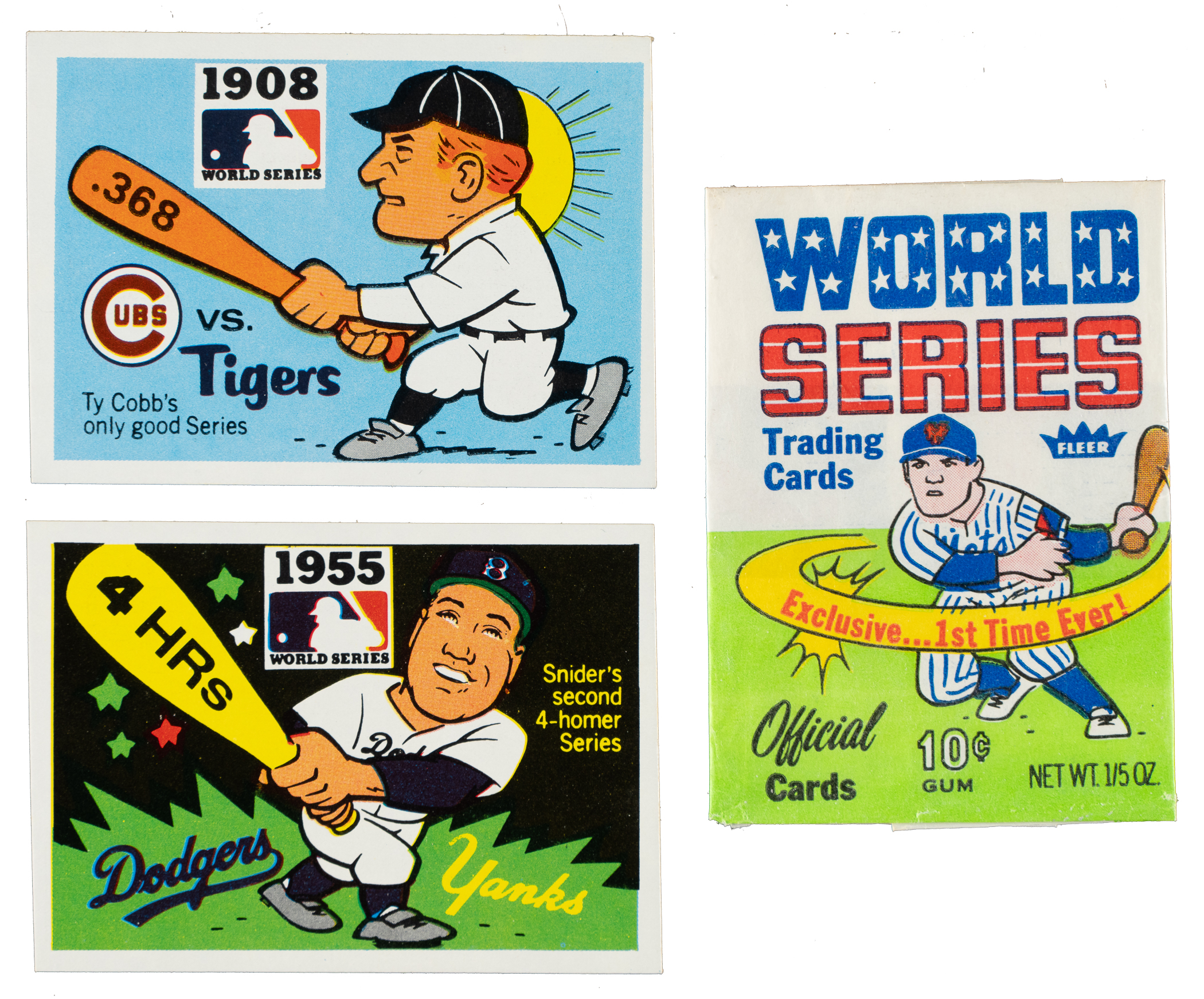 Presented is a very attractive pair of 1970 and 1971 Fleer "World Series" complete sets. The 1970 set consists of 66 cards covering the 1903 through 1969 World Series (excluding 1904, when the World Series was canceled) with artwork by R.G. Laughlin. The 1971 set consists of 68 cards, offering new artwork and two additional cards covering the 1904 cancellation ("No Series") and the 1970 World Series. Included is an original 1970 wrapper (Vg). 1) 1970 Complete Set (66 cards): The cards in this set display considerable size variance, with many falling markedly short of the 2.5 x 3.5 inches catalog standard. Without further reference to card size, condition ranges from Vg to Ex (averaging Vg-Ex), with a couple Ex-Mt. 2) 1971 Complete Set (68 cards): Ranging from Vg-Ex to Nr/Mt (averaging Ex/Ex-Mt), with all cards displaying a slight "diamond" cut. This is a very attractive pair of 1970s Fleer "World Series" sets with outstanding eye appeal. Total: 134 cards plus wrapper.