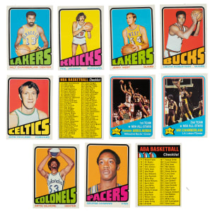 Outstanding mid- to high-grade complete set of 1972-1973 Topps basketball cards, consisting of 264 different cards. The 1972-1973 Topps set is very popular among collectors for its bright colors and funky text, both telltale signs of an early 1970s issue. The set is loaded with stars and Hall of Famers, including Pete Maravich, Wilt Chamberlain, Kareem Abdul-Jabbar, and rookie cards of Julius Erving, Phil Jackson, George McGinnis, and Artis Gilmore. Condition is 37% Nr/Mt to Nr/Mt-Mt, 51% Ex to Ex-Mt, and 12% Vg to Vg-Ex. We have selected four cards for grading and encapsulation by SGC. Keys: #1 Chamberlain (Ex+), 5 Maravich (NM/MT+ 8.5), 25 Robertson (Vg-Ex), 32 Jackson RC (Ex), 75 West (Ex), 100 Abdul-Jabbar (NM 7), 110 Havlicek (Nr/Mt due to centering), 160 Checklist (Vg-Ex+), 163 Abdul-Jabbar AS (Vg-Ex), 168 Chamberlain AS (Vg-Ex), 180 Gilmore RC (Ex-Mt), 183 McGinnis RC (Ex), 195 Erving RC (VG/EX+ 4.5), 248 Checklist (Nr/Mt+), and 255 Erving AS (NM/MT 8). An extremely attractive complete set of this popular 1970s Topps basketball issue, loaded with stars and Hall of Famers. Total: 264 cards.