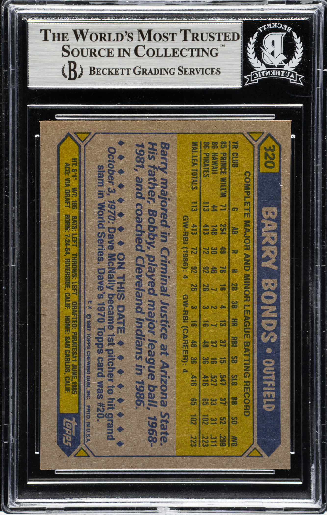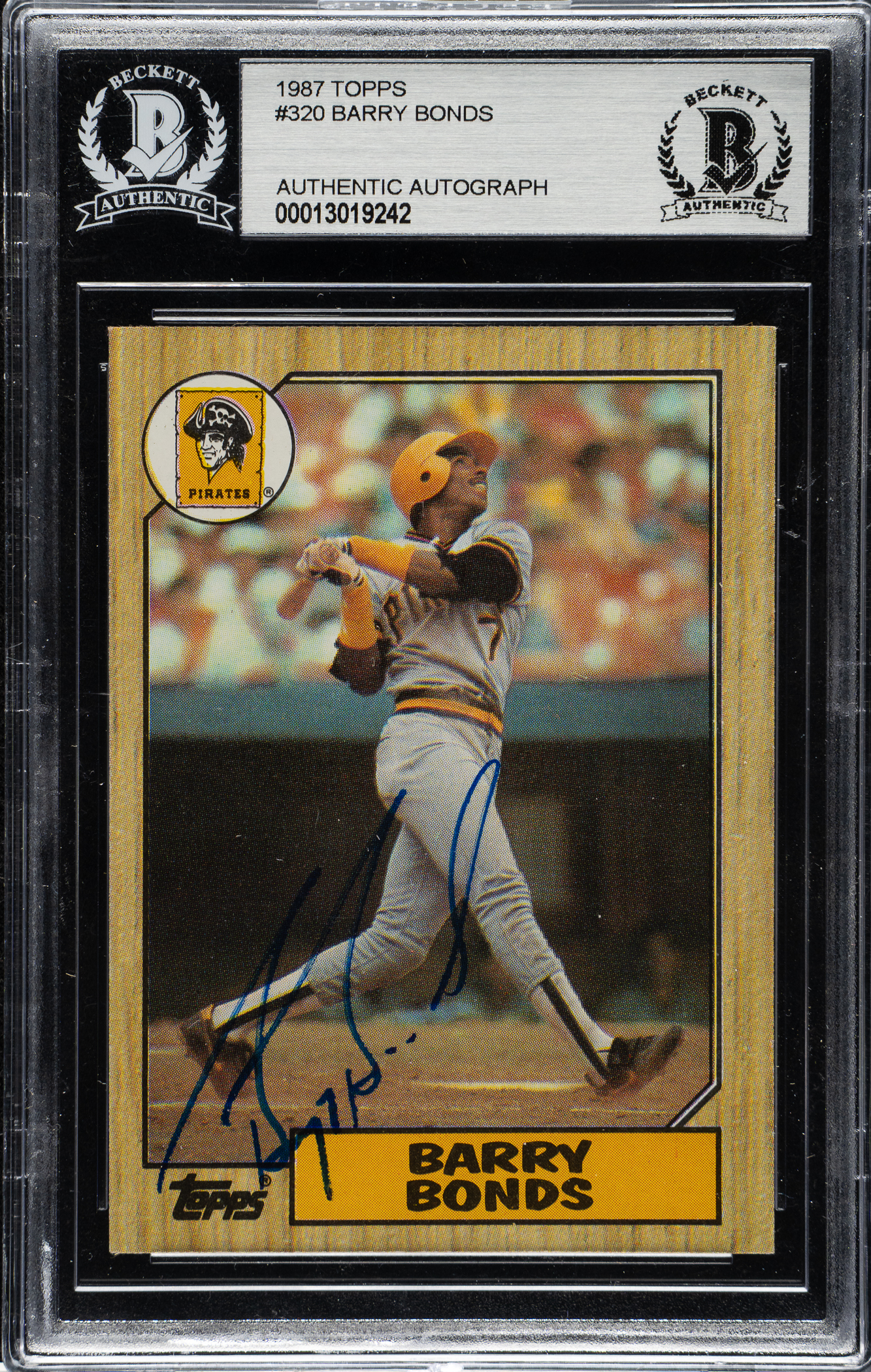 Beckett has encapsulated the card, certifying the signature as "Authentic." Pittsburgh Pirates. This card was signed early in Bonds' career according to our consignor.
