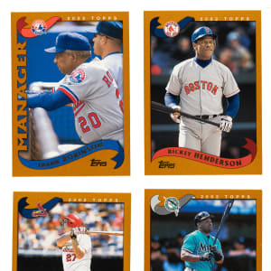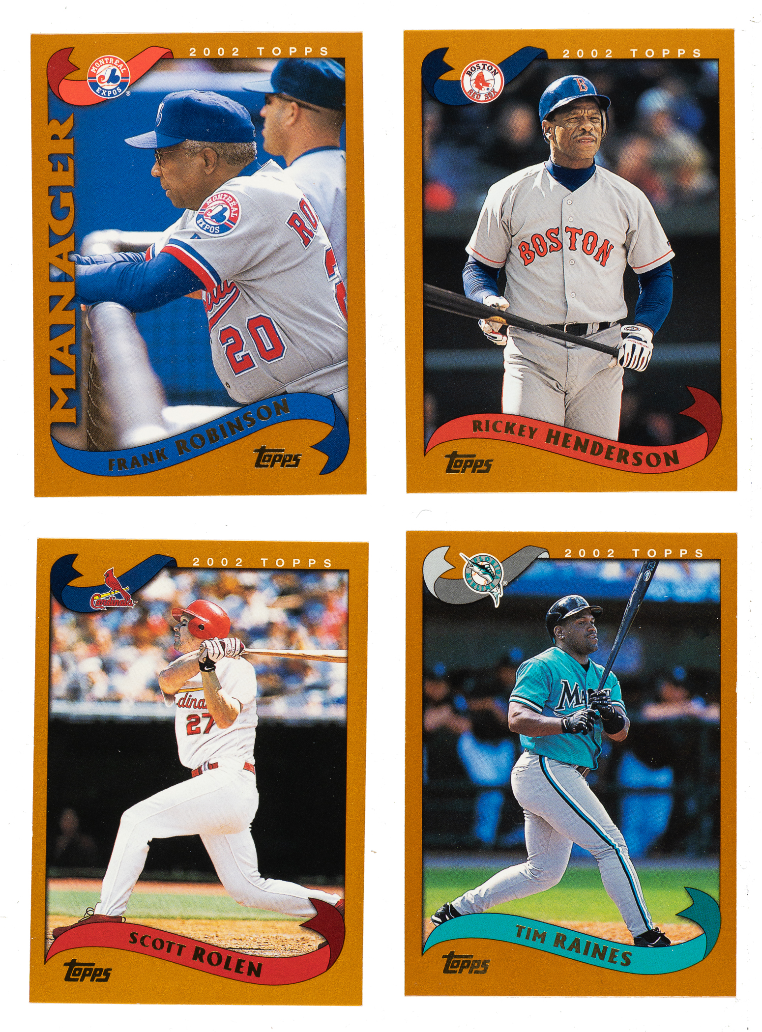 Presented is a complete run of the short-printed "Traded" series (#T1-T110) of the 2002 Topps Traded and Rookies set. Does not include the much easier to acquire "Rookies and Prospects" series (#T111-T275). Condition is Nr/Mt-Mt overall, with a few Mint and 10% slightly lesser. Keys: #T52 Raines (Nr/Mt-Mt), T72 Rolen (Nr/Mt-Mt), T74 Henderson (Nr/Mt-Mt+), and T109 F. Robinson/MGR (Nr/Mt-Mt+). Total: 110 cards.