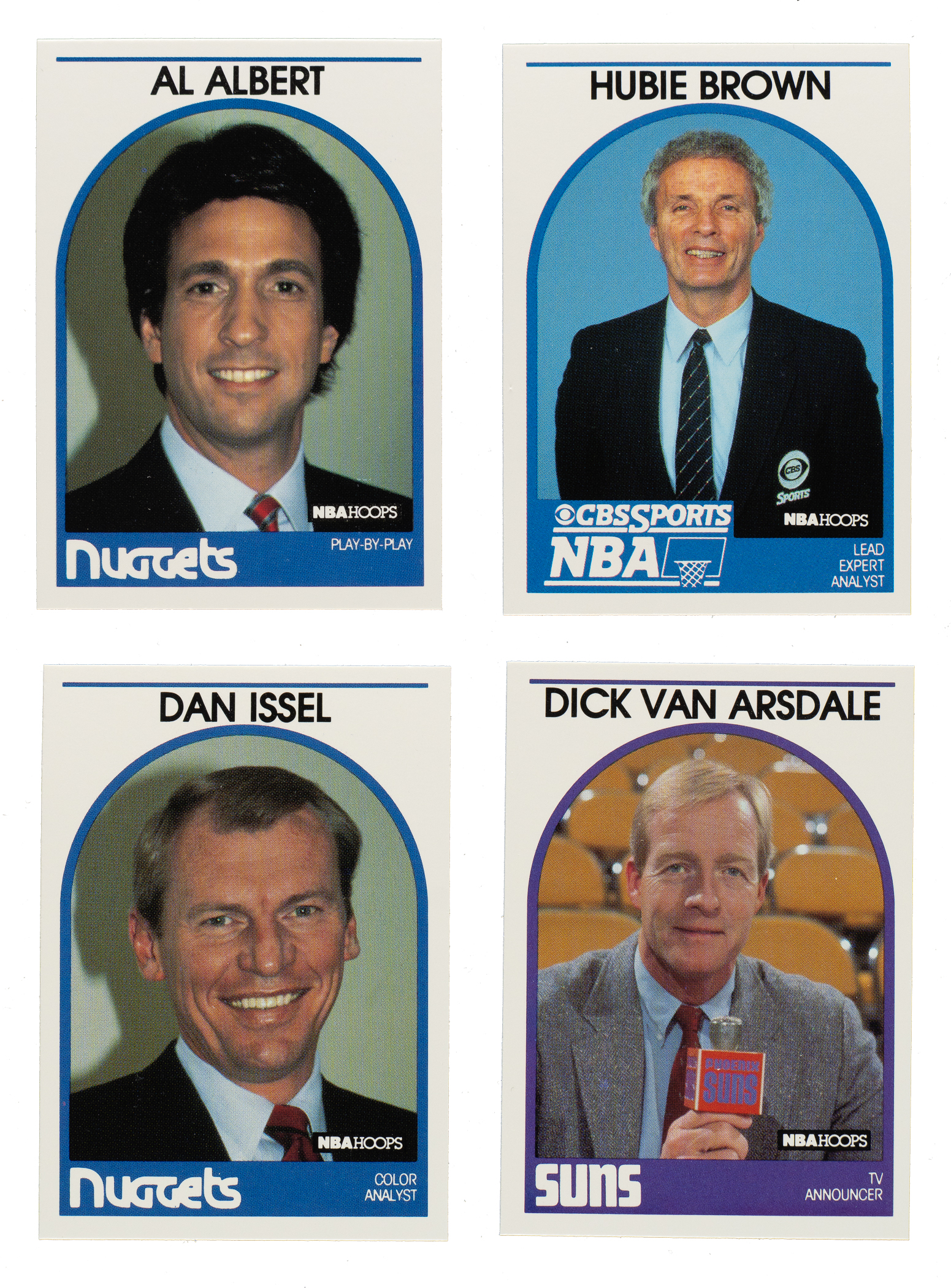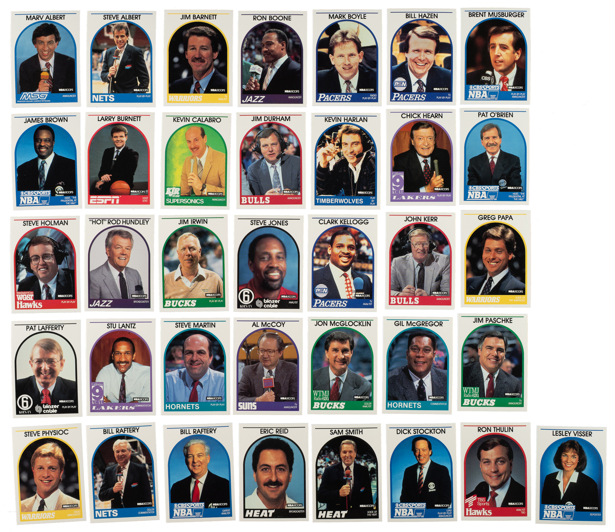 Presented is a near-complete set of 1989-1990 NBA Hoops Basketball Announcers consisting of 40 different cards, out of 44 in the set. Missing only Andariese, Barry, Barry/autograph, and Van Wieren for completion. Condition is Nr/Mt-Mt to Mint overall, with a couple lesser. Keys: Albert, H. Brown, J. Brown, Issel, Kellogg, Musburger, Raftery, and Stockton. Total: 40 cards.