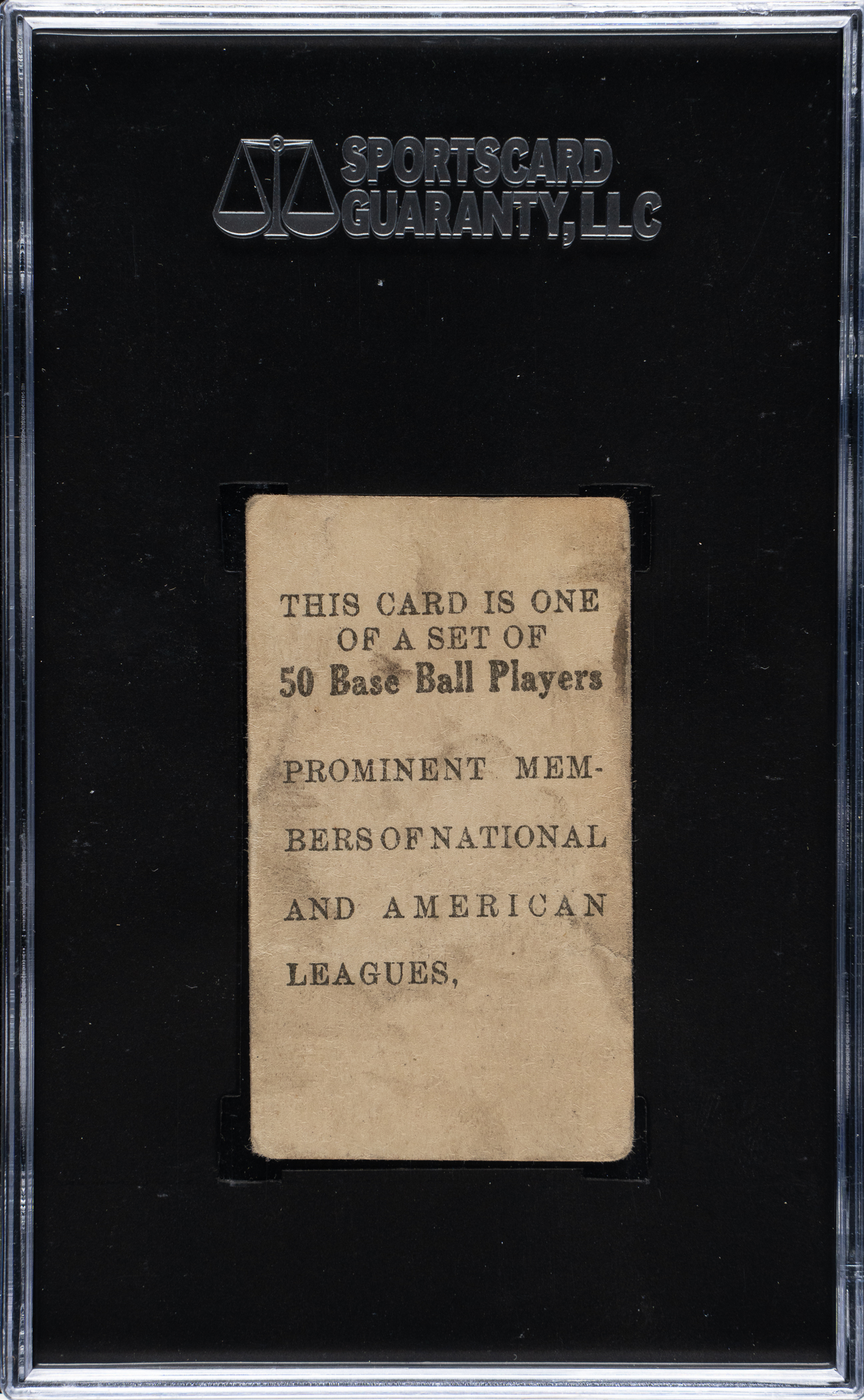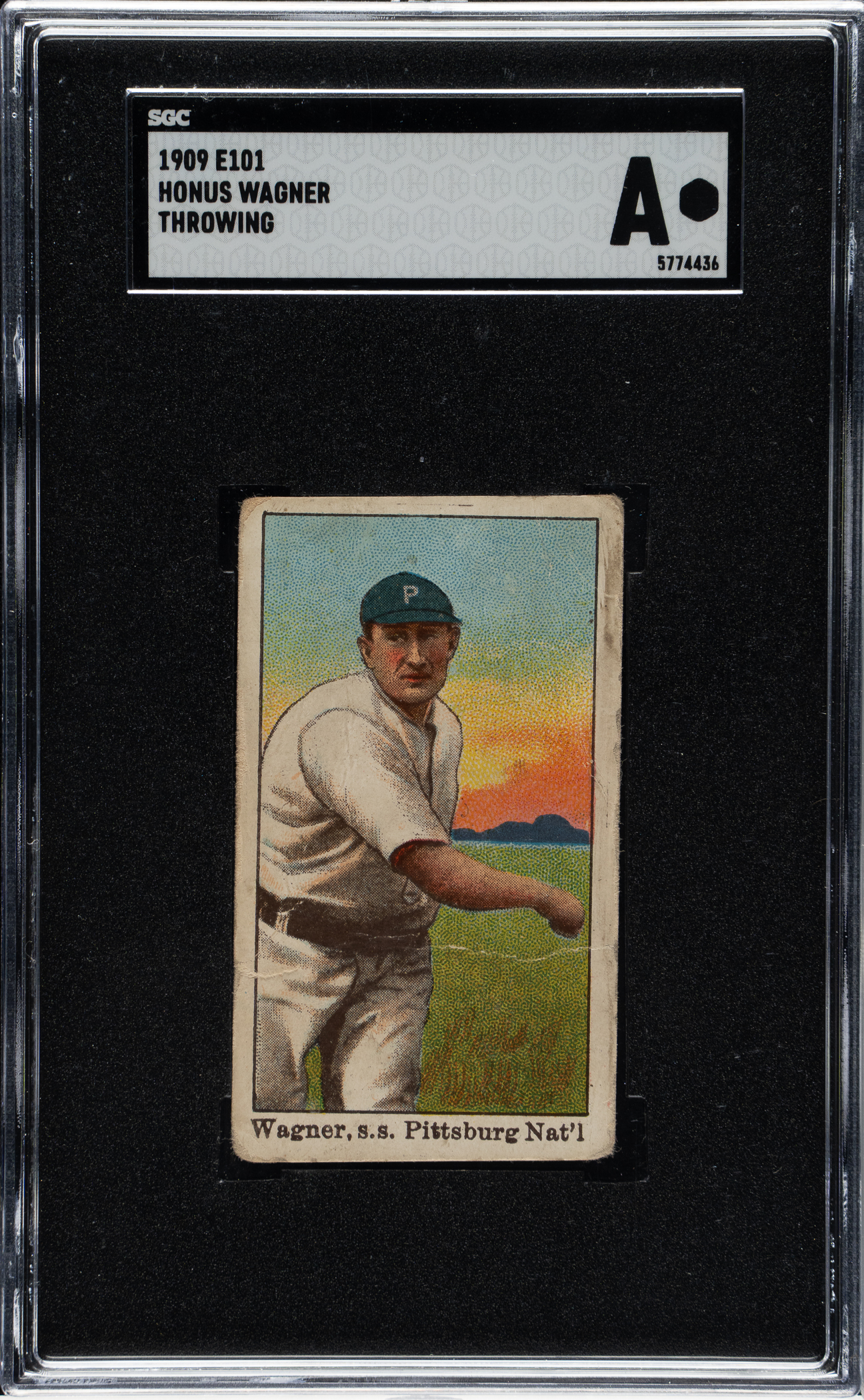 This extremely rare E101 "Set of 50" candy card features the legendary Honus Wagner in a throwing pose. The manufacturer of E101 is unknown. The throwing pose of Wagner on this card is identical to that found in several rare sets of the era, including T216 Kotton Tobacco and E102 "Set of 25." The back simply reads "This card is one of a set of 50 Base Ball Players - Prominent Members of National and American Leagues." In 1909, Wagner led the league in every major batting category including batting average, on-base percentage, total bases, and RBI. Encapsulated as "Authentic" by SGC, the card has vibrant colors, moderate corner wear, heavy creasing, and soiling on the reverse. This is a pleasing example of one of Honus Wagner's elusive cards, issued at the peak of his career.