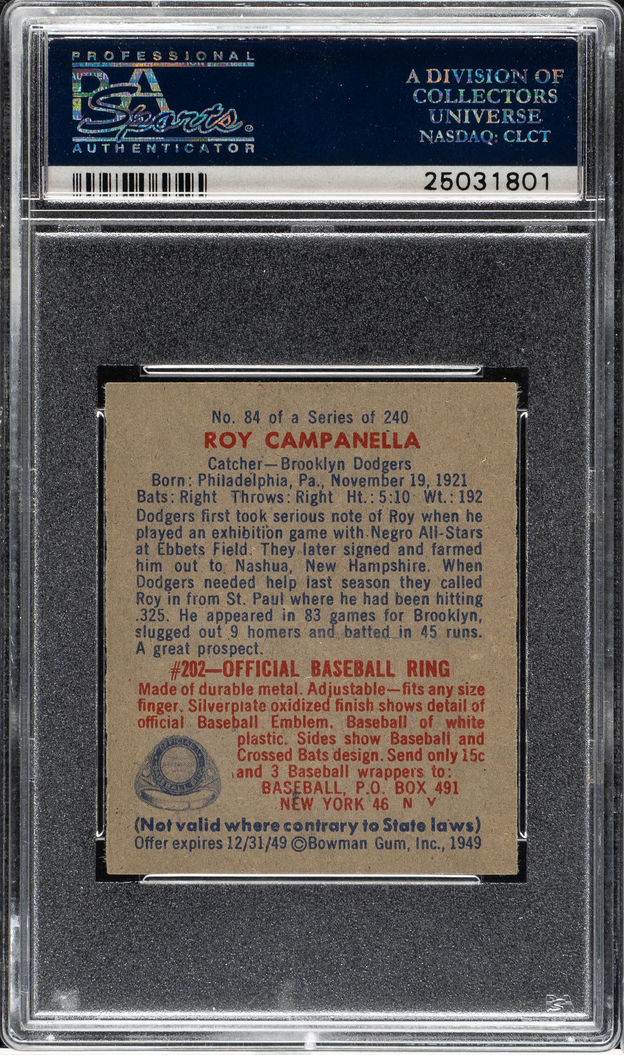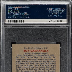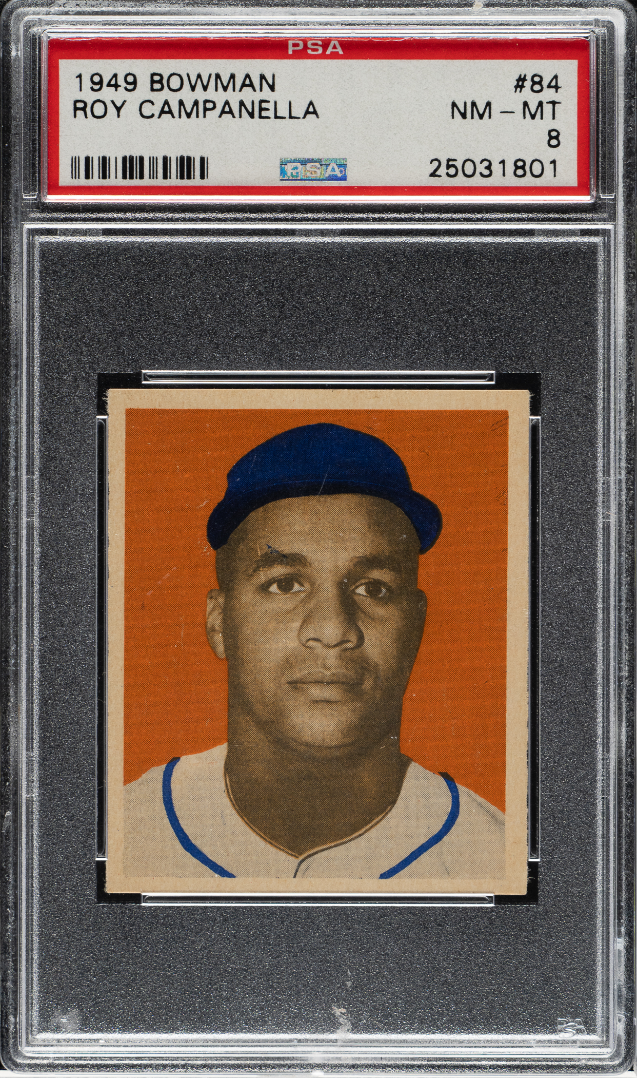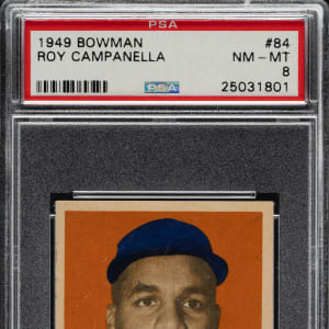 Graded NM-MT 8 by PSA. High-grade rookie card of Hall of Famer Roy Campanella, one of the key cards from the classic 1949 Bowman issue and one of the key Hall of Famer rookie cards of the era. This example is crisp and clean with outstanding registration and strong corners. Cards from this set are extremely hard to find in high grade in part because they often have soft corners due to the quality of the paper stock on which they are printed. One of the key classics of all postwar baseball-card issues, this is a beautiful high-grade example of Campanella's rookie card and one of the key Hall of Famers in the 1949 Bowman set.