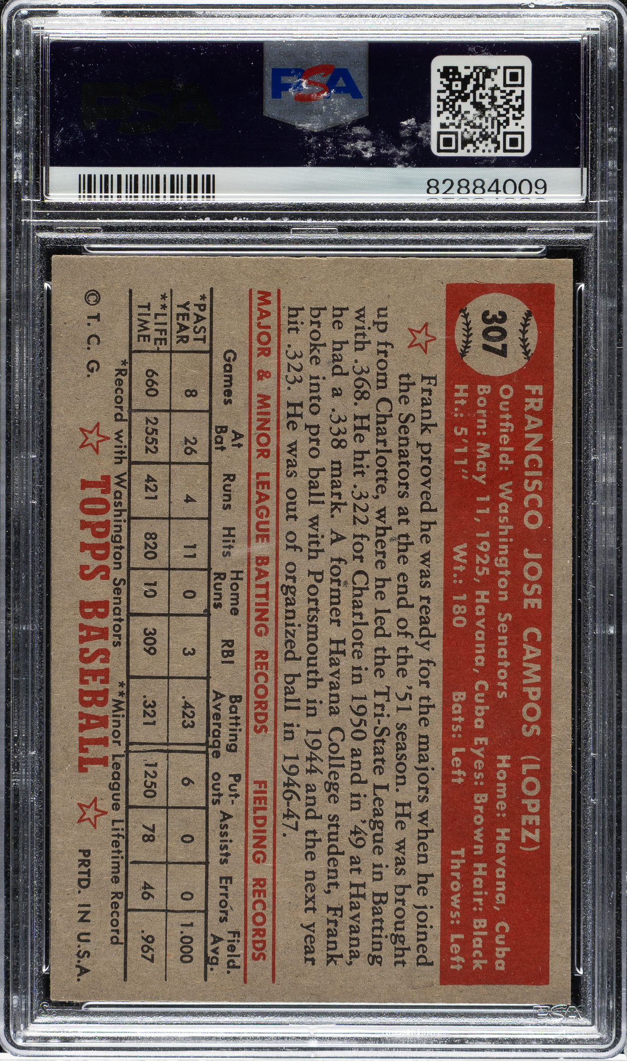 Graded NM-MT 8 by PSA. Washington Senators.