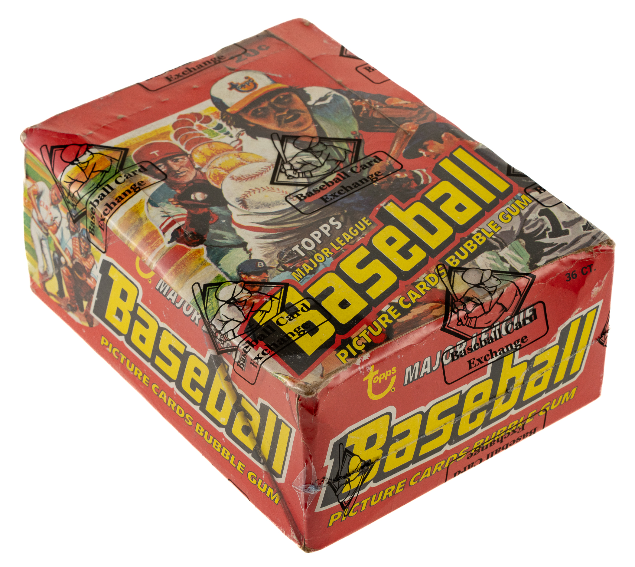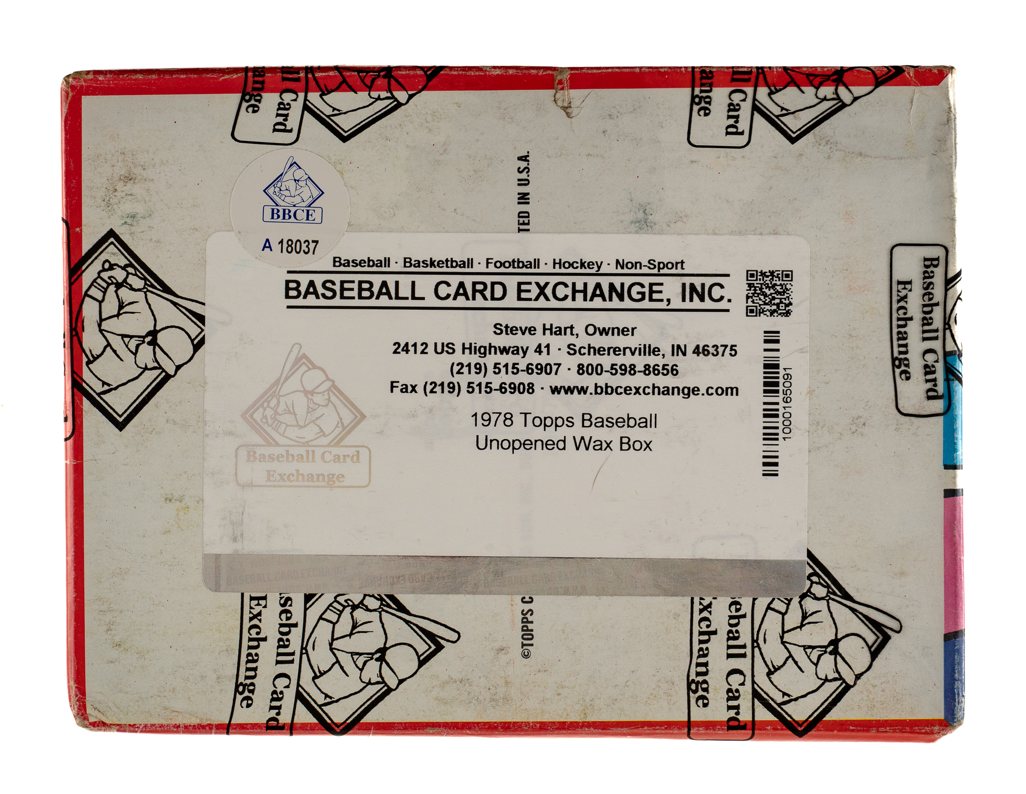 Complete, original unopened wax box of 1978 Topps baseball. The box houses 36 packs, with each pack containing 10 cards for a total of 360 cards. The 1978 Topps set includes rookie cards of Eddie Murray and Paul Molitor, as well as cards of many other Hall of Famers, including Nolan Ryan, George Brett, and Robin Yount. This box comes shrink-wrapped by Baseball Card Exchange (owned by Steve Hart, the foremost expert on unopened material). The display box is bright and bold with moderate shelf wear.