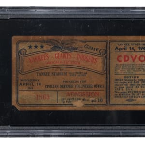 Full ticket (6-1/2 x 3-5/8 inches) to the special "CDVO Benefit Doubleheader" held at Yankee Stadium on April 14, 1943. Graded POOR 1 by PSA (the only graded example). This interleague doubleheader matched the New York Yankees against the Brooklyn Dodgers in the first game, with the winner (the Dodgers) taking on the Giants in the finale (also won by the Dodgers). The games were held to benefit the Civilian Defense Volunteer Office (CDVO), which was part of the Office of Civilian Defense. A reported 35,301 were in attendance, with advanced ticket sales generating $75,000 for the CDVO.