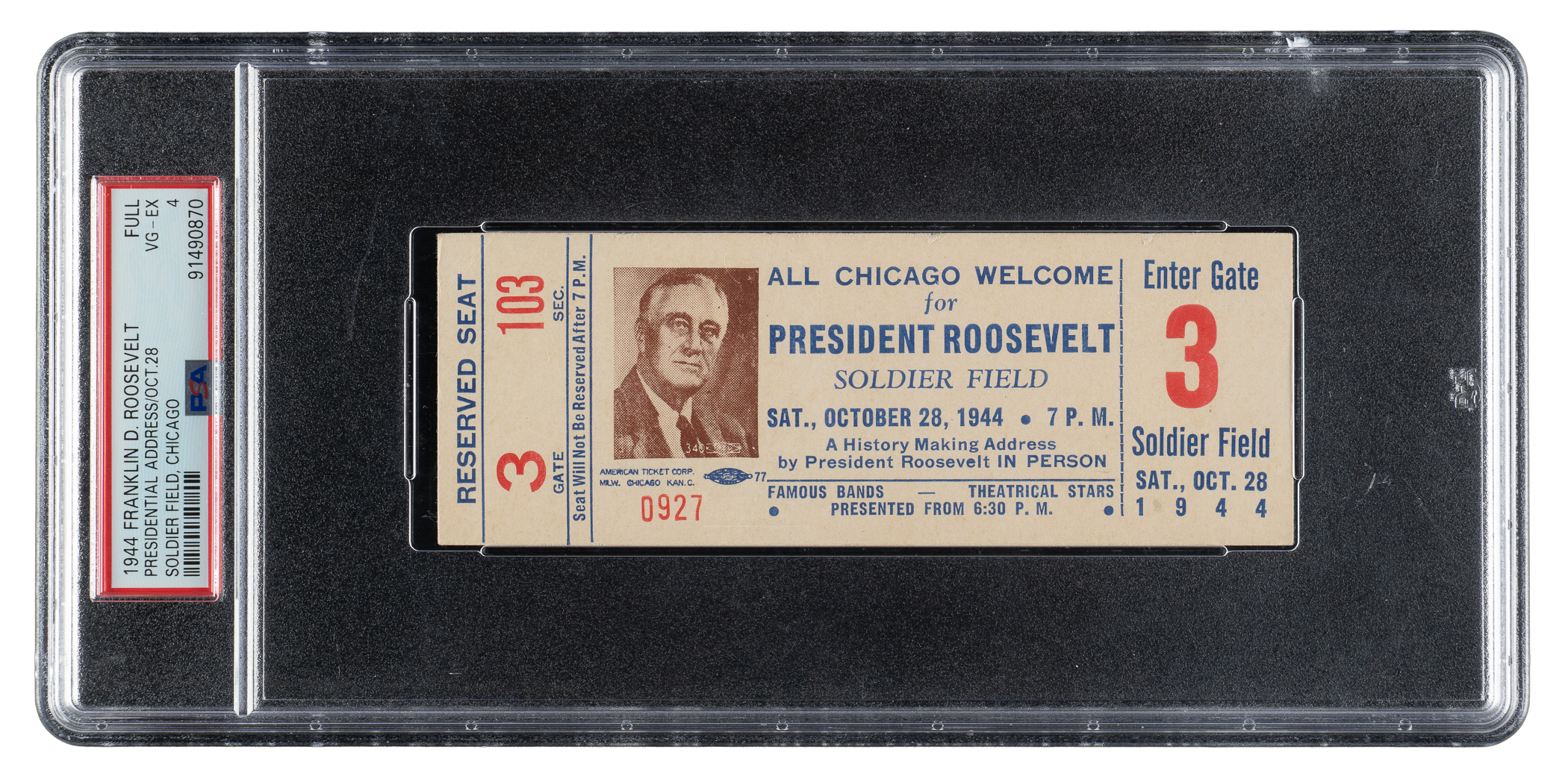 Graded VG-EX 4 by PSA. Full ticket (5.5 x 2 inches) to Franklin D. Roosevelt's (32nd President of the United States) presidential address on October 28, 1944 at Soldier Field in Chicago.