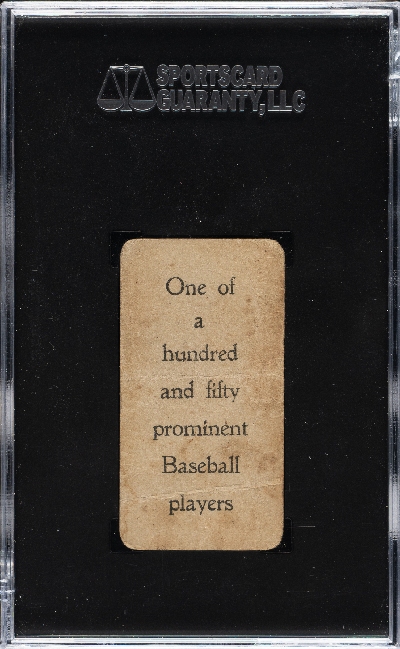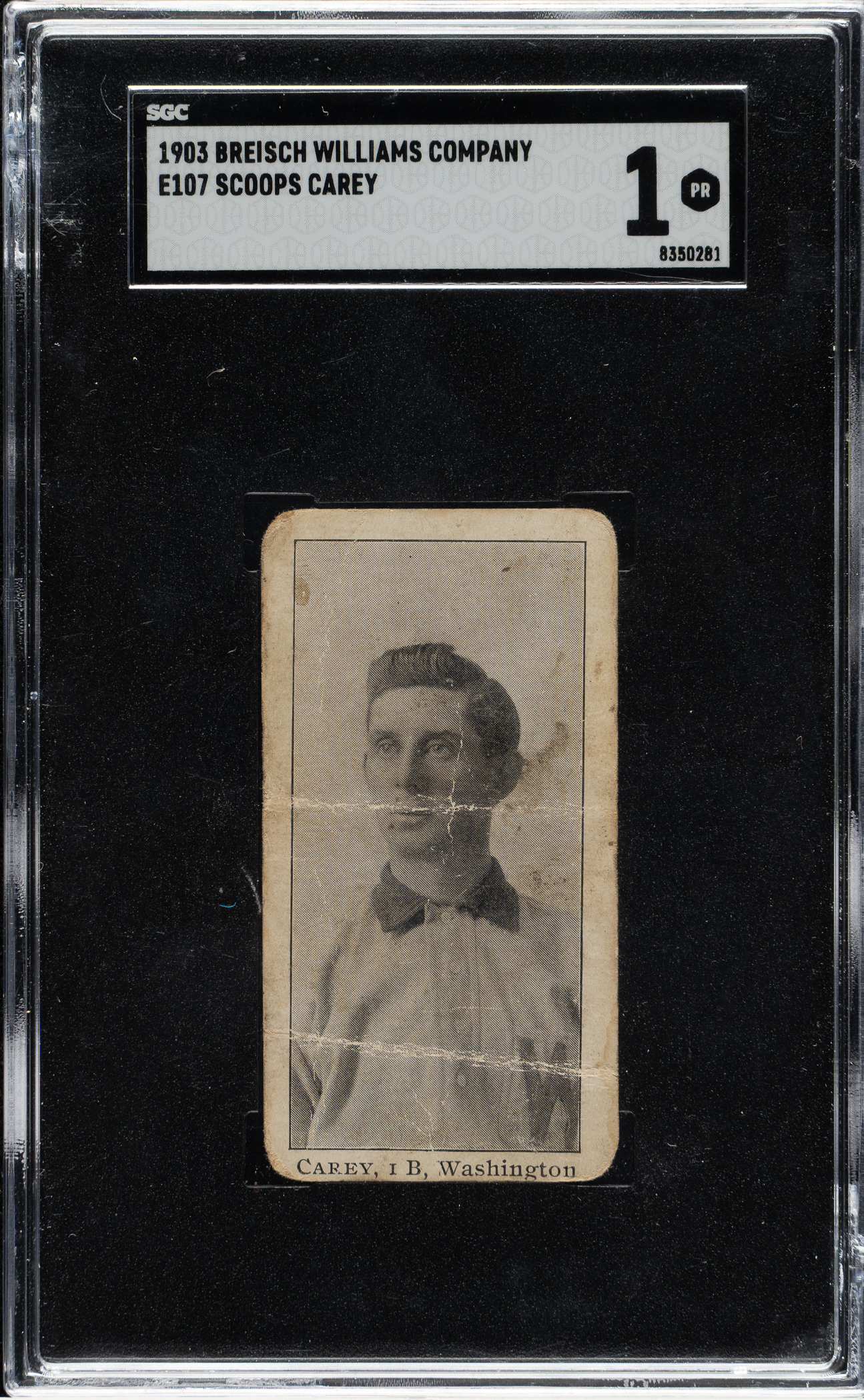 Extremely rare E107 Breisch-Williams card of Washington’s first baseman, Scoops Carey. Carey only played four seasons in the Major Leagues. He is well known among tobacco-card collectors for his inclusion in the Southern Leaguer subset from the popular T206 White Borders series. Graded POOR 1 by SGC, the obvious condition flaws include creasing, rounded corners, and scattered stains. This is a modestly graded example from one of card collecting's most revered sets.