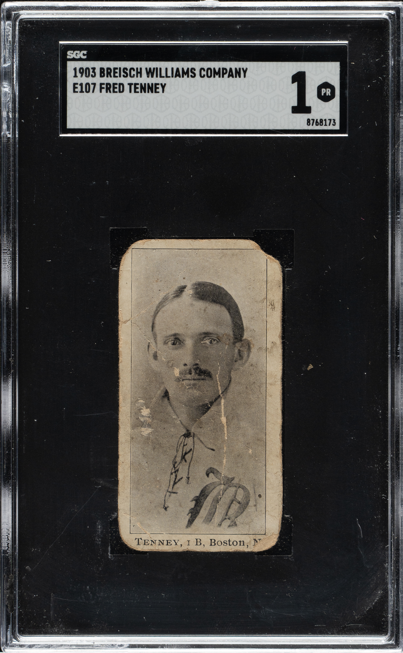 Extremely rare E107 Breisch-Williams card of Boston Beaneaters' first baseman, Fred Tenney. He is well known among tobacco-card collectors for his inclusion in the popular T206 White Borders series. Graded POOR 1 by SGC, the obvious condition flaws include creasing, rounded corners, and soiling. This is a modestly graded example from one of card collecting's most revered sets.