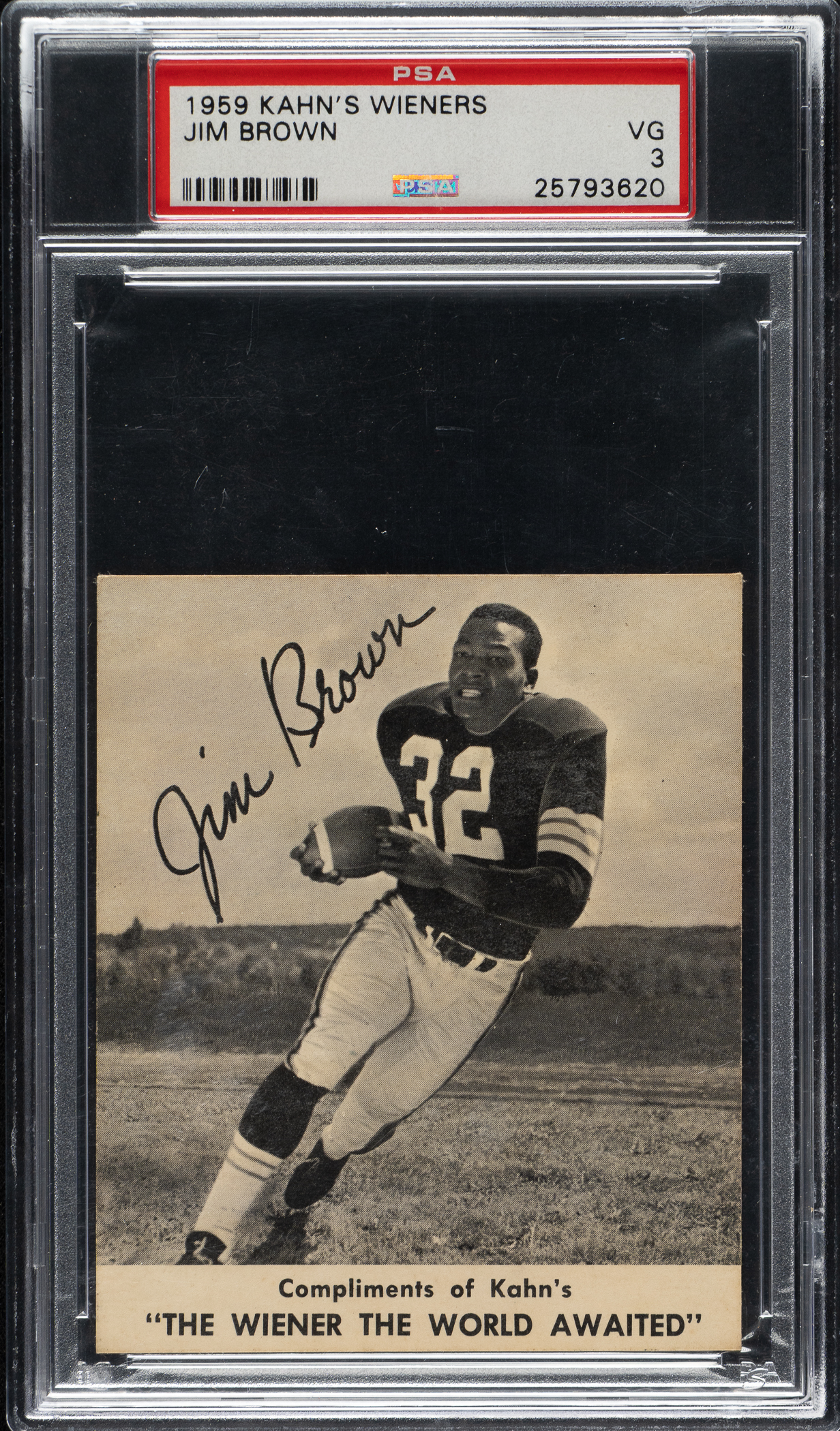 Graded VG 3 by PSA. Very attractive example of Cleveland Browns Hall of Famer Jim Brown from the 1959 Kahn's Wieners football set, the first and rarest set issued by the popular food manufacturer. Kahn's Wieners cards are one of the few food issues of the era and are far rarer than most other football cards issued in the 1950s. The very scarce 1959 Kahn's Wieners football set features members of only the Cleveland Browns and Pittsburgh Steelers. One card was issued with each package of Kahn's meats. Because of the product with which they were packaged, heavy grease stains and creases are common with this issue, making it even more difficult to acquire a high-grade example. All Kahn's meats cards are condition rarities! The offered card displays a crisp image of Brown and minor corner wear. Light staining on the reverse factors into the assigned grade. This is a very attractive mid-grade example of one of Jim Brown's most elusive cards from one of the 1950s' most legendary rare regional sets.