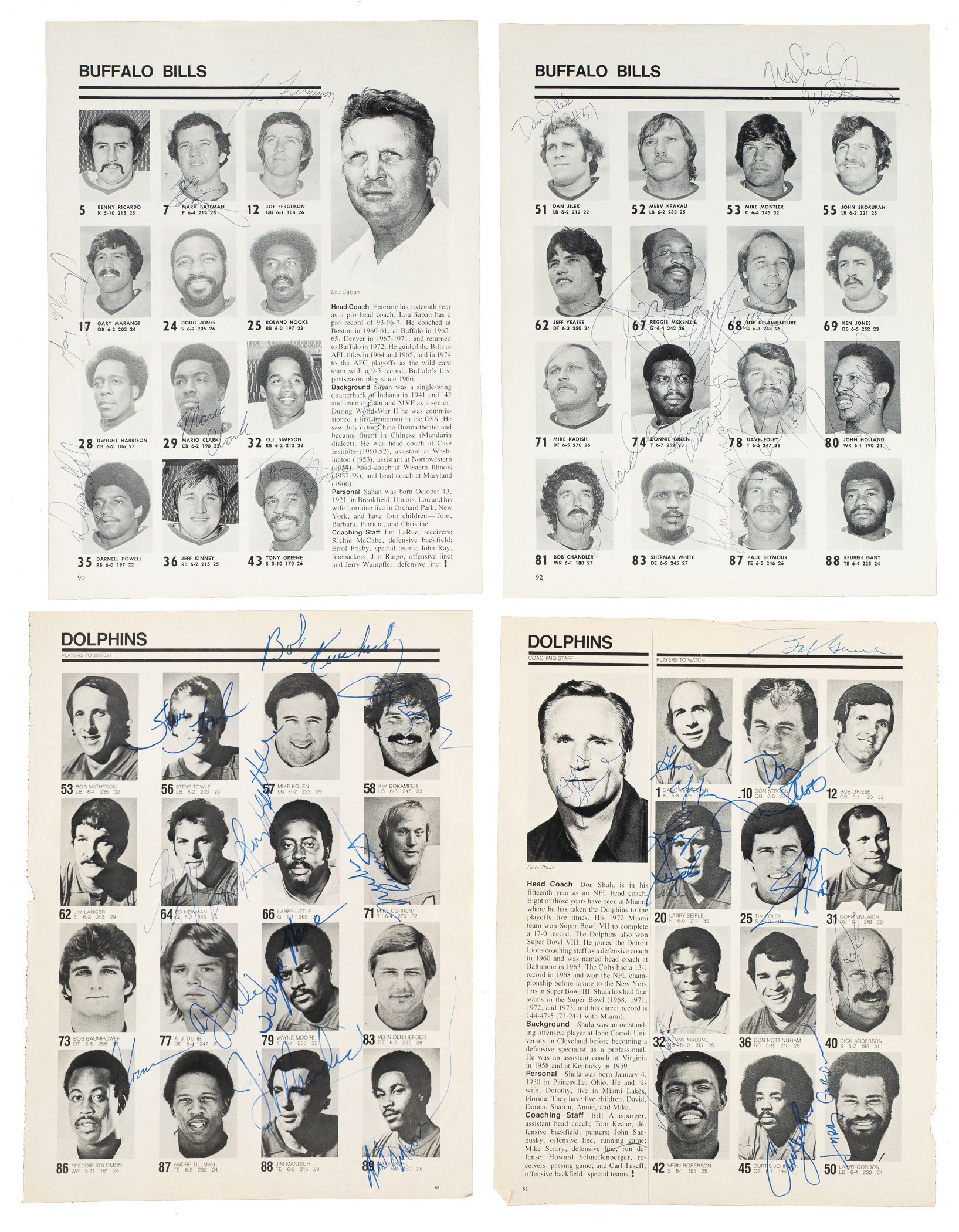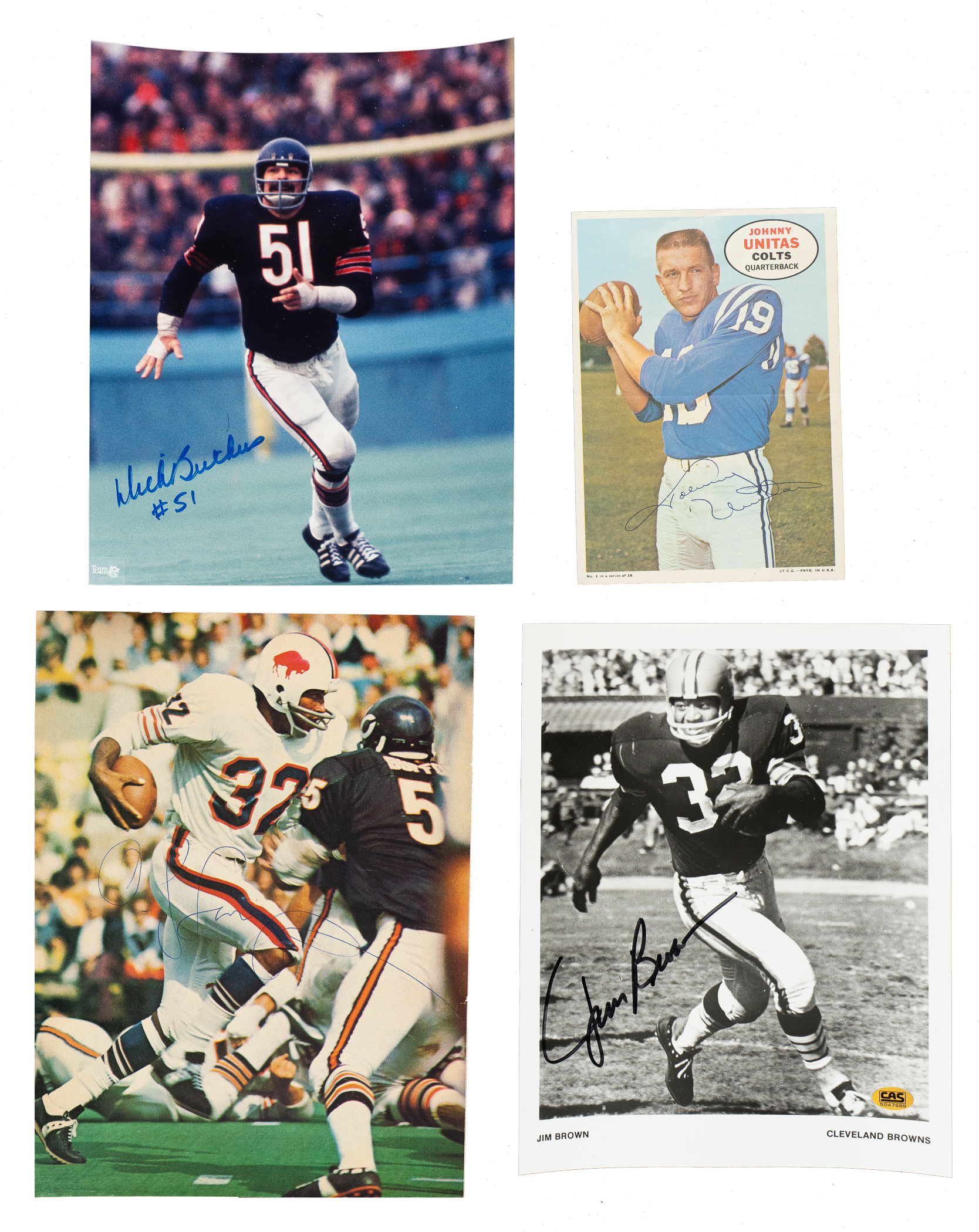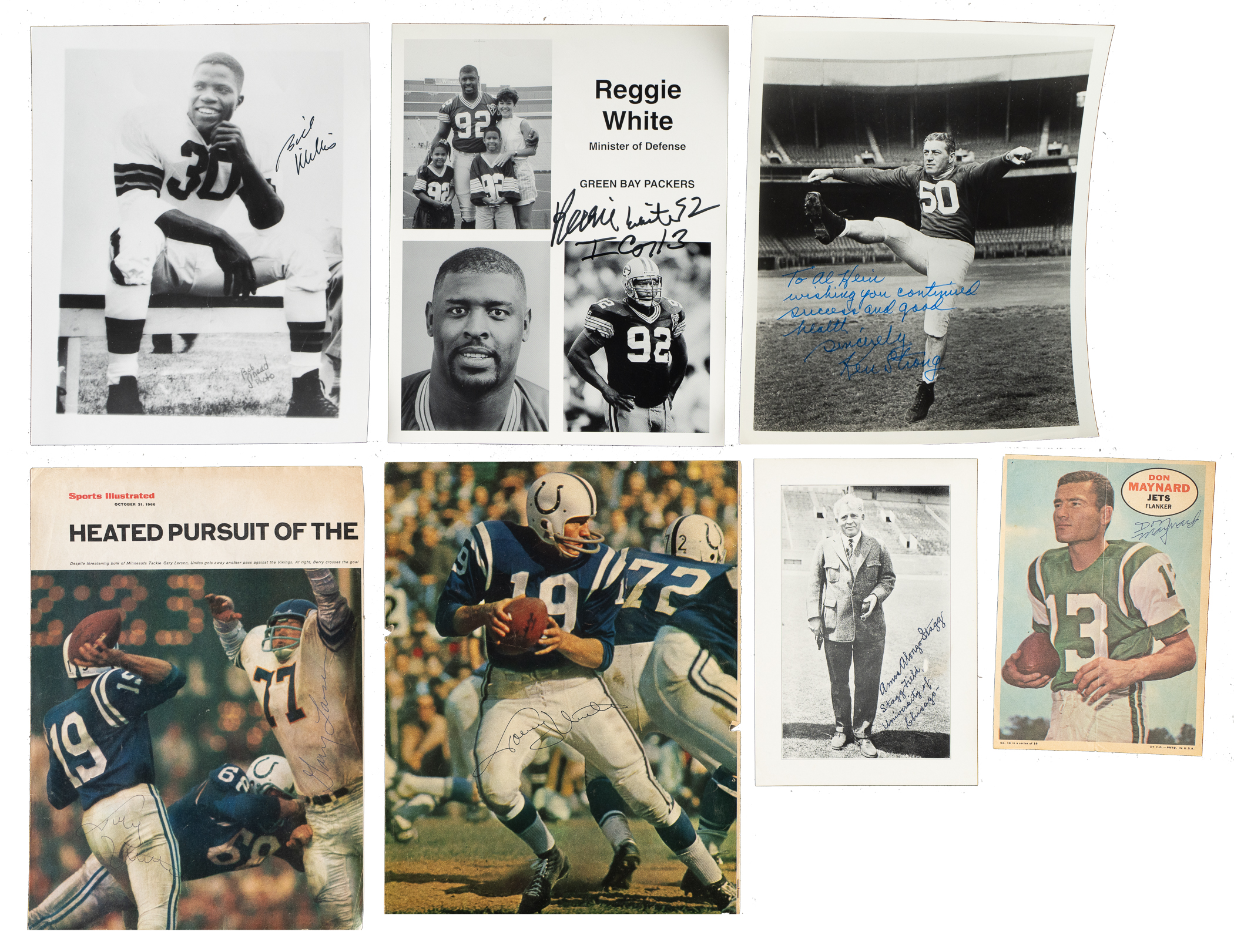 Collection of 58 signed football player photos, the vast majority of which represent magazine pages and photographs. These 58 items total 100 signatures! Because approximately 35% of the photos have been cut from periodicals, the majority display small edge tears. Condition ranges from Fr to Ex, averaging Gd. The signatures are scripted in a variety of inks. This collection consists of the following: 1) Photographs (35): Baugh, J. Brown, Butkus, M. Duper, R. Flaherty, Larry Fitzgerald, Joe Foss (personalized, AFL Football Commissioner and WWII Medal of Honor recipient), B. Foster, Gabriel, Graham (personalized, long handwritten note), Greenwood, Hadl, G. Halas (personalized), Hornung, Hutson, "Too Tall" Jones, Kapp (personalized), "Bruiser" Kinard (personalized), Layne (personalized), Luckhurst, P. Manning (personalized), Morrall, Nagurski, Namath (personalized), two "Greasy" Neale (both personalized), Okoye (Nigerian Nightmare"), Amos Alonzo Stagg, Ken Strong (personalized), Tittle, Tunnell ("NY Football Giants 1971"), Charles White, Reggie White ("78 Heisman"), Bill Willis, and Russell Wilson. 2) Magazine Pages (15): Baugh, J. Brown, Csonka (SI Cover 1/21/1974), Hinkle, Deacon Jones, H. Jordan (personalized), Millner, "Brick" Muller, Sayers (personalized), Simpson, two Staubach, Unitas, Jurgensen/C. Taylor (dual-signed), and Unitas/G. Larsen (dual-signed). 3) 1968 and 1971 Topps Posters (3): #1 Unitas and 14 Maynard from 1968 and #11 Hayes from 1971. 4) Multi-Signed Program Pages (5): Vikings and Rams single page signed on one side by J. Kapp/G. Larsen/C. Eller/J. Marshall/A. Page and the reverse by Gabriel/Olsen/Talbert, 1976 Buffalo Bills two pages with 16 signatures, and 1977 Miami Dolphins two pages with21 signatures including Don Shula, Bob Griese, Dick Anderson, Larry Little, and Freddie Solomon. Total: 58 items. Auction LOA from James Spence/JSA.