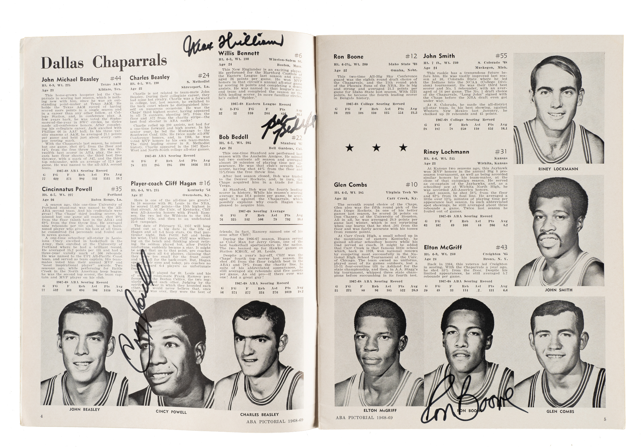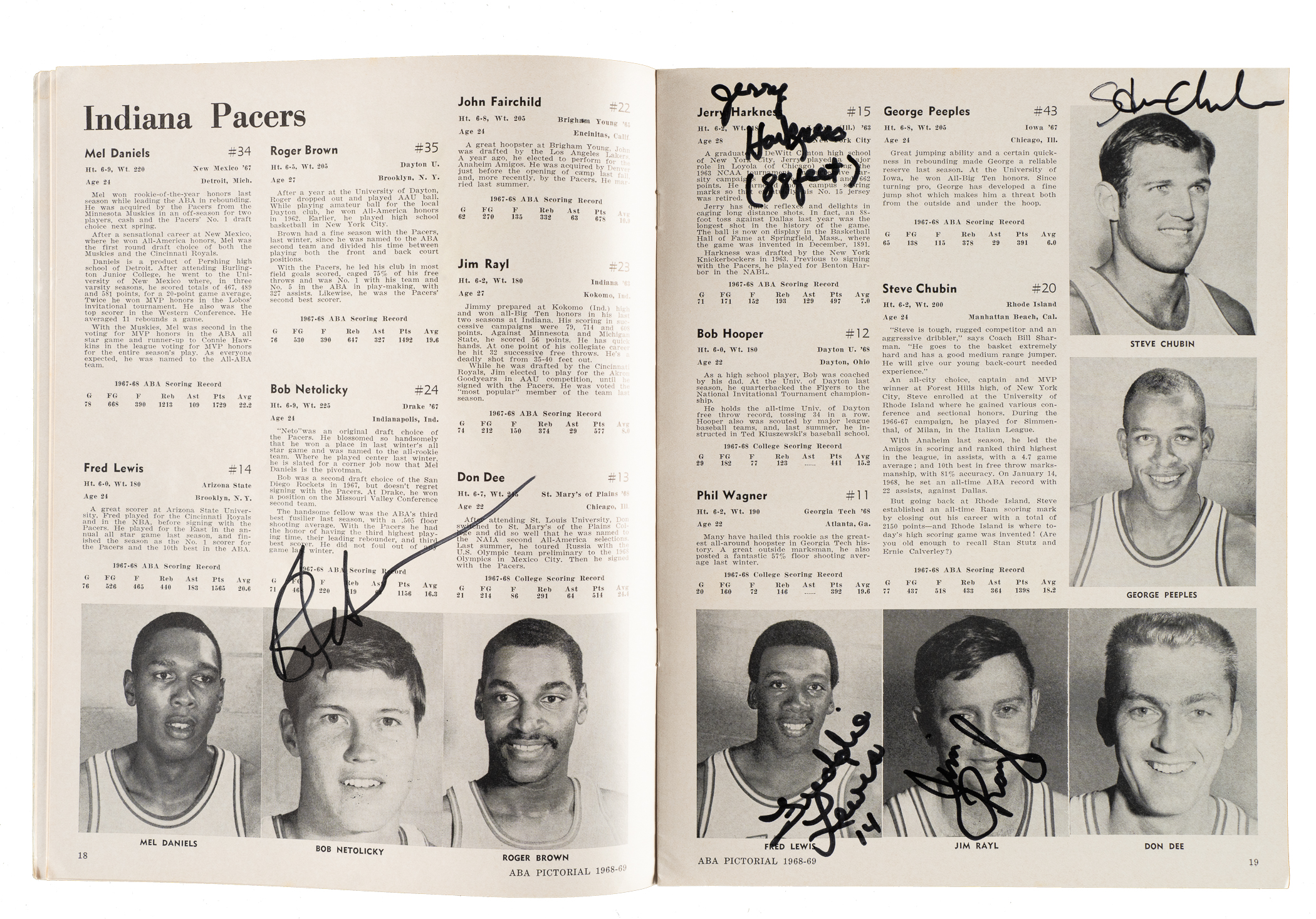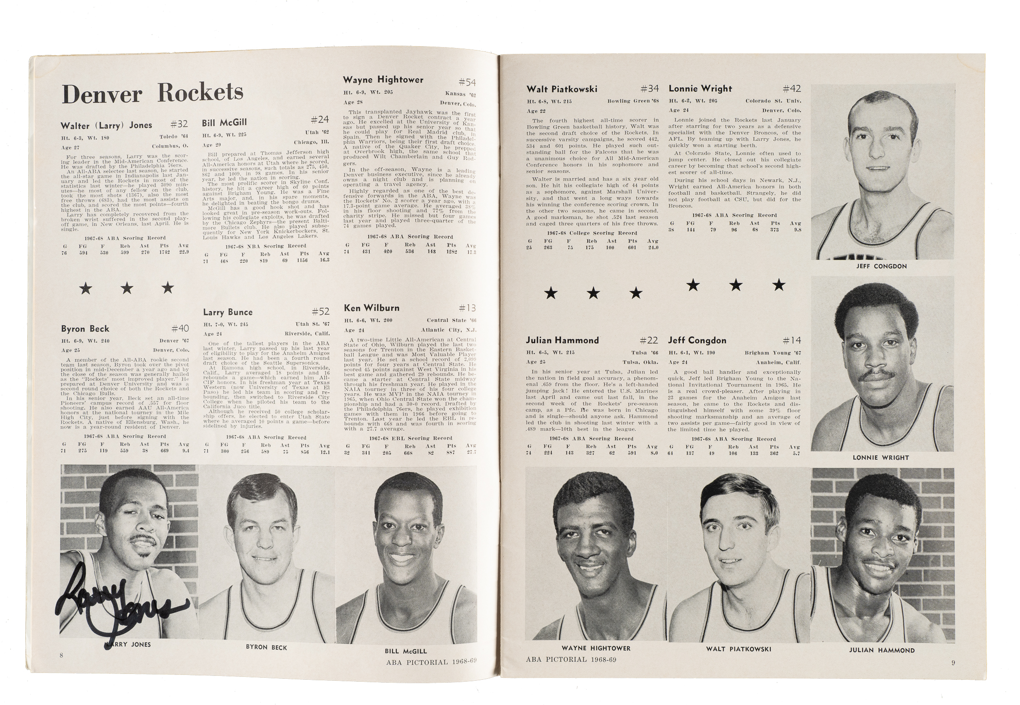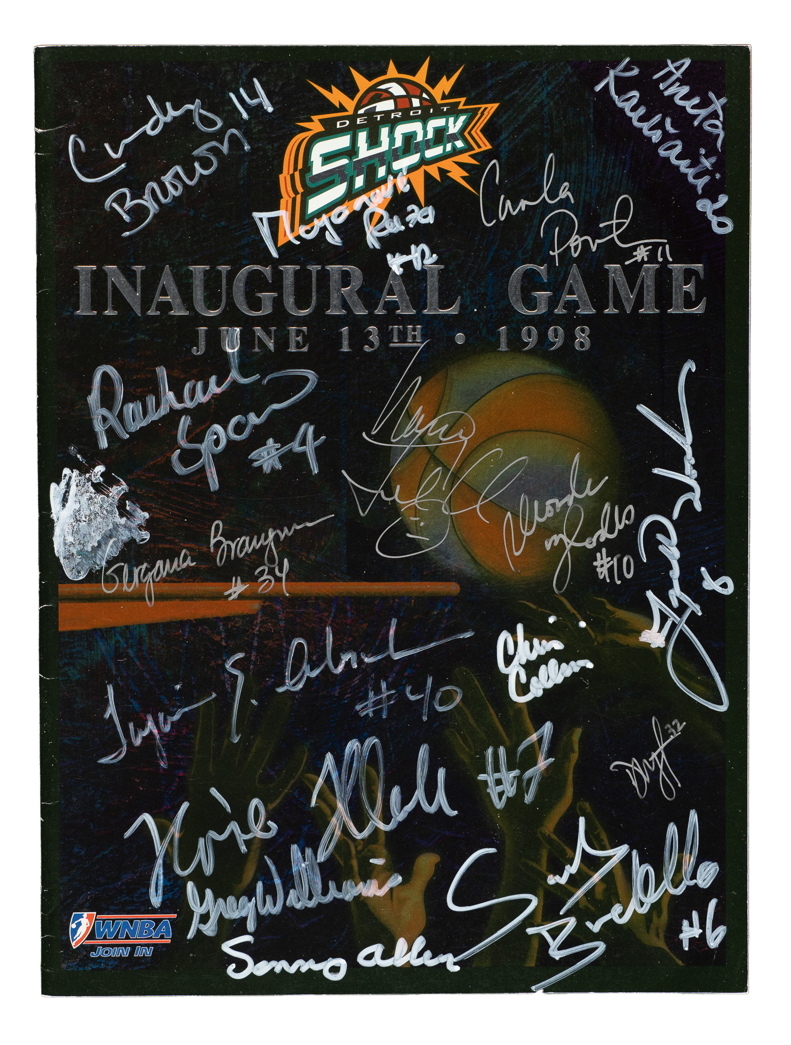 6) 1968-1969 ABA Pictorial (37 signatures): Art Becker, Bob Bedell, Ron Boone, Darel Carrier, Wayne Chapman, Steve Chubin, Lou Dampier, Jim Eakins, Don Freeman, Joseph Gregory, Jim Harding, Ira Harge, two Jerry Harkness (one personalized, both "88 feet"), Connie Hawkins, Evin Inniger, Larry Jones, Jim Jones, Steve Jones, Gary Keller, Bob Leonard, Fred Lewis, Jim Ligon, Doug Moe, Bob Netolicky, Cincy Powell, Bobby Rascoe, Jim Rayl, Kendall Rhine, Gabe Rubin, Sam Smith, Dan Sparks, Maurice Stern, Bob Warren, Willie Worsley and two unidentified (Gd). 7) 1970-1971 N.Y. Nets Program (15 signatures): Jim Ard, Rick Barry, Joe DePre, Jim Hayes, Les Hunter, Bill Melchionni, George Mikan, Billy Paultz, two Levern Tart, Ollie Taylor, George Thompson, and three unidentified (Vg-Ex). 8) 1992-1993 Orlando Magic Hoops Program (1 signature): Signed by Shaquille O'Neal (Ex). 9) 2/10/1994 NBA Jam Session Program (21 signatures): From top left to bottom right: Howard Porter, Maurice Lucas, Trent Tucker, John Havlicek, Randy Smith, Bob Love, Caldwell Jones, Paul Silas, Alvin Gentry, Bill Walton ("Hall of Fame"), Calvin Murphy, Jim Jackson, K.C. Jones, Elgin Baylor, Dave Debuscherre, Alex English, Mel Davis, Monk "Don" Meineke ("NBA 1st Rookies"), Mark Bryant, and two unidentified (Vg). 10) 6/13/1998 Detroit Shock Inaugural Program (16 signatures): Sonny Allen, Rhonda Blades, Gergana Branzova, Sandy Brondello, Cindy Brown, Chris Collins, Korie Hlede, Aneta Kausite, Nancy Lieberman-Cline, DeAngela Minter, Razija Mujanovic, Tajama Abraham Ngongba, Carla Porter, Rachael Sporn, Greg Williams, and Lynette Woodward (Ex). 11) Lynette Woodward's Basketball Handbook (2 signatures): Lynnette Woodward ("Hall of Fame 2004") and Kevin Cook (Vg-Ex). Total: 11 programs/magazines totaling 140 signatures. Auction LOA from James Spence/JSA.