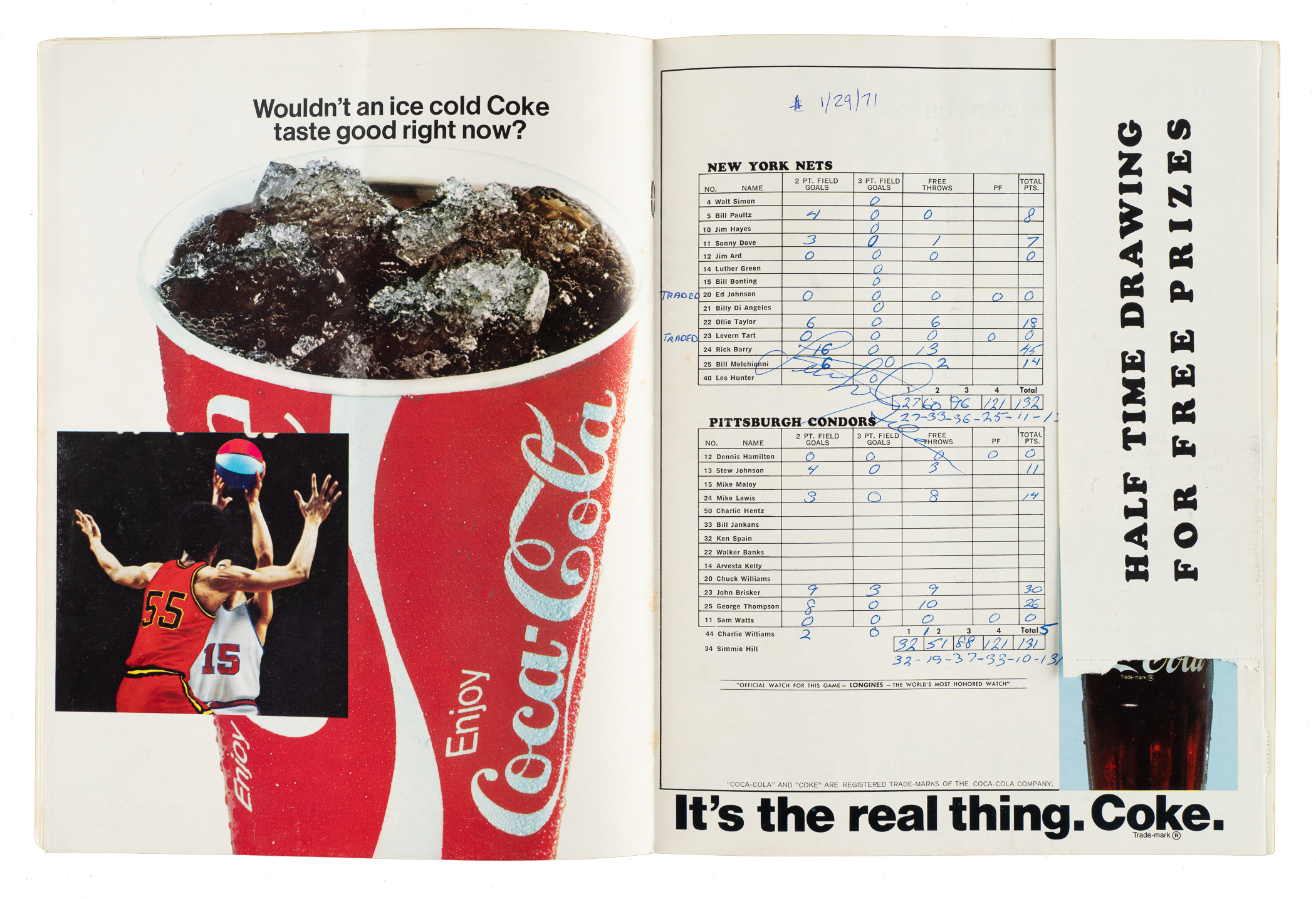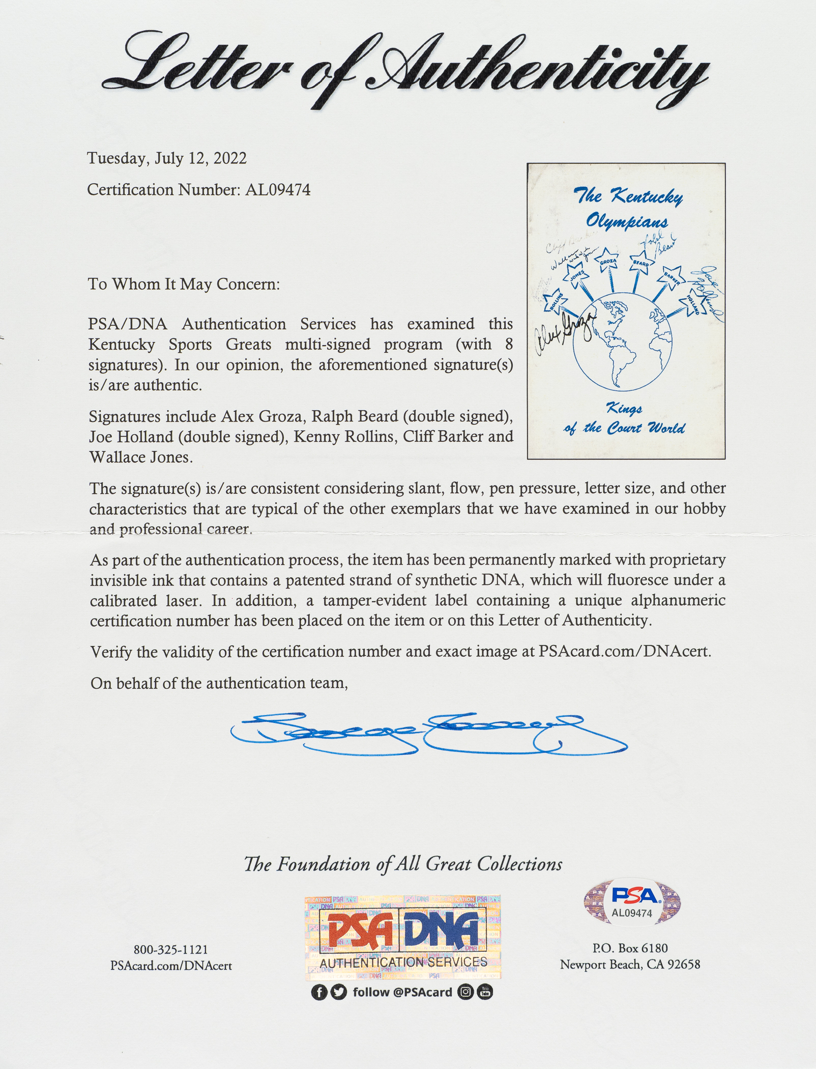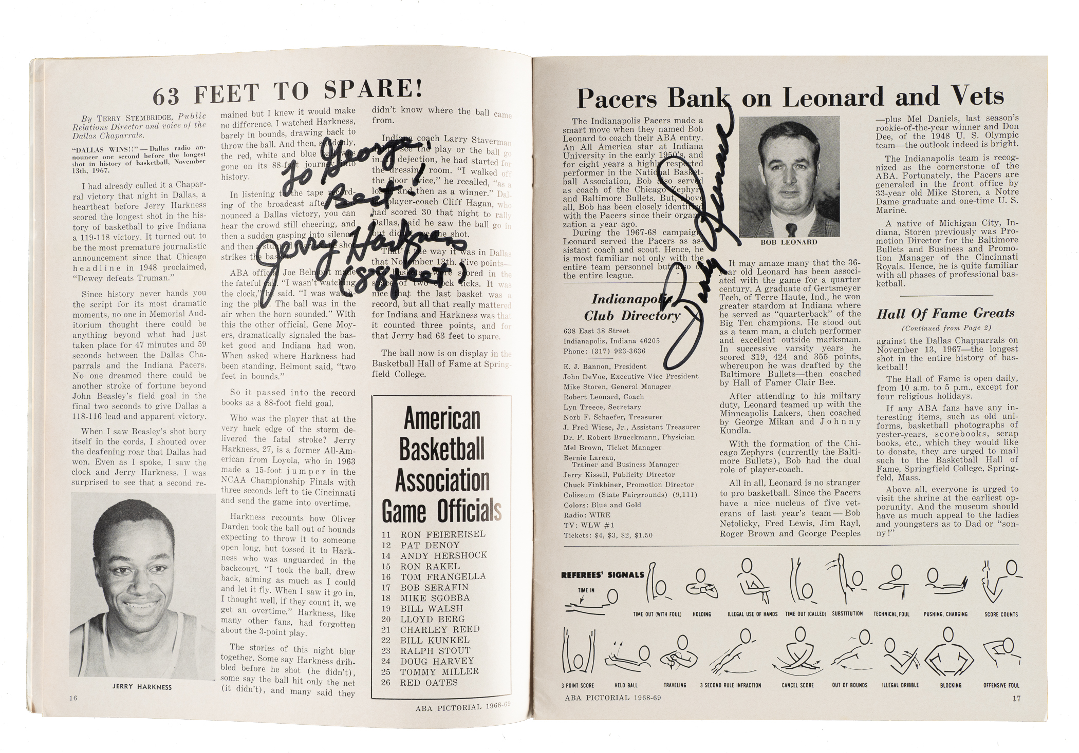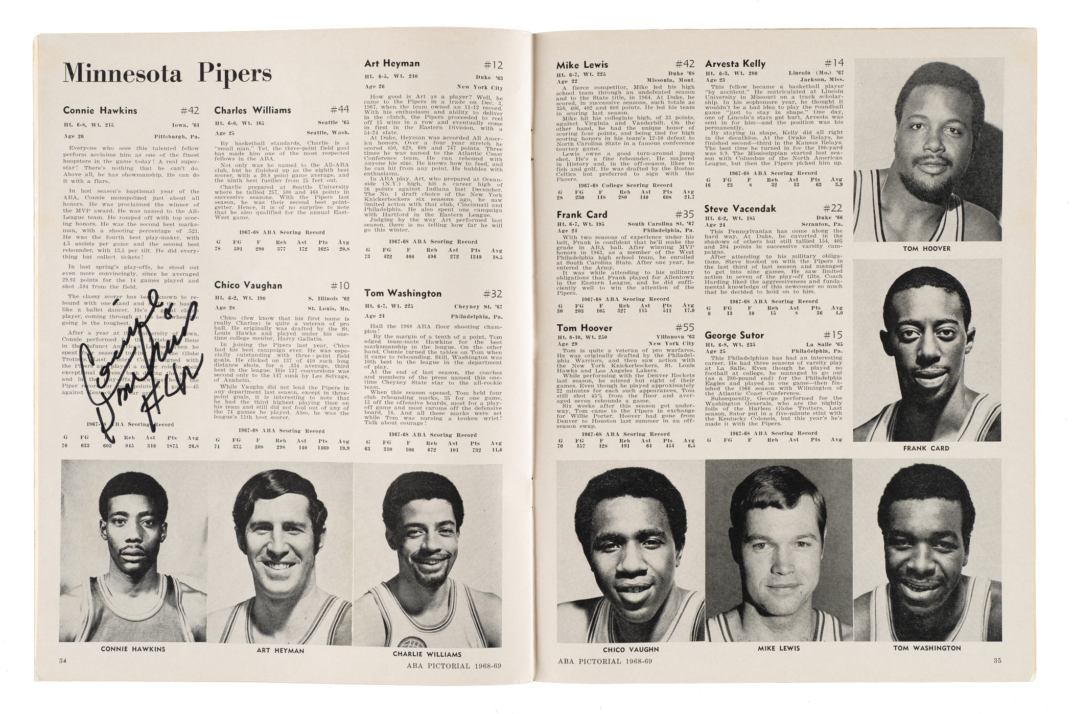 6) 1968-1969 ABA Pictorial (37 signatures): Art Becker, Bob Bedell, Ron Boone, Darel Carrier, Wayne Chapman, Steve Chubin, Lou Dampier, Jim Eakins, Don Freeman, Joseph Gregory, Jim Harding, Ira Harge, two Jerry Harkness (one personalized, both "88 feet"), Connie Hawkins, Evin Inniger, Larry Jones, Jim Jones, Steve Jones, Gary Keller, Bob Leonard, Fred Lewis, Jim Ligon, Doug Moe, Bob Netolicky, Cincy Powell, Bobby Rascoe, Jim Rayl, Kendall Rhine, Gabe Rubin, Sam Smith, Dan Sparks, Maurice Stern, Bob Warren, Willie Worsley and two unidentified (Gd). 7) 1970-1971 N.Y. Nets Program (15 signatures): Jim Ard, Rick Barry, Joe DePre, Jim Hayes, Les Hunter, Bill Melchionni, George Mikan, Billy Paultz, two Levern Tart, Ollie Taylor, George Thompson, and three unidentified (Vg-Ex). 8) 1992-1993 Orlando Magic Hoops Program (1 signature): Signed by Shaquille O'Neal (Ex). 9) 2/10/1994 NBA Jam Session Program (21 signatures): From top left to bottom right: Howard Porter, Maurice Lucas, Trent Tucker, John Havlicek, Randy Smith, Bob Love, Caldwell Jones, Paul Silas, Alvin Gentry, Bill Walton ("Hall of Fame"), Calvin Murphy, Jim Jackson, K.C. Jones, Elgin Baylor, Dave Debuscherre, Alex English, Mel Davis, Monk "Don" Meineke ("NBA 1st Rookies"), Mark Bryant, and two unidentified (Vg). 10) 6/13/1998 Detroit Shock Inaugural Program (16 signatures): Sonny Allen, Rhonda Blades, Gergana Branzova, Sandy Brondello, Cindy Brown, Chris Collins, Korie Hlede, Aneta Kausite, Nancy Lieberman-Cline, DeAngela Minter, Razija Mujanovic, Tajama Abraham Ngongba, Carla Porter, Rachael Sporn, Greg Williams, and Lynette Woodward (Ex). 11) Lynette Woodward's Basketball Handbook (2 signatures): Lynnette Woodward ("Hall of Fame 2004") and Kevin Cook (Vg-Ex). Total: 11 programs/magazines totaling 140 signatures. Auction LOA from James Spence/JSA.