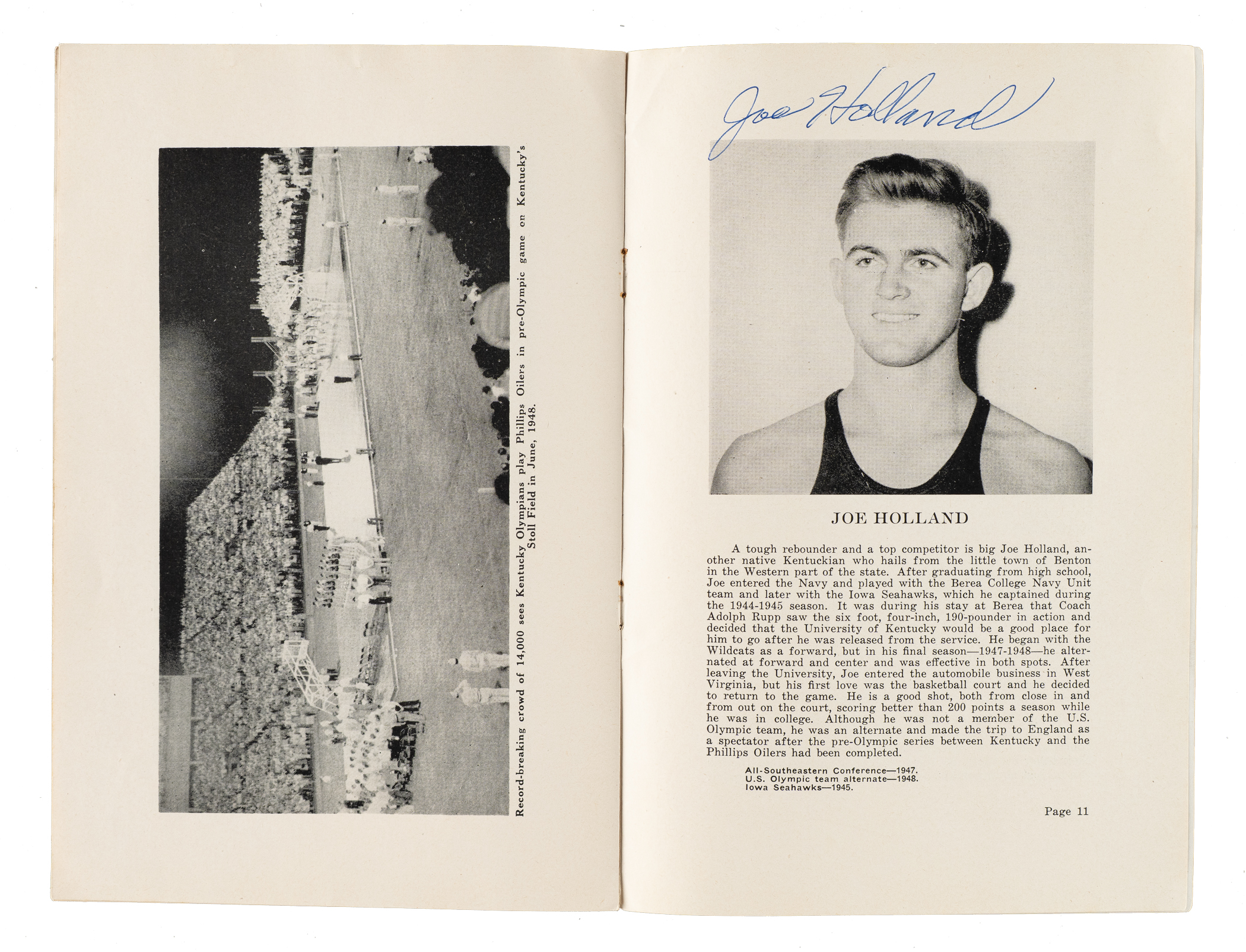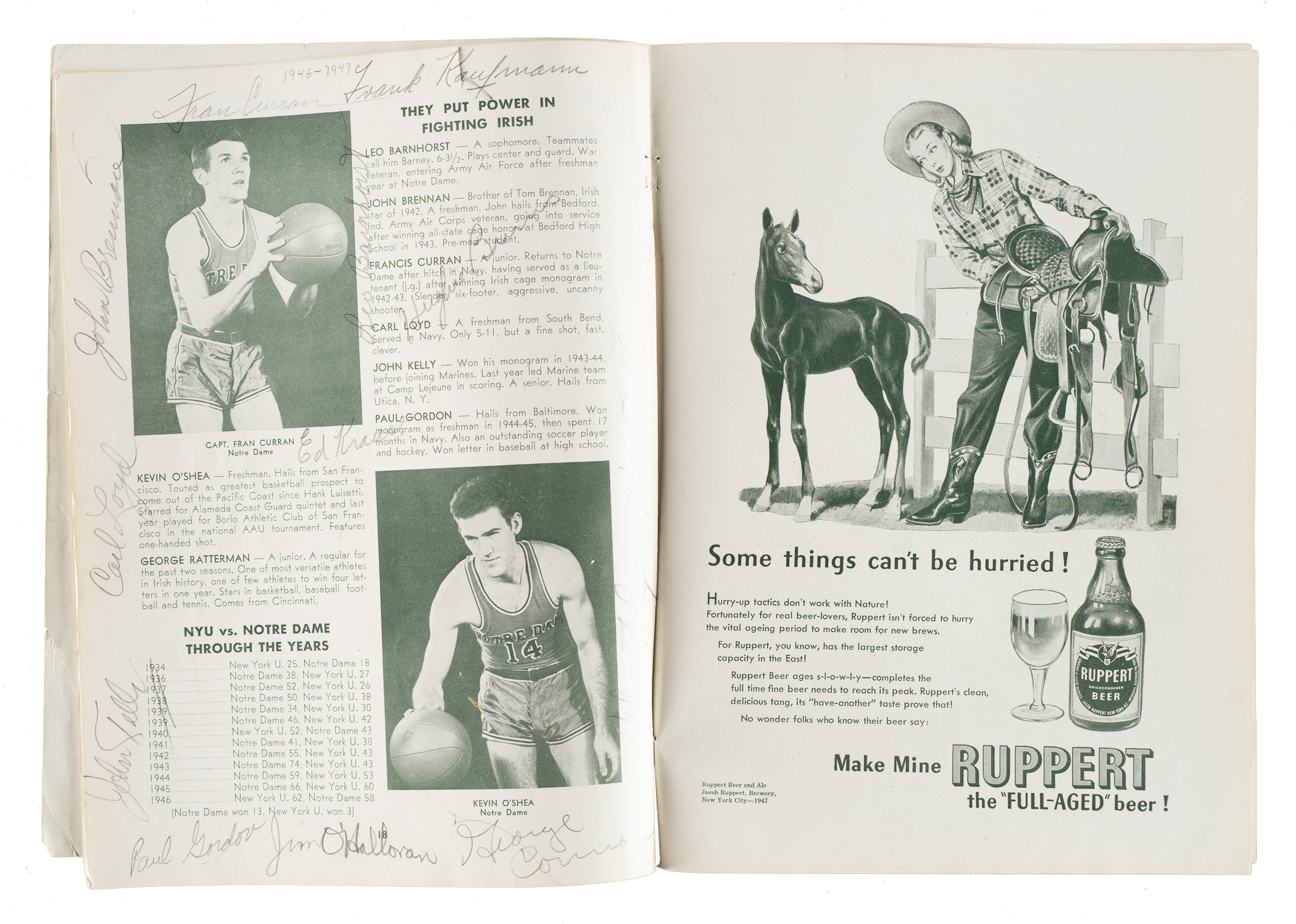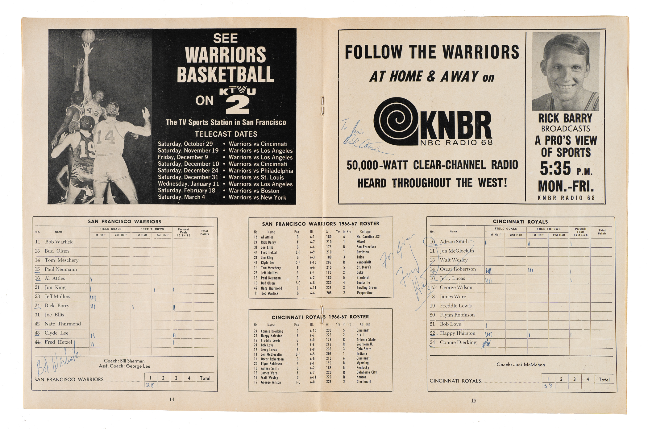 Presented is a collection of eleven 1947 to 1998 multi-signed basketball programs and magazines. These eleven programs/magazines total 140 signatures and feature 23 Hall of Famers. This collection consists of the following: 1) 2/24/1947 New York U. vs. Notre Dame at Madison Square Garden (13 signatures): Leo Barnhurst, John Brennan, Hughie Burris, George Connor (Football HOF), Fran Curran, John Foley, Paul Gordon, Frank Kaufman, John Kelly, Edward Krause, Carl Loyd, Jim O'Halloran, and Kevin O'Shea (Gd). 2) 1948-1950 The Kentucky Olympians Kings of the Court World Booklet (8 signatures): Cliff Barker, two Ralph Beard, Alex Groza, two Joe Holland, Wallace Wah Wah Jones, and Kenny Rollins (Gd). 3) 10/30/1950 Knickerbockers vs. Rochester and Harlem Yankees vs. Paterson at Madison Square Garden (8 Signatures): Jack Coleman, Les Harrison, Dick McGuire, Paul Noel, Arnie Risen, Connie Simmons, Ernie Vandeweghe, and Bobby Wanzer (Gd-Vg). 4) 1950 NBA Syracuse Sports Magazine (6 signatures): Chuck Cooper, Bob Cousy, Bob Harris, Noble Jorgensen, Don Lofgran, and Ed Macauley (Vg-Ex). 5) 1966-1967 San Francisco Warriors Quarterly Program (13 signatures): Al Attles, Rick Barry, Hank Greenwald, Happy Hariston, Fred Hertzel, Jim King, Bill King, Tom Meschery, Jeff Mullins, Bud Olsen, Oscar Robertson, Nate Thurmond, and Bob Warlick (Vg-Ex).