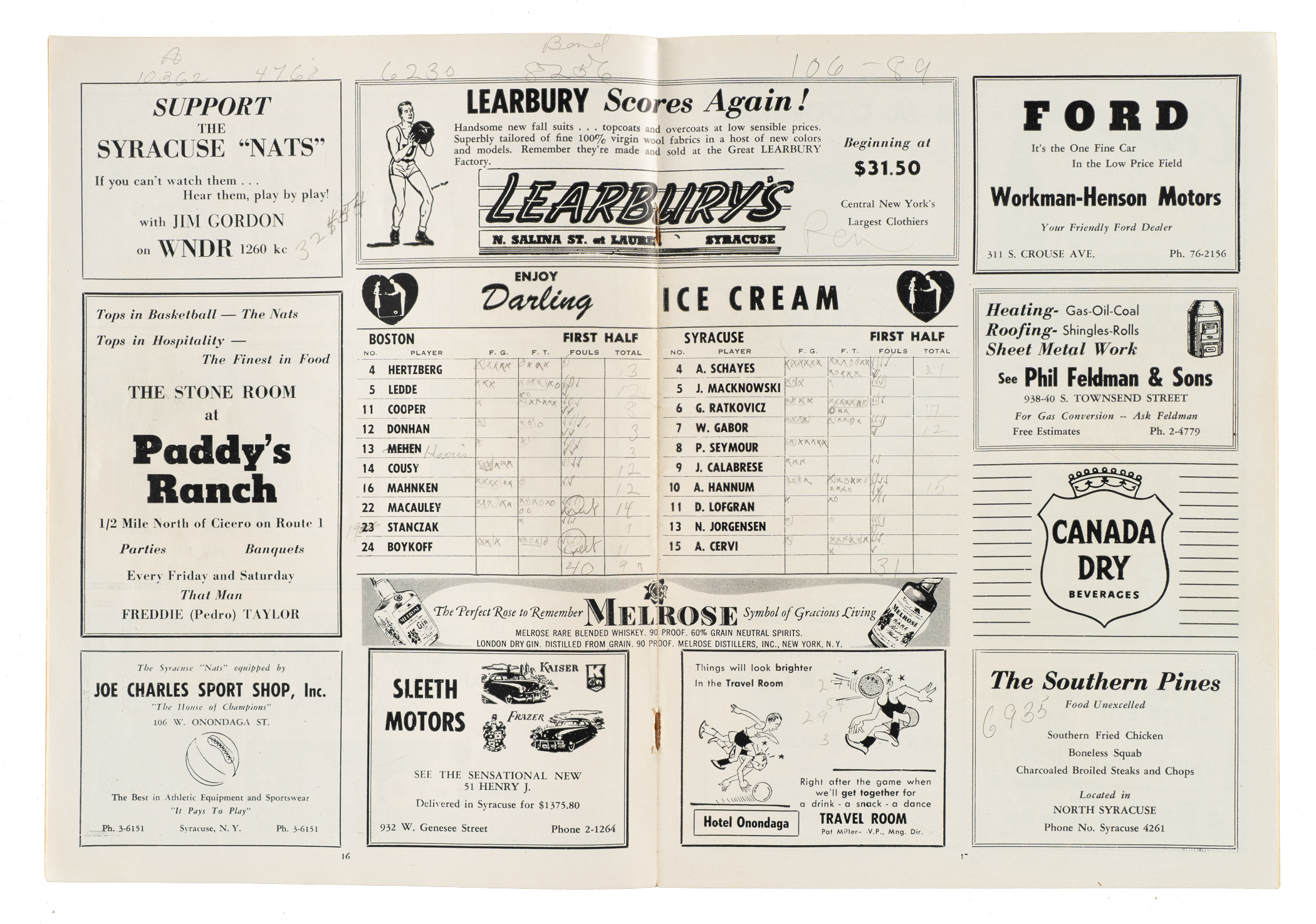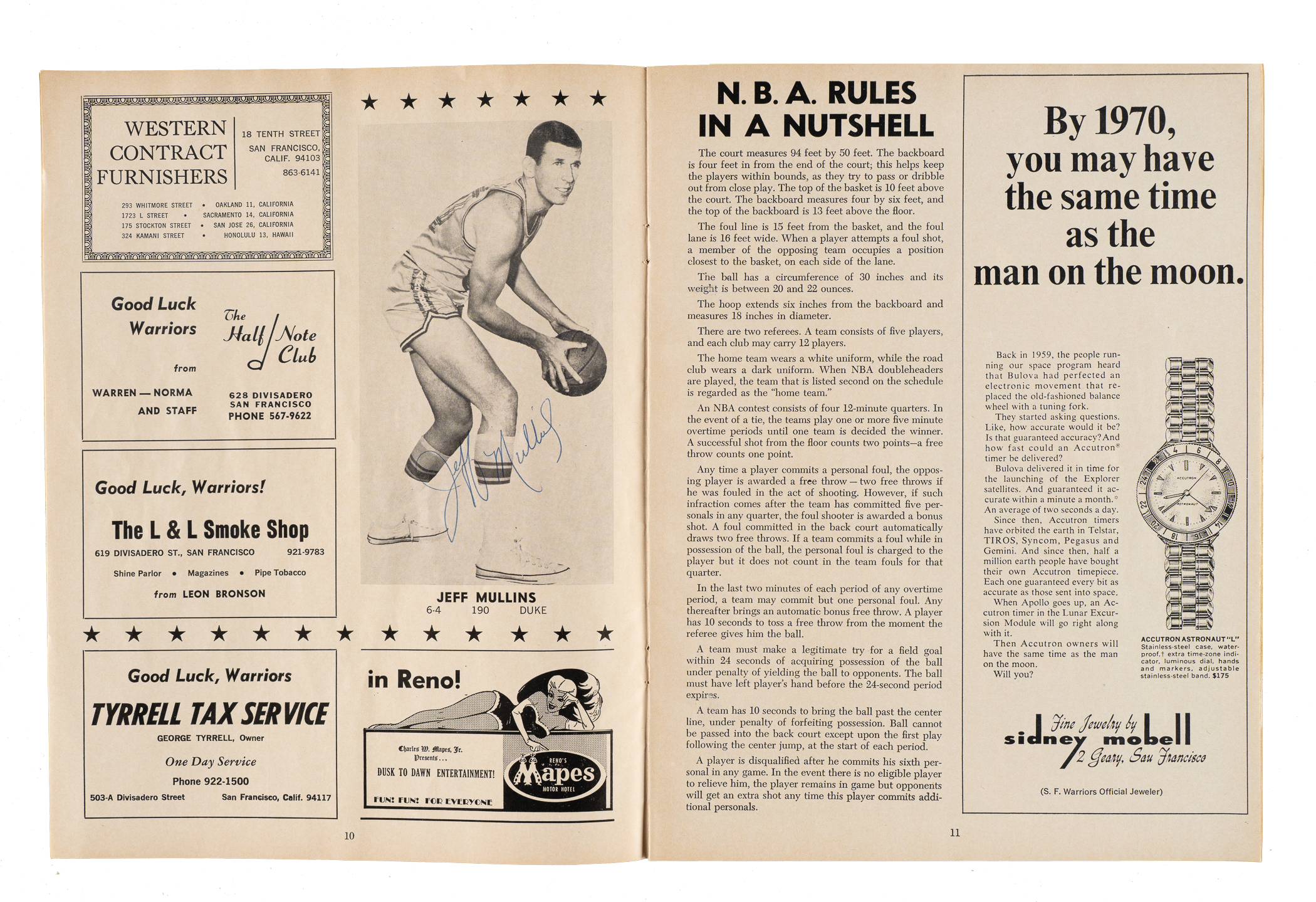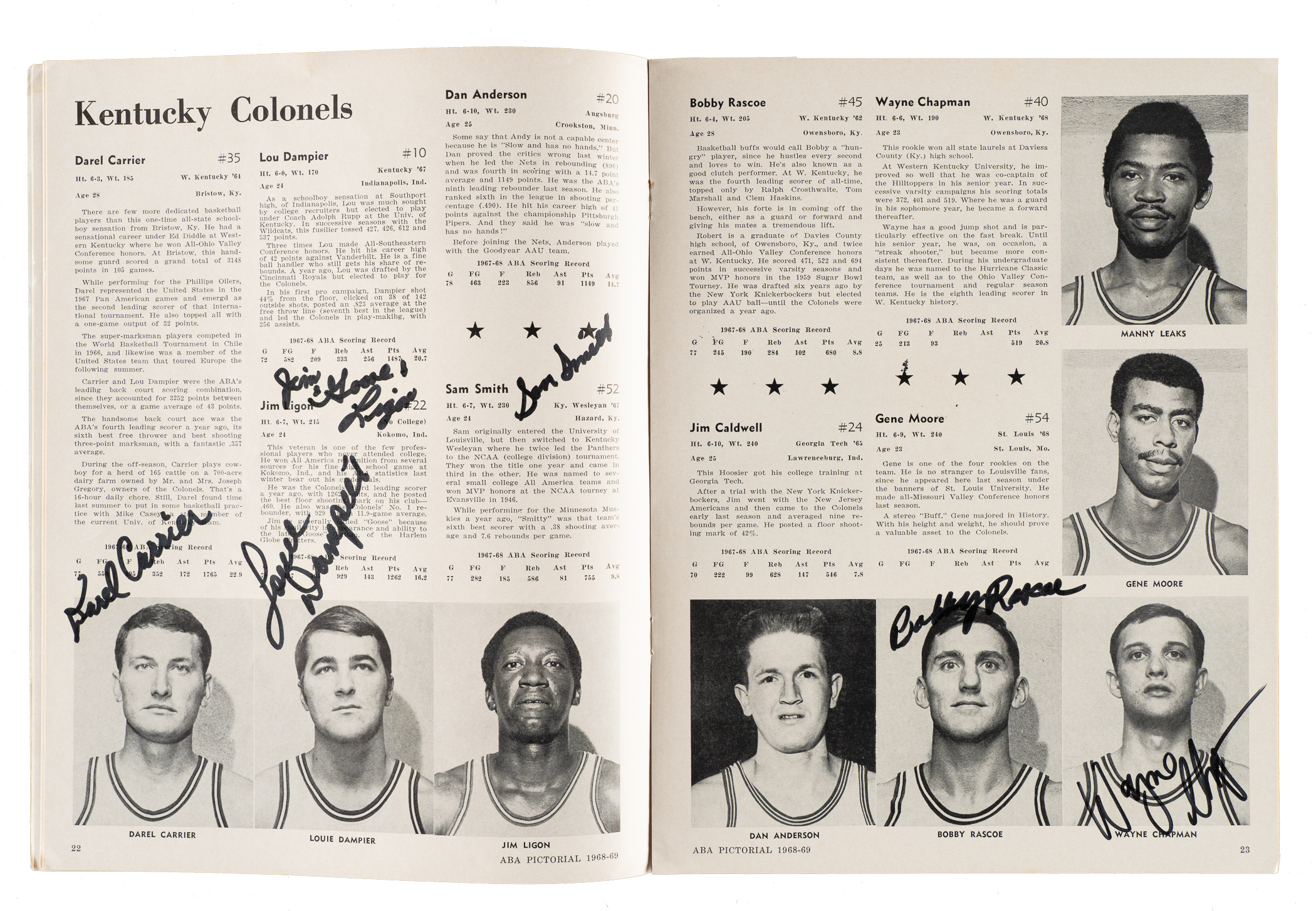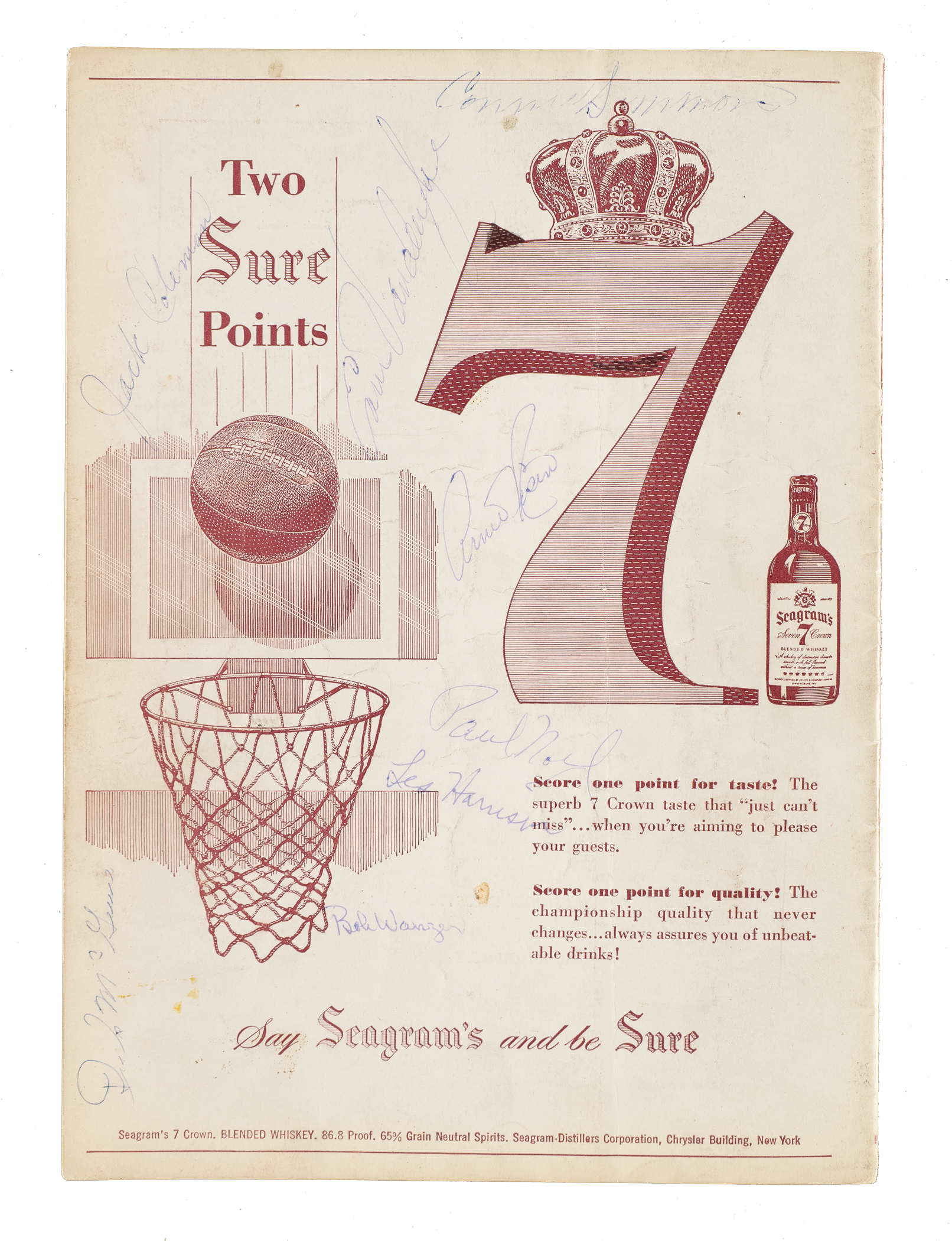 Presented is a collection of eleven 1947 to 1998 multi-signed basketball programs and magazines. These eleven programs/magazines total 140 signatures and feature 23 Hall of Famers. This collection consists of the following: 1) 2/24/1947 New York U. vs. Notre Dame at Madison Square Garden (13 signatures): Leo Barnhurst, John Brennan, Hughie Burris, George Connor (Football HOF), Fran Curran, John Foley, Paul Gordon, Frank Kaufman, John Kelly, Edward Krause, Carl Loyd, Jim O'Halloran, and Kevin O'Shea (Gd). 2) 1948-1950 The Kentucky Olympians Kings of the Court World Booklet (8 signatures): Cliff Barker, two Ralph Beard, Alex Groza, two Joe Holland, Wallace Wah Wah Jones, and Kenny Rollins (Gd). 3) 10/30/1950 Knickerbockers vs. Rochester and Harlem Yankees vs. Paterson at Madison Square Garden (8 Signatures): Jack Coleman, Les Harrison, Dick McGuire, Paul Noel, Arnie Risen, Connie Simmons, Ernie Vandeweghe, and Bobby Wanzer (Gd-Vg). 4) 1950 NBA Syracuse Sports Magazine (6 signatures): Chuck Cooper, Bob Cousy, Bob Harris, Noble Jorgensen, Don Lofgran, and Ed Macauley (Vg-Ex). 5) 1966-1967 San Francisco Warriors Quarterly Program (13 signatures): Al Attles, Rick Barry, Hank Greenwald, Happy Hariston, Fred Hertzel, Jim King, Bill King, Tom Meschery, Jeff Mullins, Bud Olsen, Oscar Robertson, Nate Thurmond, and Bob Warlick (Vg-Ex).