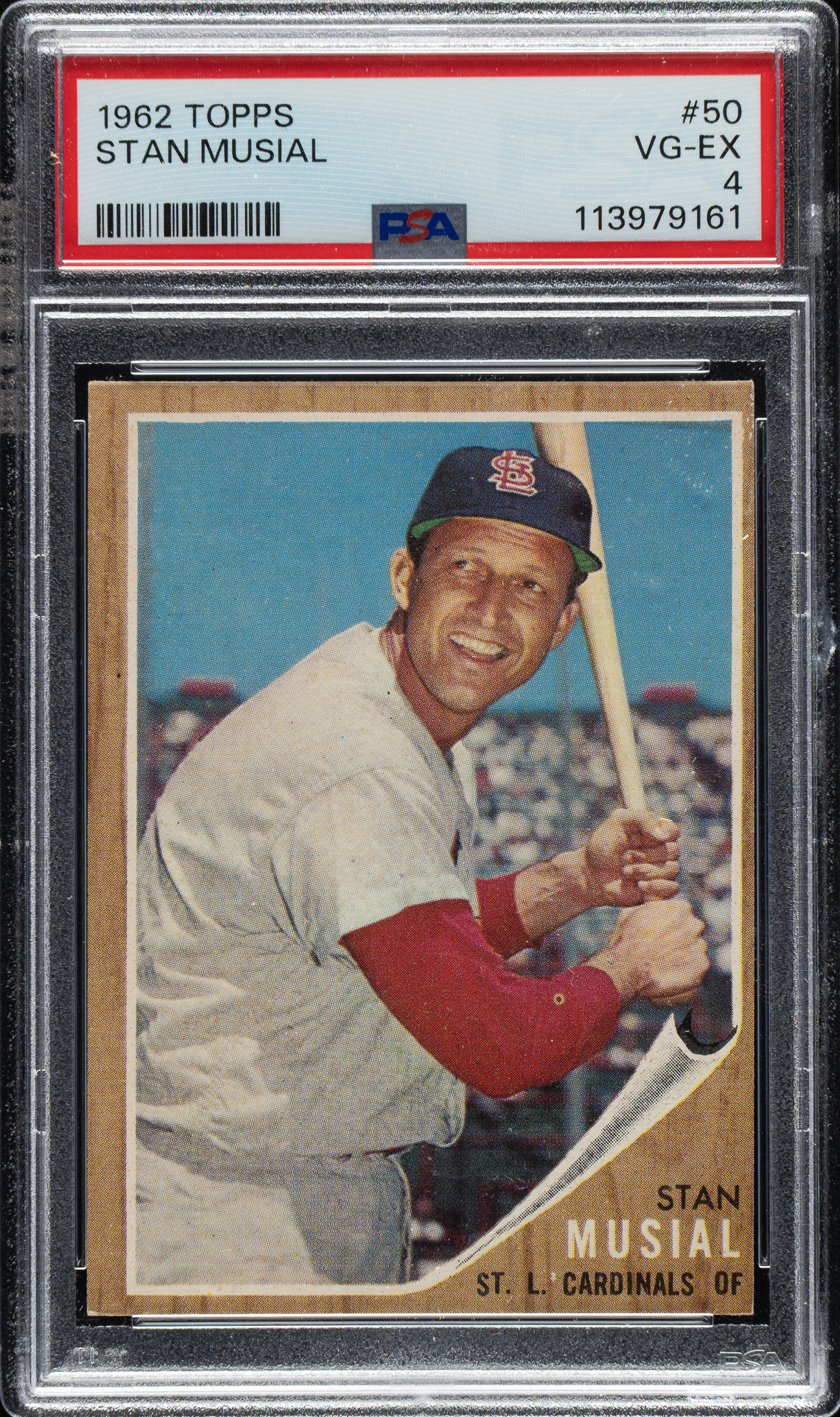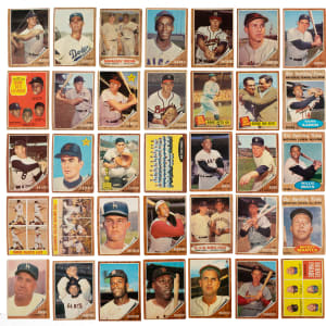 The 1962 Topps set has a well-deserved reputation for being the era's most condition-sensitive issue. The flush-to-the-border brown wood-grain design of the 1962 Topps set makes this issue particularly susceptible to edge and corner wear and makes the assembly of high-grade sets all the more difficult. This is an attractive mixed-grade complete set of this classic set, which includes all the great stars of the era. Condition is 16% Ex to Ex-Mt (including a couple Nr/Mt), 69% Vg to Vg-Ex, and 15% lesser. Keys: #1 Maris (Pr), 5 Koufax (Ex), 10 Clemente (Vg-Ex), 18 Manager's Dream (Pr), 25 Banks (Vg+), 30 Mathews (90/10 L/R, otherwise Ex), 45 B. Robinson (Ex), 50 Musial (PSA VG-EX 4), 53 AL HR Ldrs (Vg-Ex), 70 Killebrew (Pr-Fr), 99 Powell RC (0/100 T/B, otherwise Vg-Ex+), 100 Spahn (85/15 L/R, otherwise Ex), 139d Babe Hits 60/no pole in background (Vg), 140 Gehrig/Ruth (Ex-Mt), 150 Kaline (Ex-Mt), 199 Perry RC (Pr-Fr), 200 Mantle (Pr), 218 Torre RC (Vg), 251 Yankees Team (Gd+), 300 Mays (Vg+), 310 Ford (Vg-Ex), 313 Maris Blast (Ex), 318 Switch Hitter Connects - Mantle (Fr), 320 Aaron (Vg), 340 Drysdale (Vg-Ex), 350 F. Robinson (Vg), 360 Berra (Pr-Fr due to pencil on front), 387 Brock RC (Gd+), 394 Aaron AS (95/5 L/R, otherwise Vg), 395 Mays AS (Vg+), 401 Maris/Cepeda (Pr, laminated front and back), 425 Yastrzemski (Vg-Ex), 471 Mantle AS (Pr-Fr), 500 Snider (0/100 T/B, otherwise Vg+), 505 Marichal (Ex), 530 Gibson (Vg), 544 McCovey (Gd), 545 Wilhelm (Gd+), 575 Schoendienst (Vg-Ex), 592 Bouton RC (Vg+), 594 Uecker RC (Fr), 596 Pepitone RC (Ex+), and 598 Hickman RC (Vg). Affordable, mostly mid-grade complete sets such as this are always extremely popular when available, as they represent such a tremendous collecting value. Total: 598 cards.