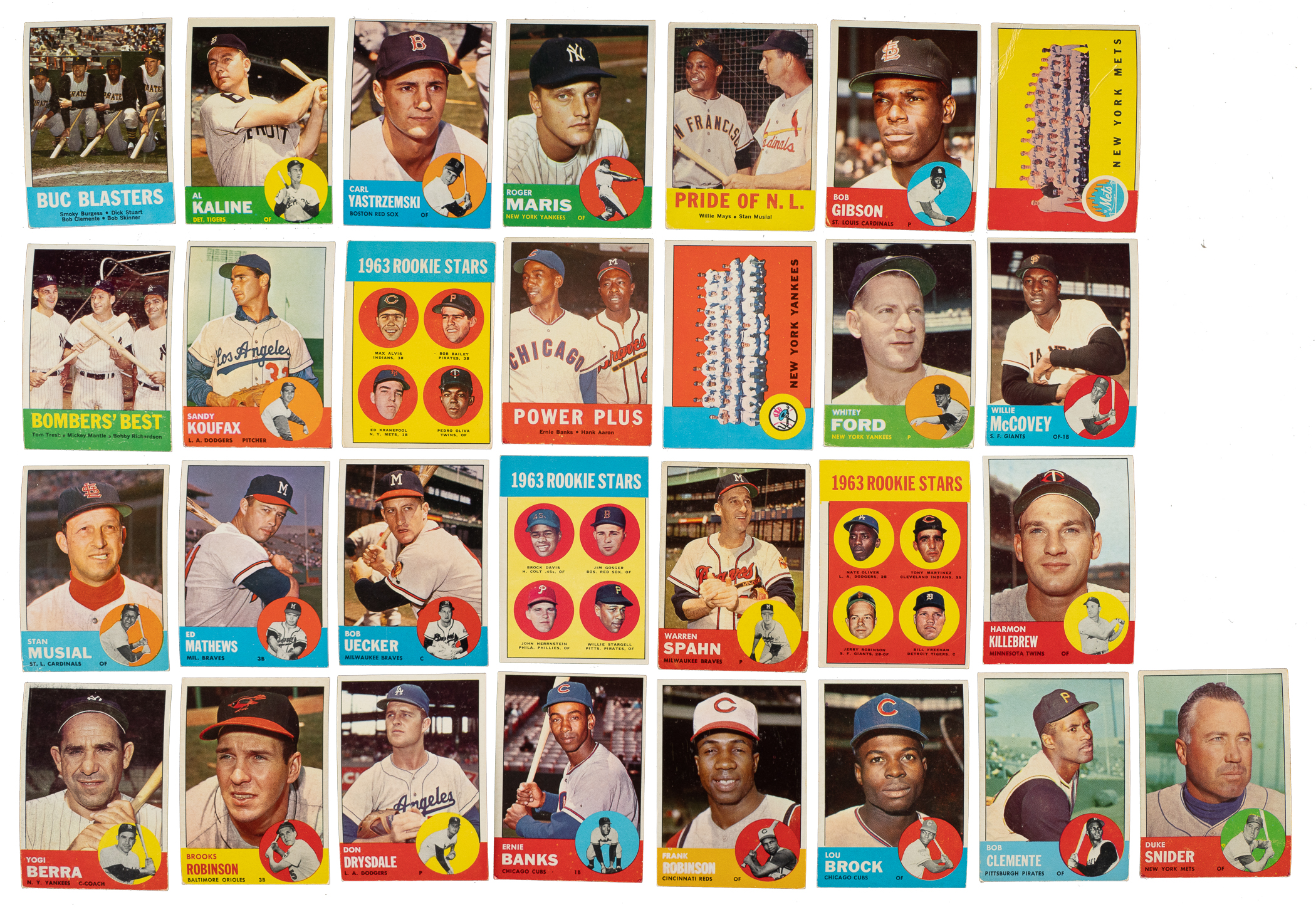 Highlighted by the rookie cards of Pete Rose and Willie Stargell, the 1963 Topps also includes many additional key star cards in the difficult high-number series, including Roberto Clemente and Duke Snider. Condition is 27% Ex to Ex-Mt (including 2% Nr/Mt), 56% Vg to Vg-Ex, and 17% lesser (including a few with a slight miscut, a couple with a slight trim, one that measures small, and 13 with color added). Two key cards have been professionally graded and encapsulated by PSA. Keys: #18 Buc Blasters (Vg+), 25 Kaline (90/10 T/B, otherwise Ex), 115 Yastrzemski (Ex), 120 Maris (Ex), 126 Uecker (Ex-Mt), 138 Mays/Musial (Vg), 173 Bombers' Best with Mantle (Vg-Ex), 200 Mantle (EX 5), 210 Koufax (color added, otherwise Vg), 228 Oliva RC (Vg), 242 Banks/Aaron (color added, otherwise Vg), 247 Yankees Team (Vg-Ex), 250 Musial (Vg), 275 Mathews (Ex+), 300 Mays (Ex+), 320 Spahn (Gd), 340 Berra (small pen mark on reverse, otherwise Vg), 345 B. Robinson (Vg-Ex), 360 Drysdale (Ex), 380 Banks (color added, otherwise Vg+), 390 Aaron (Ex), 400 F. Robinson (Vg-Ex), 415 Gibson (Vg-Ex), 446 Ford (Vg), 466 Freehan RC (Vg-Ex), 472 Brock (Ex-Mt), 473 Mets Team (Fr), 490 McCovey (Vg+), 500 Killebrew SP (Ex), 537 Rose RC (EX-MT 6), 540 Clemente (Vg), 550 Snider (color added, otherwise Gd+), and 553 Stargell RC (Ex+). Very attractive and mostly mid-grade complete set. Total: 576 cards.