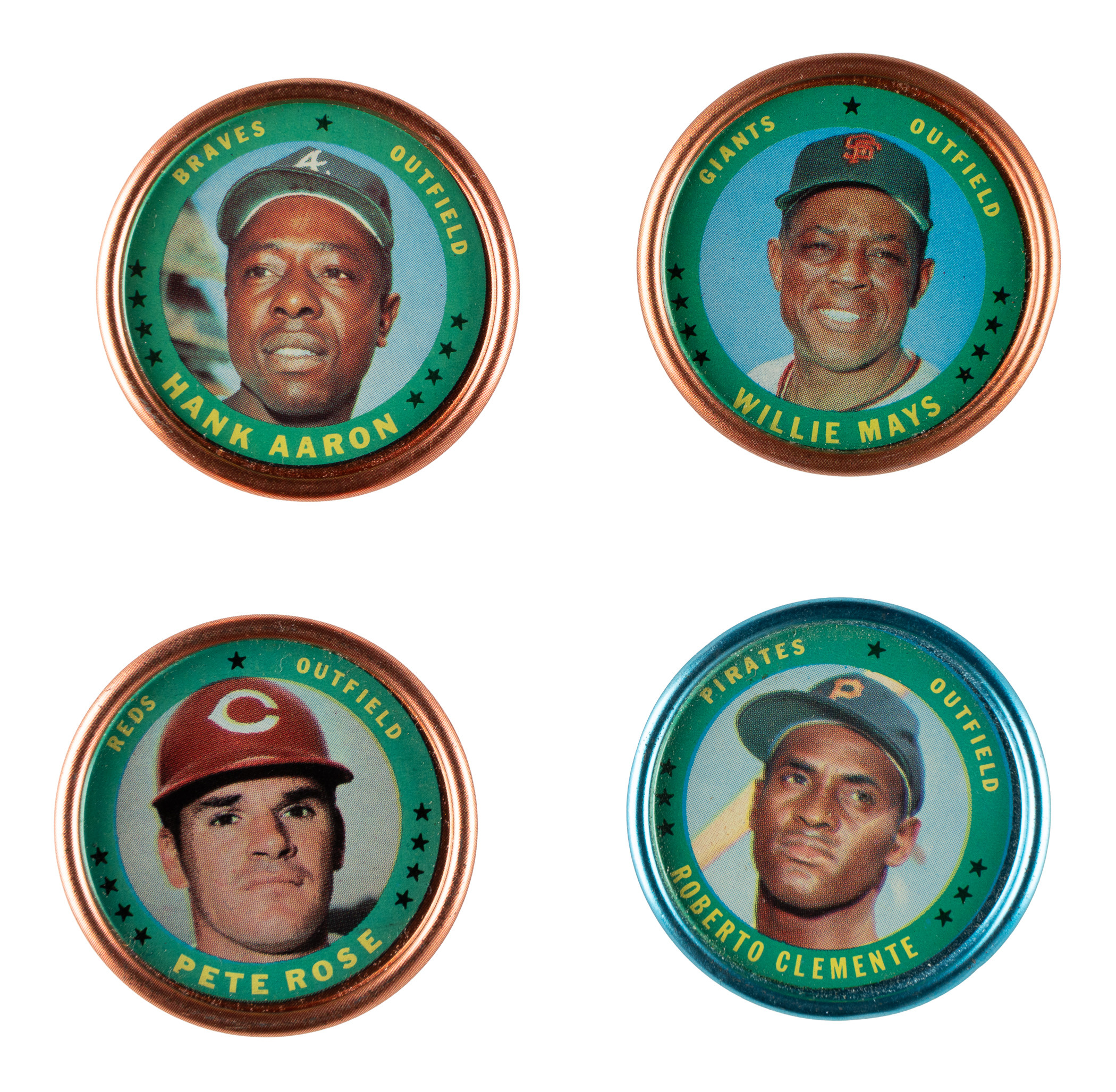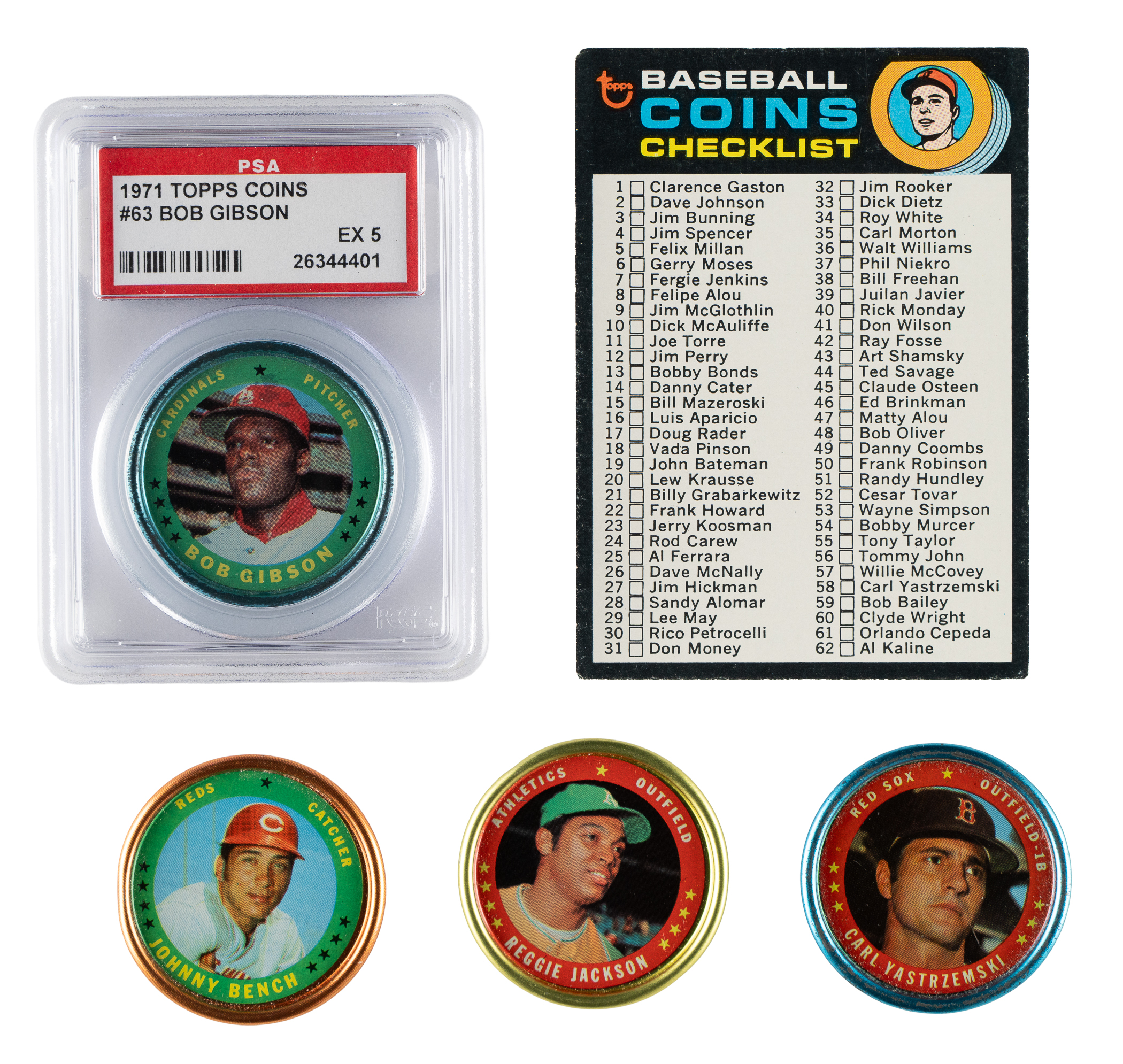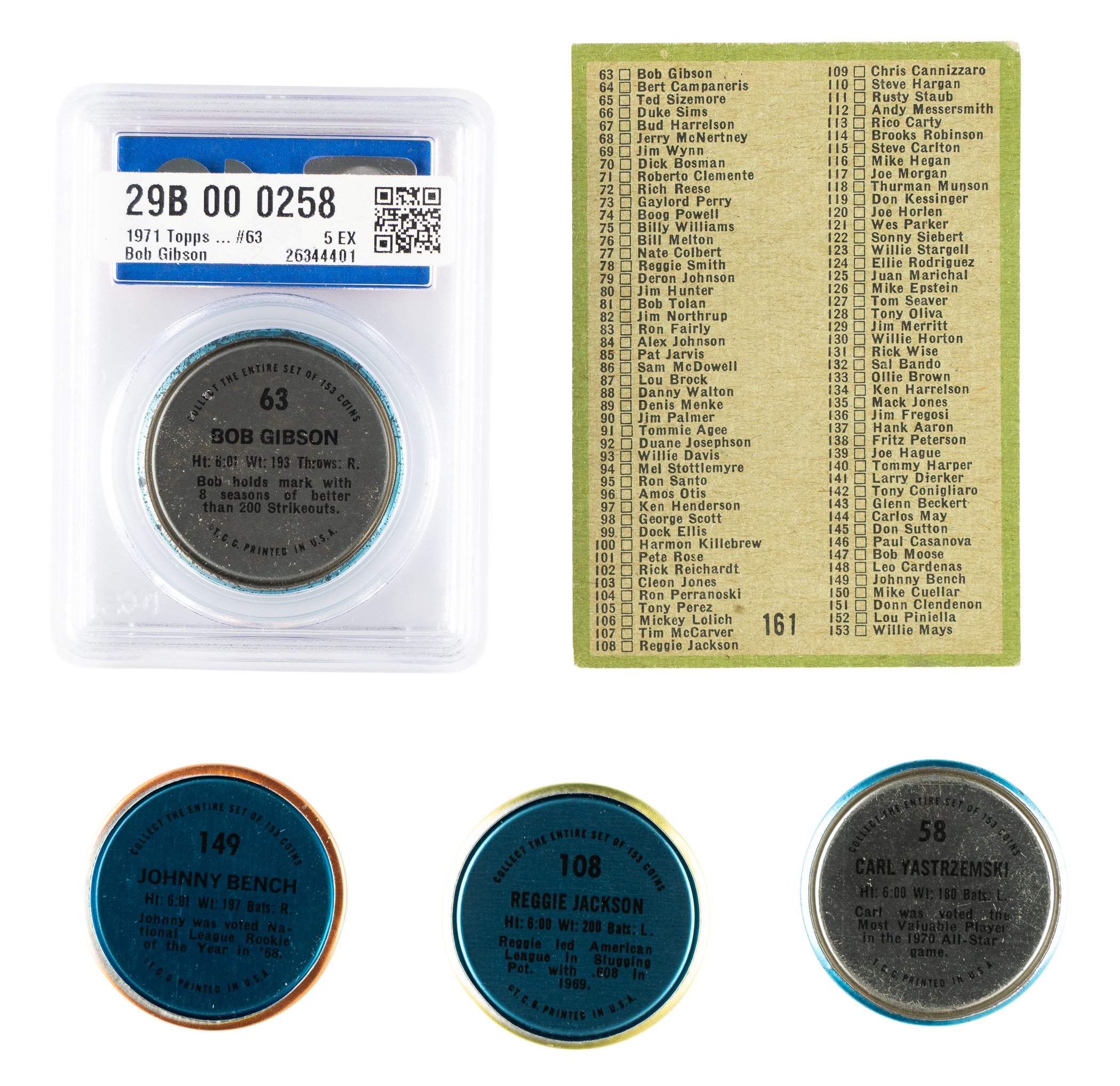 Presented is a complete set of 1971 Topps metal coins. These coins were issued as a special insert in baseball-card wax packs. The set features all the major stars of the era, including Mays, Clemente, Aaron, Rose, and many more. Included is an example of the coins checklist card (#161) from the 1971 Topps baseball set, grading Vg+. Condition is 80% Nr/Mt to Nr/Mt-Mt (including a few Mint) and 20% Ex to Ex-Mt (including a couple slightly lesser. Keys: #58 Yastrzemski (Ex-Mt), 63 Gibson (PSA EX 5), 71 Clemente (Nr/Mt), 101 Rose (Nr/Mt), 108 Jackson (Nr/Mt), 137 Aaron (Nr/Mt), 149 Bench (Nr/Mt), and 153 Mays (Nr/Mt). This is a very attractive mid- to high-grade insert coin set loaded with all the stars and Hall of Famers of the day! Total: 153 coins plus one checklist.