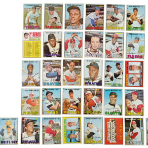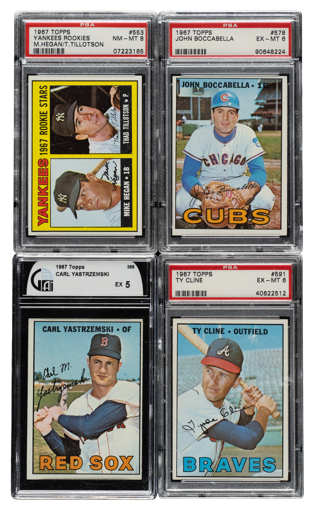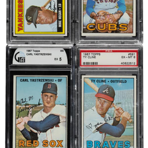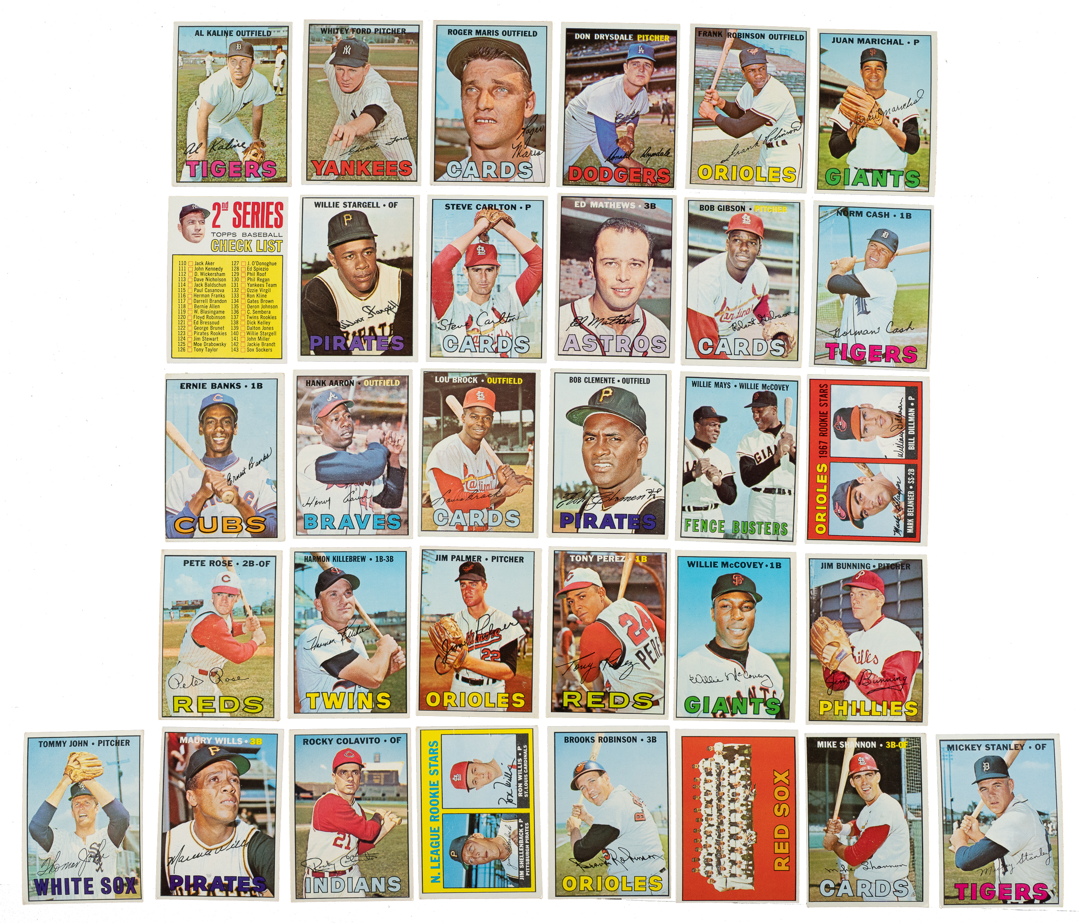 The 1967 Topps set has always been extremely popular, featuring scores of stars and Hall of Famers from what is now fondly remembered by many baby boomers as the Golden Age of baseball cards. This set includes legends such as Mantle, Mays, Aaron, and Clemente, from an era before big money ruled the game and when the summer All-Star contests were composed almost exclusively of first-rate Hall of Famers. Condition is 29% Ex-Mt to Nr/Mt (including a few Nr/Mt-Mt), 52% Vg-Ex to Ex, and 19% Gd to Vg (including a couple lesser, a couple with a slight miscut, and a couple trimmed). Five cards have been professionally graded and encapsulated by PSA (3), BVG (1), and GAI (1). Keys: #5 Ford (small ink mark on bottom border, otherwise Nr/Mt), 30 Kaline (Vg), 45 Maris (Vg-Ex+), 55 Drysdale (85/15 T/B, otherwise Ex-Mt), 100 F. Robinson (Ex-Mt), 103 Checklist - Mantle (Ex+), 140 Stargell (Vg+), 146 Carlton (slightly miscut left edge, otherwise Ex-Mt+), 150 Mantle (Vg-Ex+), 166 Mathews (Vg), 200 Mays (Vg+), 210 Gibson (Vg), 215 Banks (1/99 L/R, otherwise Vg), 250 Aaron (Ex), 285 Brock (Ex), 355 Yastrzemski (GAI EX 5), 400 Clemente (Vg-Ex), 423 Fence Busters (Vg-Ex+), 430 Rose (Vg-Ex), 460 Killebrew (Vg-Ex), 475 Palmer (slightly miscut right edge, otherwise Ex), 476 Perez (Vg-Ex+), 480 McCovey (25/75 L/R and B/T, otherwise Nr/Mt), 500 Marichal (25/75 L/R, otherwise Nr/Mt-Mt), 540 Cash (trimmed, otherwise Ex+), 553 Yankees Rookies (NM-MT 8), 558 Belanger RC (Ex), 560 Bunning (Ex+), 569 Carew RC (BVG VG-EX+ 4.5), 570 Wills (Ex), 578 (EX-MT 6), 580 Colavito (Vg-Ex), 581 Seaver RC (Ex), 591 (EX-MT 6), 592 NL Rookies (Vg), 600 B. Robinson (Ex), 604 Red Sox Team (Ex), 605 Shannon (Vg+), 607 Stanley (Vg-Ex), and 609 John (Vg+). Very attractive mid- to high-grade complete set with numerous highlights. Total: 609 cards.