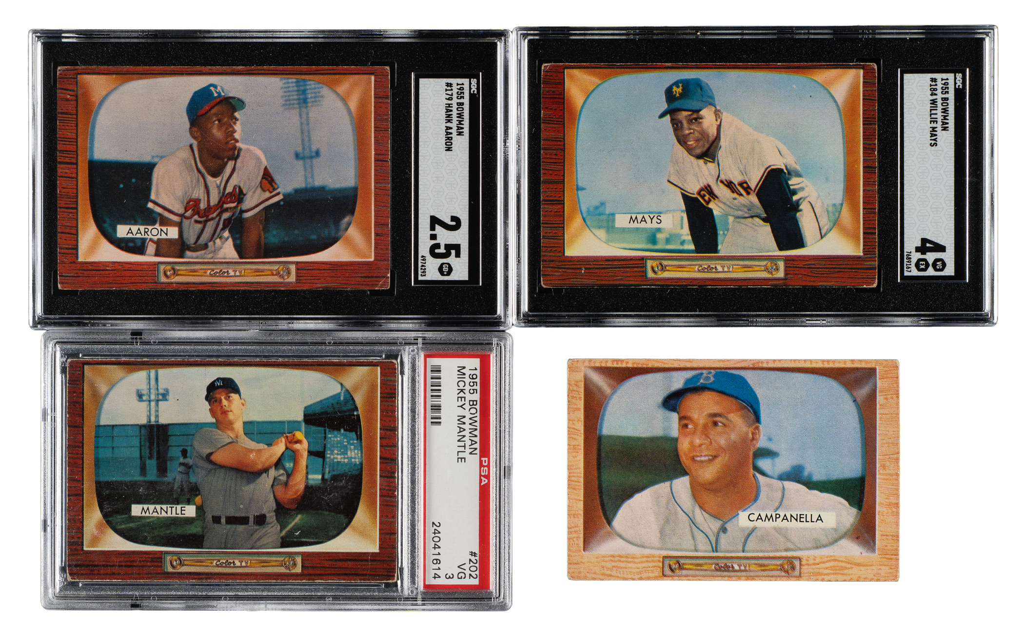 Complete set of 320 cards highlighted by many Hall of Famers, including Mantle, Aaron, Mays, Kaline, and Banks. Includes three signed cards (#67 Don Larsen, 139 signed by Bobby Shantz, and 140 Bobby Shantz). Condition is 31% Ex to Ex-Mt (including 11 Nr/Mt) and 69% Vg to Vg-Ex (including seven lesser, five that measure small, and one trimmed). Three cards have been graded and encapsulated by SGC (2, submitted by REA) and PSA (1). Keys: #1 Wilhelm (Vg-Ex+), 10 Rizzuto (Ex), 22 Campanella (Gd), 23 Kaline (Vg), 33 Fox (Vg), 37 Reese (Vg+), 38 Wynn (0/100 T/B, otherwise Vg-Ex), 59 Ford (Ex+), 68 Howard RC (Vg-Ex), 103 Mathews (Ex), 130 Ashburn (Ex-Mt+), 134 Feller (Vg-Ex), 158 Hodges (Vg), 168 Berra (Ex+), 171 Roberts (Ex-Mt), 179 Aaron (GOOD+ 2.5), 184 Mays (VG/EX 4), 191 Lemon (Vg), 197 Kiner (Vg-Ex), 202 Mantle (PSA VG 3), 242 Banks (Vg-Ex), 265 Barlick (Vg-Ex), 283 Chylak (Ex), 303 Conlan (Ex+), and 315 Hubbard RC (Vg-Ex+). The 1955 Bowman cards (Bowman's final baseball-card issue) have always been very popular due to their classic "television" style and the inclusion of so many stars. The flush-to-the-border wood-grain design of this issue makes them very susceptible to corner and edge wear, and very difficult to assemble as a complete set in high grade. Overall a very sharp-looking mid-grade complete set. This is the type of vintage set that, to so many collectors, represents the very best value. Total: 320 cards. Auction LOA from James Spence/JSA (for three signed cards).