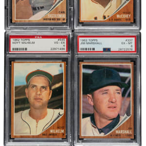 The 1962 Topps set has a well-deserved reputation for being the era's most condition-sensitive issue. The flush-to-the-border brown wood-grain design of the 1962 Topps set makes this issue particularly susceptible to edge and corner wear, and makes the assembly of high-grade sets all the more difficult. This is a very attractive mid-grade complete set of this classic set, which includes all the great stars of the era. Condition is 17% Ex to Ex-Mt (mostly Ex and including a couple Nr/Mt), 74% Vg to Vg-Ex, and 9% lesser. Eight cards have been professionally graded and encapsulated by PSA. Keys: #1 Maris (Vg-Ex), 5 Koufax (NM 7), 10 Clemente (EX-MT 6), 18 Manager's Dream (Vg+), 25 Banks (Gd), 30 Mathews (Vg-Ex), 45 B. Robinson (Gd+), 50 Musial (Vg-Ex), 53 AL HR Ldrs (Vg+), 70 Killebrew (Pr), 99 Powell RC (Vg-Ex+), 100 Spahn (Vg), 139d Babe Hits 60/no pole in background (miscut left edge, otherwise Vg), 140 Gehrig/Ruth (Vg+, green tint), 150 Kaline (Vg, green tint), 199 Perry RC (Ex), 200 Mantle (Vg), 218 Torre RC (Gd), 251 Yankees Team (Gd+), 300 Mays (Vg-Ex), 310 Ford (5/95 T/B, otherwise Vg-Ex+), 313 Maris Blast (Vg), 318 Switch Hitter Connects - Mantle (Vg-Ex), 320 Aaron (EX-MT 6), 337 (EX-MT 6), 340 Drysdale (Gd+), 350 F. Robinson (Vg+), 360 Berra (Vg-Ex), 387 Brock RC (EX 5), 394 Aaron AS (Vg), 395 Mays AS (Vg+), 401 Maris/Cepeda (Vg-Ex), 425 Yastrzemski (EX 5), 471 Mantle AS (slight trim, otherwise Vg+), 500 Snider (Vg+), 505 Marichal (Vg), 530 Gibson (15/85 T/B, otherwise Ex+), 544 McCovey (EX+ 5.5), 545 Wilhelm (VG-EX 4), 575 Schoendienst (Vg-Ex), 592 Bouton RC (Vg), 594 Uecker RC (Vg), 596 Pepitone RC (Vg), and 598 Hickman RC. Attractive mid-grade complete sets such as this are always extremely popular when available, as they represent such a tremendous collecting value. Total: 598 cards.