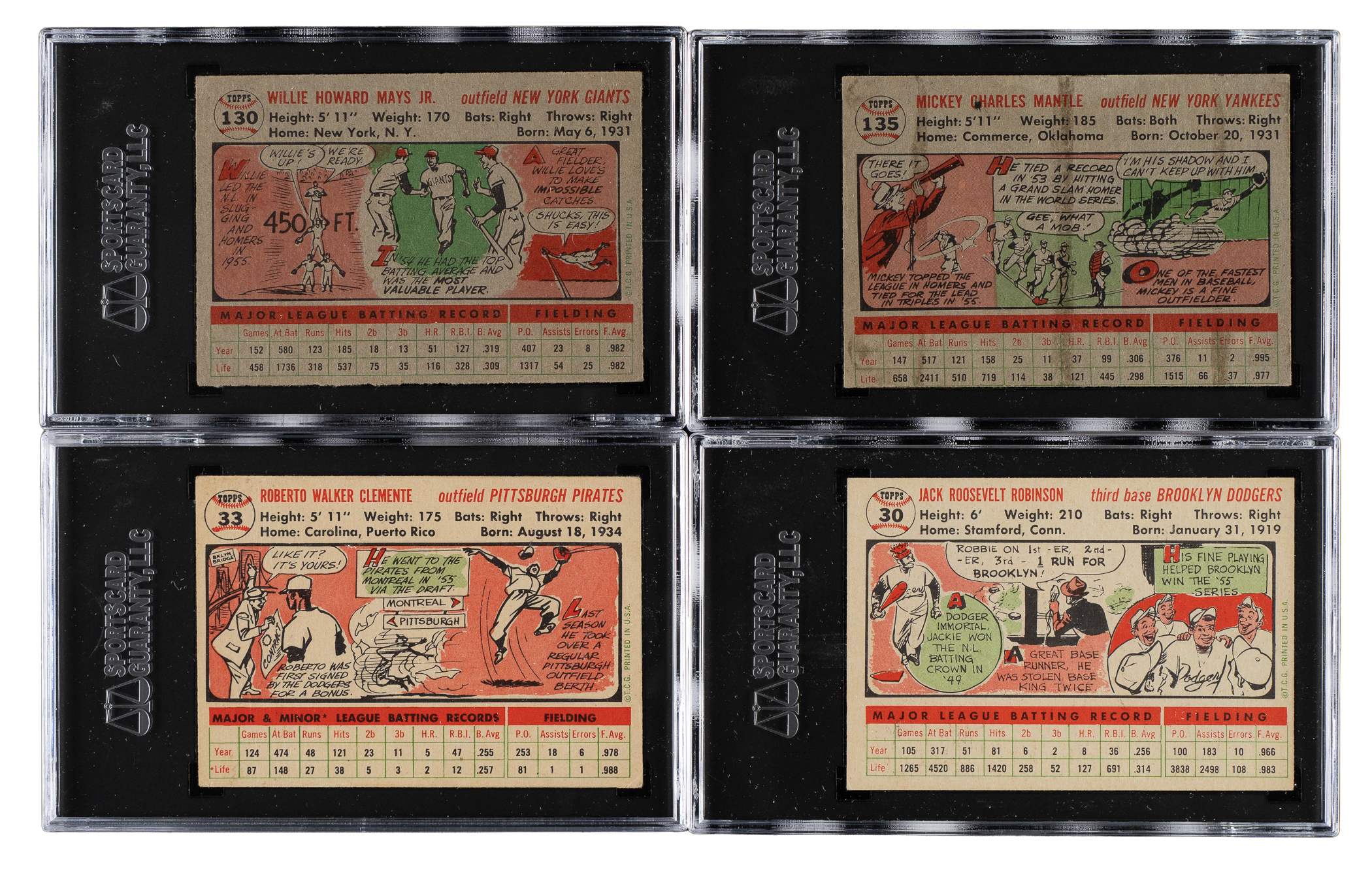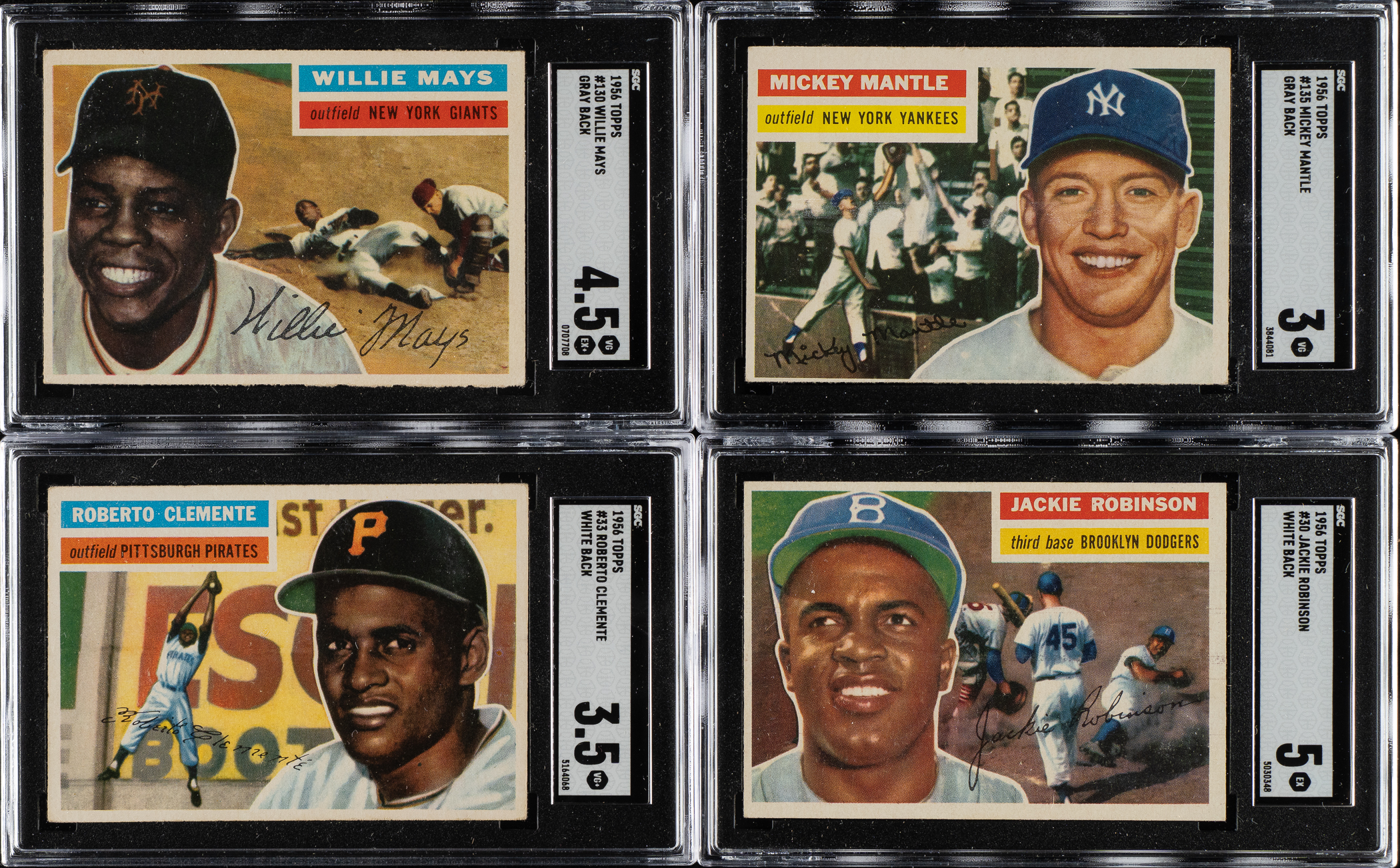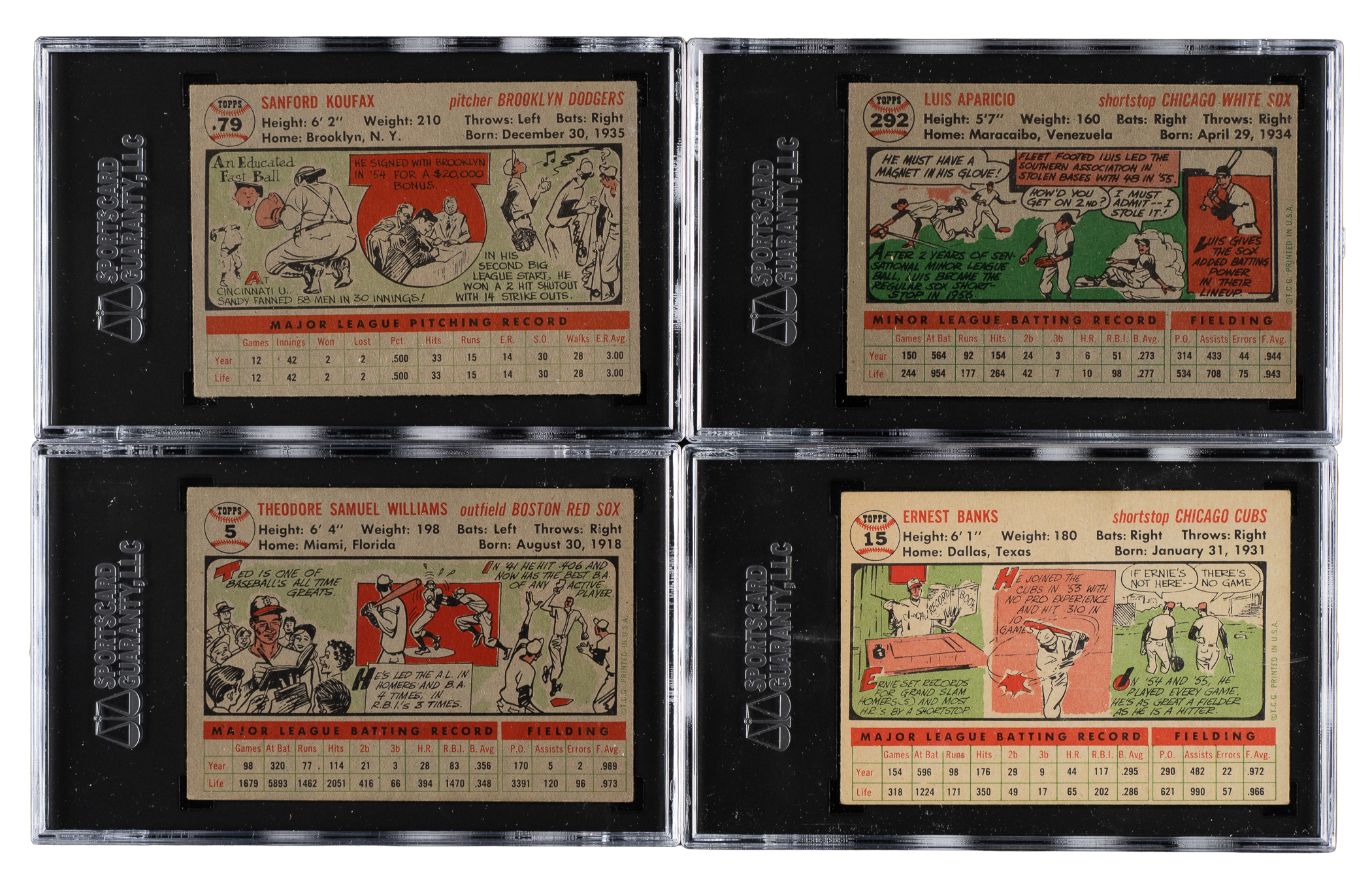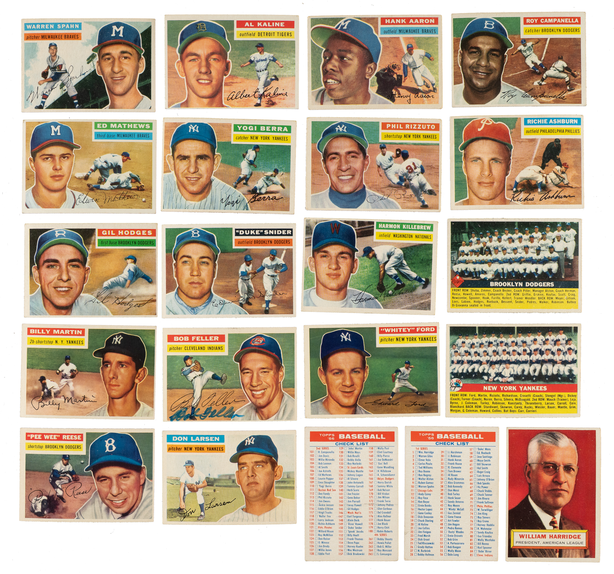 Outstanding mid-grade complete set of 1956 Topps featuring all the Hall of Famers and stars of the era, including Mickey Mantle, Hank Aaron, and Willie Mays. This set includes both checklists and six team card variations (#11, 72, 85, 90, 95, and 100). Also includes three signed cards (#35 Rosen, 200 Feller, and 234 Runnels), with only the Runnels authenticated by JSA. Includes 71 significant gray back variations (#1-100). Condition is 15% Ex-Mt to Nr/Mt (mostly Ex-Mt), 68% Vg-Ex to Ex, and 17% Gd to Vg (including a few lesser). Eight cards have been professionally graded and encapsulated by SGC. Keys: #1 Harridge (Vg, white back), 5 Williams (VG 3, gray back), 10 Spahn (Ex, white back), 15 Banks (EX 5, white back), 20 Kaline (Vg-Ex, gray back), 30 Robinson (EX 5, white back), 31 Aaron (Vg, gray back), 33 Clemente (VG+ 3.5, white back), 79 Koufax (EX 5, gray back), 101 Campanella (Vg-Ex+, gray back), 107 Mathews (Vg-Ex, white back), 110 Berra (Ex, gray back), 113 Rizzuto (Vg, gray back), 120 Ashburn (Vg, gray back), 130 Mays (VG/EX+ 4.5, gray back), 135 Mantle (VG 3, gray back), 145 Hodges (85/15 L/R, otherwise Ex-Mt, gray back), 150 Snider (Ex+, gray back), 164 Killebrew (Vg-Ex+, gray back), 166 Dodgers (Vg, gray back), 181 Martin (90/10 L/R, otherwise Ex+), 200 Feller (signed, 85/15 T/B, otherwise Nr/Mt), 240 Ford (Vg-Ex+), 251 Yankees (Vg-Ex), 260 Reese (Ex), 292 Aparicio RC (EX 5), 332 Larsen (Vg+), Checklist 1/3 (Vg+), and Checklist 2/4 (Vg). This is a very attractive complete set of this classic 1950s Topps issue. Total: 348 cards (set of 340 plus two checklists and six variations). Auction LOA from James Spence/JSA (for the three signed cards only).