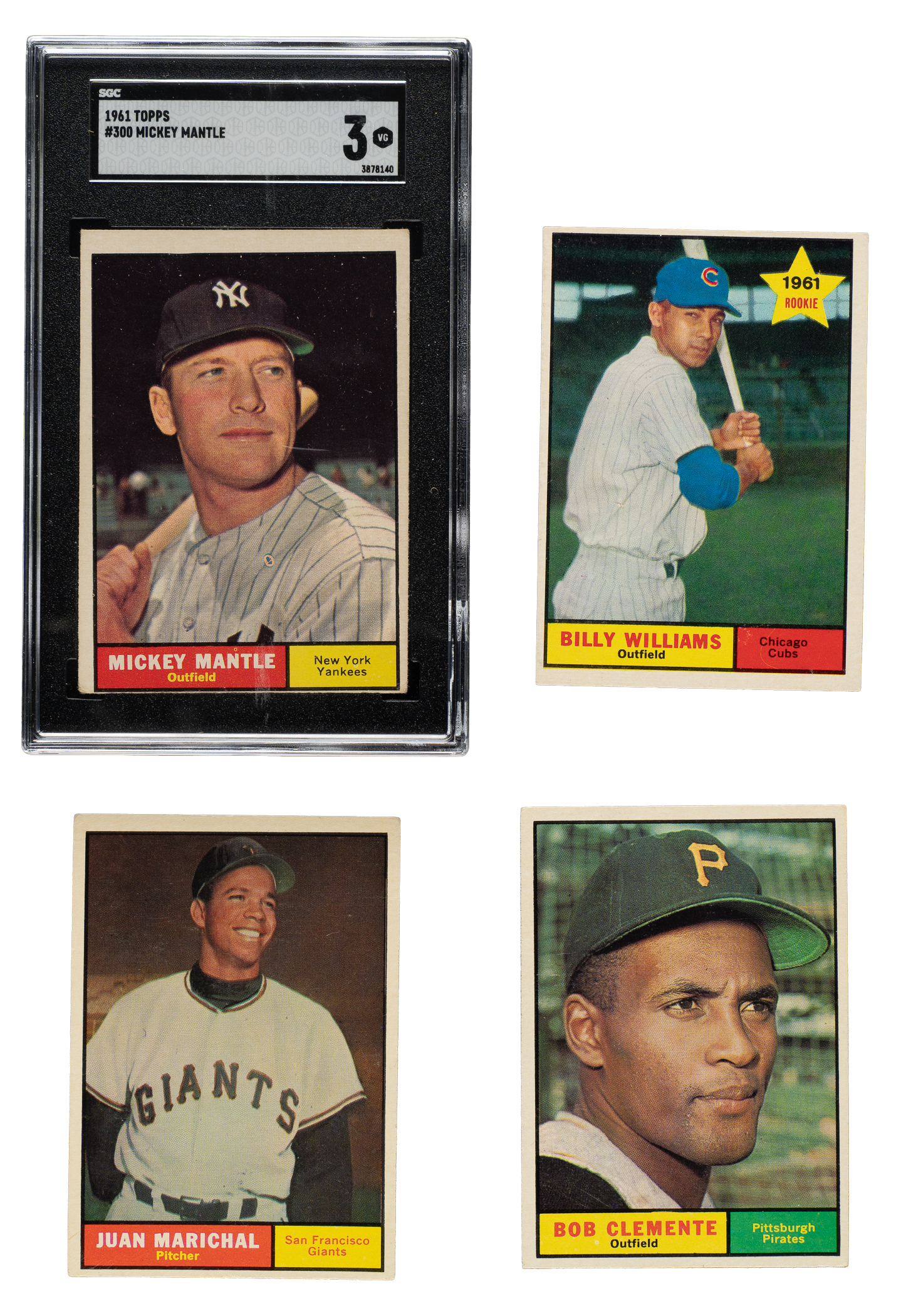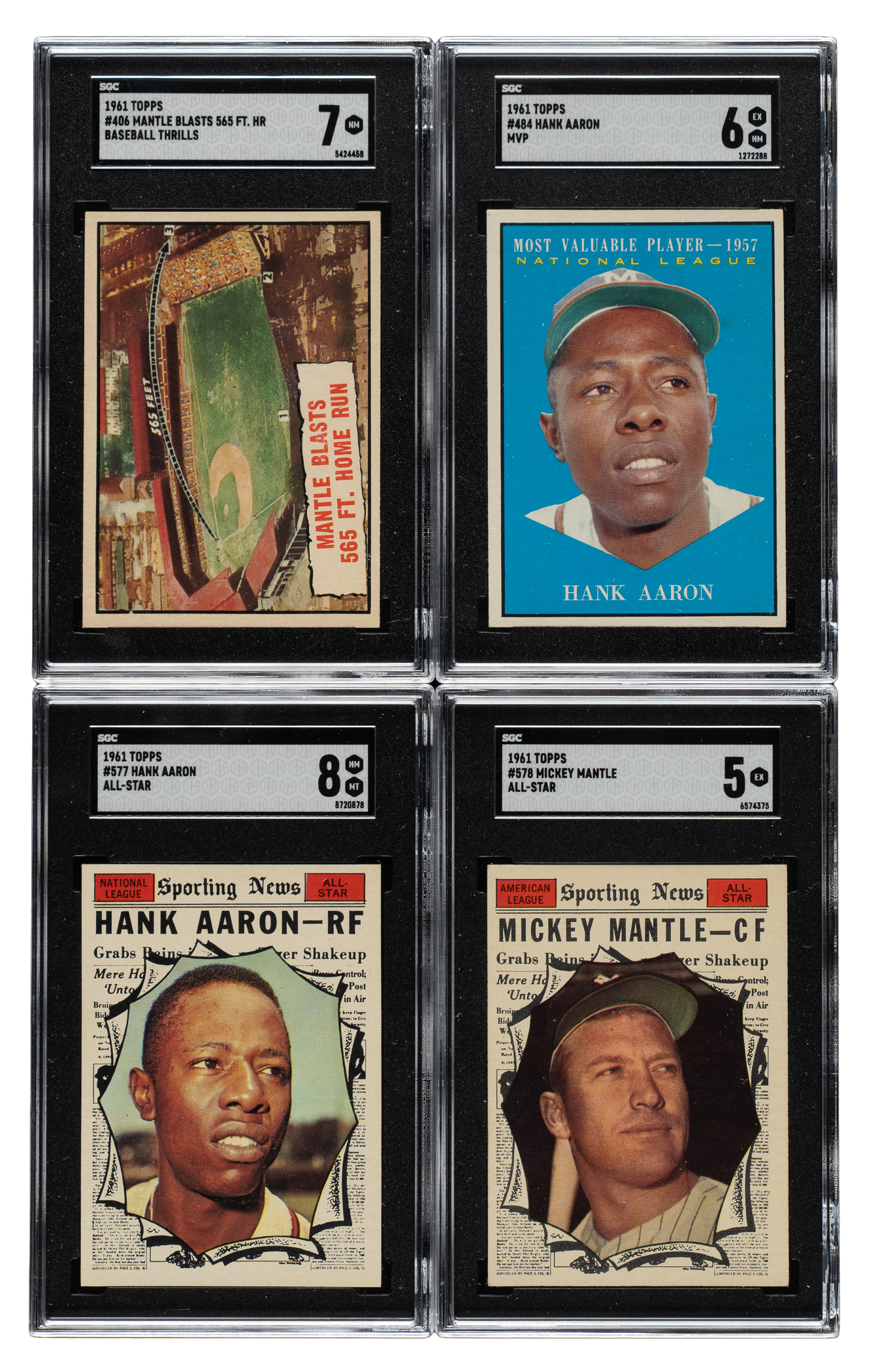 Presented is a very sharp-looking complete set of one of the era's most popular issues, crisp and clean throughout. The 1961 Topps set includes five different Mickey Mantle cards, and was Topps' first venture into the popular League Leader subset. The Most Valuable Player subset, an extremely difficult high-number run, and the rookie cards of Juan Marichal, Billy Williams, and Ron Santo also highlight this set. Condition is 15% Ex-Mt to Nr/Mt (including a few Nr/Mt-Mt), 67% Vg-Ex to Ex, and 18% Gd to Vg (including a couple lesser). Five cards have been professionally graded and encapsulated by SGC. Keys: #2 Maris (Vg), 10 B. Robinson (Vg), 35 Santo RC (Vg-Ex), 44 AL HR Ldrs (Ex), 80 Killebrew (Ex), 120 Mathews (Ex), 141 B. Williams RC (Vg-Ex), 150 Mays (Vg), 160 Ford (Ex), 200 Spahn (85/15 T/B, otherwise Nr/Mt), 211 Gibson (Ex), 228 Yankees Team (Vg-Ex), 260 Drysdale (Ex+), 287 Yastrzemski (Vg-Ex), 290 Musial (Vg-Ex), 300 Mantle (VG 3), 307 Mantle WS Gm. 2 (98/2 T/B, otherwise Ex), 344 Koufax (Ex), 350 Banks (Ex), 360 F. Robinson (Ex-Mt), 388 Clemente (Vg-Ex), 401 Ruth Hits 60th (Ex), 405 Gehrig Benched (Ex), 406 Mantle Blasts HR (NM 7), 415 Aaron (Vg), 417 Marichal RC (Vg-Ex), 425 Berra (99/1 T/B, otherwise Gd+), 429 Kaline (Vg-Ex+), 443 Snider (1/99 T/B, otherwise Ex-Mt), 475 Mantle MVP (Vg-Ex), 478 Maris MVP (Vg), 482 Mays MVP (Vg-Ex), 484 Aaron MVP (EX/NM 6), 517 McCovey (Ex+), 576 Maris AS (Ex+), 577 Aaron AS (NM/MT 8), 578 Mantle AS (EX 5), and 579 Mays AS (Ex). 1961 will always be remembered as a "magical year" in baseball history, and a high-quality, mid- to high-grade complete set of 1961 Topps as offered here will always be a highly prized "time capsule." Total: 587 cards.