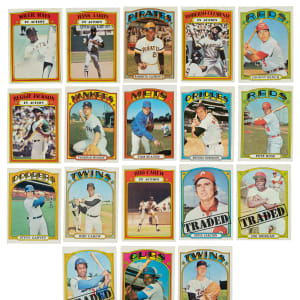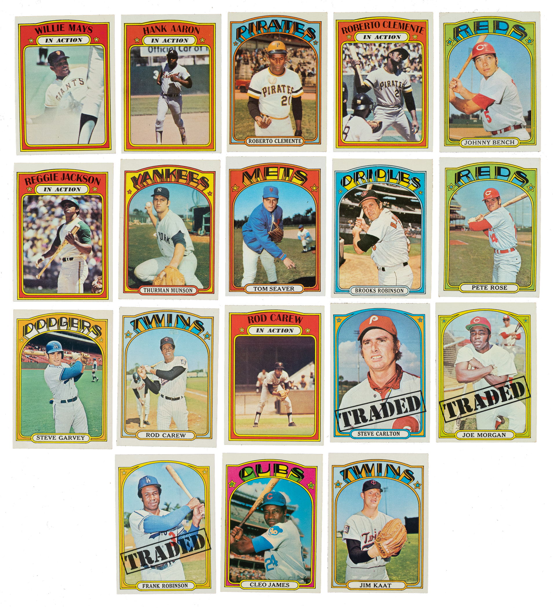 Presented is a complete set consisting of 787 cards from the 1972 Topps series, one of the most popular Topps sets of the decade. Includes both variations of #378. Condition is 17% Ex-Mt to Nr/Mt, 65% Vg-Ex to Ex, and 18% Gd to Vg (including a couple lesser). Keys: #49 Mays (Ex), 50 Mays IA (Ex), 79 Fisk RC (Ex-Mt), 117a James/green under "C" and "S" (Nr/Mt), 299 Aaron (Gd), 300 Aaron IA (Ex), 309 Clemente (Vg+), 310 Clemente IA (Ex), 433 Bench (Vg+), 435 Jackson (Ex), 441 Munson (Ex), 445 Seaver (75/25 T/B, otherwise Ex-Mt), 550 B. Robinson (25/75 L/R, otherwise Ex-Mt+), 559 Rose (Ex), 595 Ryan (Vg-Ex+), 686 Garvey (Ex-Mt+), 695 Carew (20/80 T/B, otherwise Nr/Mt), 696 Carew IA (Nr/Mt), 709 Kaat (Nr/Mt), 751 Carlton Traded (Ex-Mt), 752 Morgan Traded (Vg-Ex), and 754 F. Robinson Traded (Ex+). This is a very attractive mid- to high-grade complete set of one of the great classic Topps series of the era! Total: 788 cards (set of 787 plus one variation).