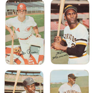 Presented is a complete 63-card 1971 Topps Super set, highlighted by many Hall of Famers and stars including Willie Mays, Hank Aaron, and Roberto Clemente. Condition is 69% Nr/Mt to Nr/Mt-Mt and 31% Ex to Ex-Mt (including some due to centering, a few slightly lesser, and one with a slight miscut). Keys: #20 Rose (Nr/Mt+), 37 Clemente (Nr/Mt+), 38 Jackson (Nr/Mt), 44 Aaron (Ex due to gum stain), and 56 Mays (Vg/Vg-Ex). Because of their high-quality production values and scarcity relative to other Topps sets of the era, it is a little surprising that this issue has not received more attention from collectors, but this is primarily because for many years grading companies did not have holders for this large-format issue. This is no longer the case, and collectors can now build sets of these cards in graded form just like they've done for many years with standard-sized cards. A very attractive high-grade complete set with several notable highlights. Total: 63 cards.