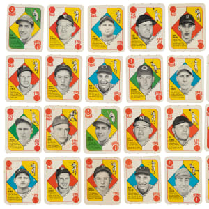 The 1951 Red Back set is extremely significant as it, and the "blue back" set, were the first major baseball-card sets ever issued by Topps. Offered as a single lot are two complete sets of 1951 Topps Red Backs. This collection consists of the following: 1) 1951 Topps Red Back Complete Set (52): Condition is 25% Nr/Mt to Nr/Mt-Mt, 33% Ex to Ex-Mt, and 42% Vg to Vg-Ex (including a couple lesser). Keys: #1 Berra (Vg), 5 Rizzuto (Vg), 6 Reynolds (Nr/Mt), 8 Wynn (Nr/Mt), 15 Kiner (Ex), 20 D. DiMaggio (Ex), 22 Feller (Ex-Mt), 30 Spahn (Nr/Mt), 31 Hodges (Nr/Mt), 36ab Zernial/Philadelphia in bio (Ex), 38 Snider (Ex due to light wrinkle on reverse), 39 Kluszewski (Ex-Mt), 50 Irvin (Nr/Mt-Mt), and 52b Holmes/Hartford (Vg+). 2) 1951 Topps Red Back Complete Set (52): Condition is 19% Nr/Mt to Nr/Mt-Mt (mostly Nr/Mt), 38% Ex to Ex-Mt, 27% Vg to Vg-Ex, and 16% lesser. Keys: #1 Berra (Gd), 5 Rizzuto (Vg), 6 Reynolds (Vg), 8 Wynn (Fr), 15 Kiner (Vg+), 20 D. DiMaggio (Vg-Ex), 22 Feller (Vg-Ex+), 30 Spahn (Nr/Mt), 31 Hodges (Vg+), 36b Zernial/Philadelphia in bio (Ex), 38 Snider (Fr), 39 Kluszewski (Vg+), 50 Irvin (Nr/Mt), and 52a Holmes/Boston (Ex). The 1951 Red Back Topps set is among the most significant yet overlooked of all early Topps cards, and in our opinion represents an extraordinary value. Total: 104 cards.