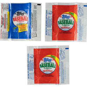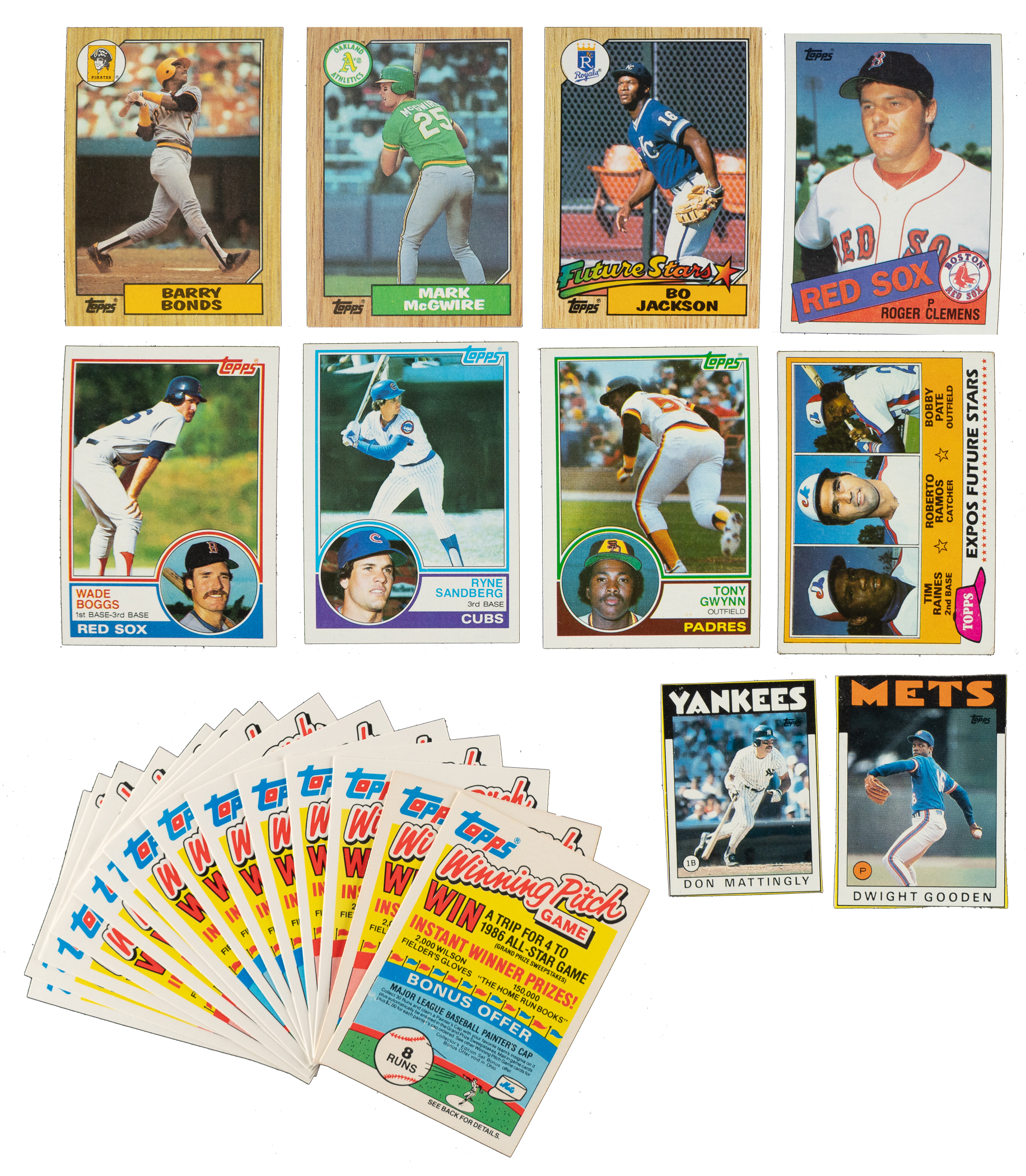 Collection of seven complete Topps baseball sets spanning the years 1981 through 1987. The collection is highlighted by the rookie cards of Raines, Ripken Jr., Boggs, Gwynn, Sandberg, Mattingly, Clemens, and McGwire. This collection consists of the following: 1) 1981 Topps Complete Set (726 cards): 26% Nr/Mt to Nr/Mt-Mt, 33% Ex to Ex-Mt, and 41% Vg to Vg-Ex. Keys: #240 Ryan (Ex), 261 Henderson (Ex), 302 Valenzuela RC (Nr/Mt-Mt), and 479 Raines RC (Vg). 2) 1982 Topps Complete Set (792 cards): 75% Nr/Mt to Nr/Mt-Mt (including some Mint) and 25% Ex to Ex-Mt (including a few lesser). Keys: #21 Ripken RC (Nr/Mt+ due to centering) and 90 Ryan (Nr/Mt-Mt). 3) 1983 Topps Complete Set (792 cards): 70% Nr/Mt to Nr/Mt-Mt (including some Mint) and 30% Ex to Ex-Mt (mostly due to centering and including a few lesser). Keys: #83 Sandberg RC (Ex-Mt due to centering), 163 Ripken (Nr/Mt due to centering), 360 Ryan (Nr/Mt-Mt+), 482 Gwynn RC (Nr/Mt), and 498 Boggs RC (Nr/Mt). 4) 1984 Topps Complete Set (792 cards): 72% Nr/Mt to Nr/Mt-Mt (including some Mint) and 28% Ex to Ex-Mt (including 2% lesser). Keys: #8 Mattingly RC (Nr/Mt-Mt), 182 Strawberry RC (Nr/Mt-Mt), and 470 Ryan (Ex+). 5) 1985 Topps Complete Set (792 cards): 67% Nr/Mt to Nr/Mt-Mt (including some Mint) and 33% Ex to Ex-Mt (mostly due to centering and including a few lesser). Keys: #181 Clemens RC (Nr/Mt+), 401 McGwire RC (Vg-Ex), 536 Puckett RC (Nr/Mt+), and 620 Gooden RC (Ex-Mt due to centering). 6) 1986 Topps Complete Set (792 cards): 65% Nr/Mt to Nr/Mt-Mt and 35% Ex to Ex-Mt (including a few lesser). Keys: #100 Ryan (Nr/Mt+), 329 Puckett (Nr/Mt-Mt), and 661 Clemens (Nr/Mt). 7) 1987 Topps Complete Set (792 cards): 67% Nr/Mt to Nr/Mt-Mt (including some Mint), 28% Ex to Ex-Mt, and 5% Vg to Vg-Ex. Keys: #170 Jackson RC (Ex-Mt+) and #320 Bonds RC (Nr/Mt-Mt). Also included is a total of fifteen assorted wrappers from 1982 to 1986 Topps (averaging Excellent condition). This is a very attractive collection of complete sets from a very popular era including countless stars, Hall of Famers, and other highlights! Total: 5,478 cards plus 15 wrappers. The size/weight of this item requires that there will be an additional shipping charge for this lot.