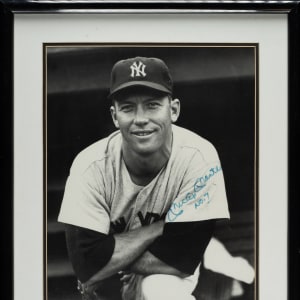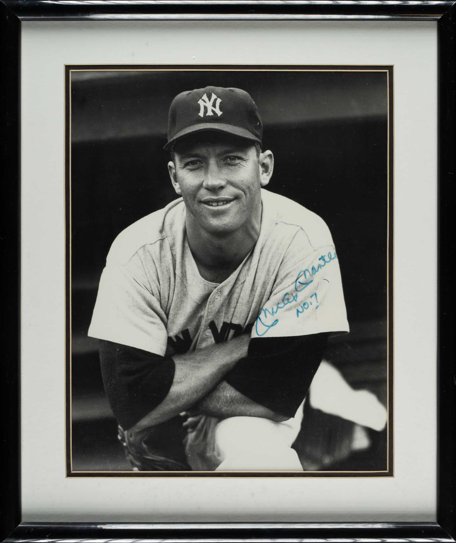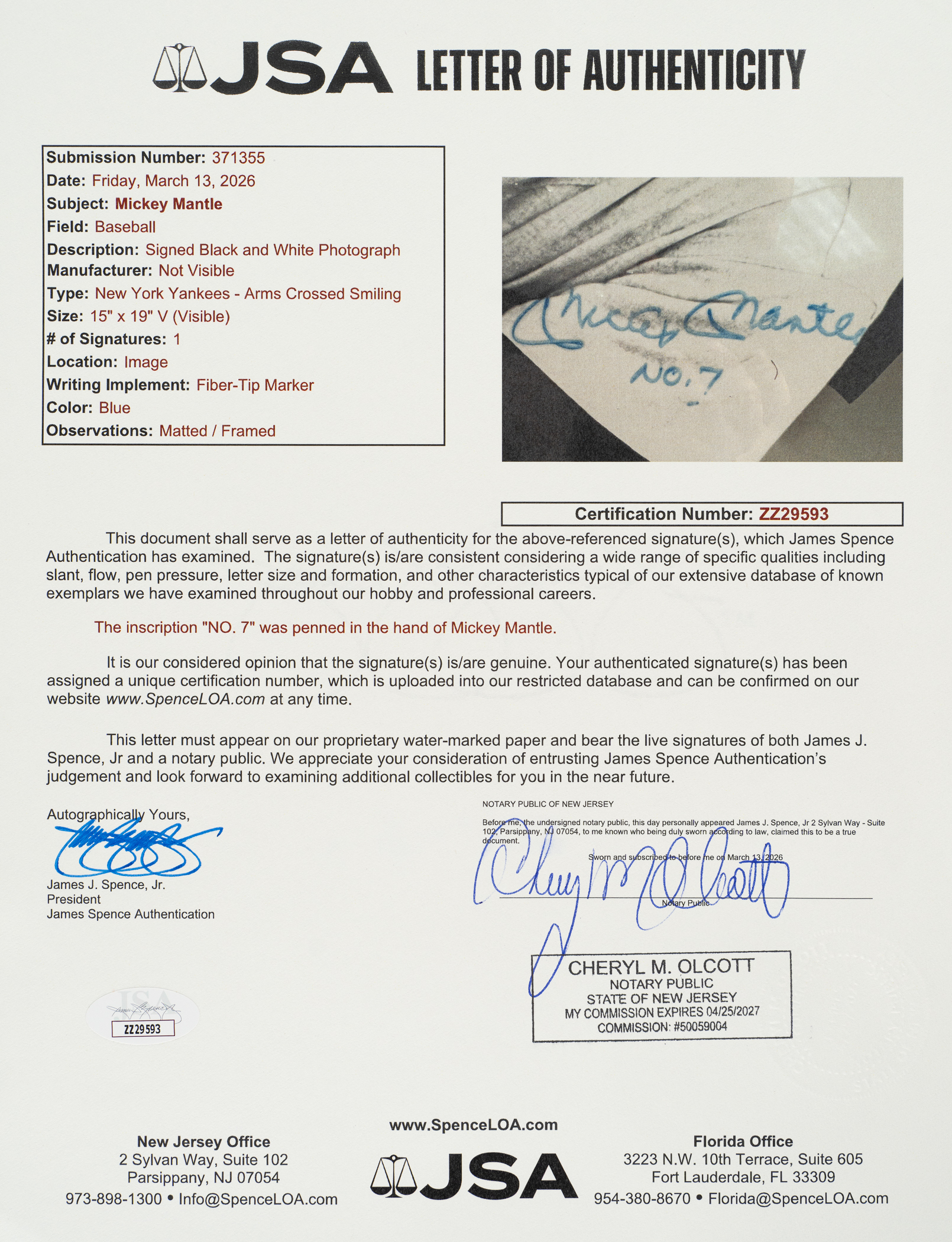 Black-and-white photo inscribed "Mickey Mantle No. 7" in blue marker across his image. The photo captures Mantle in uniform, smiling for the camera. The photo (15 x 19 inches; visible dimensions) is in apparent Near Mint condition overall. Matted and framed to total dimensions of 21 x 26 inches. Full LOA from James Spence/JSA.