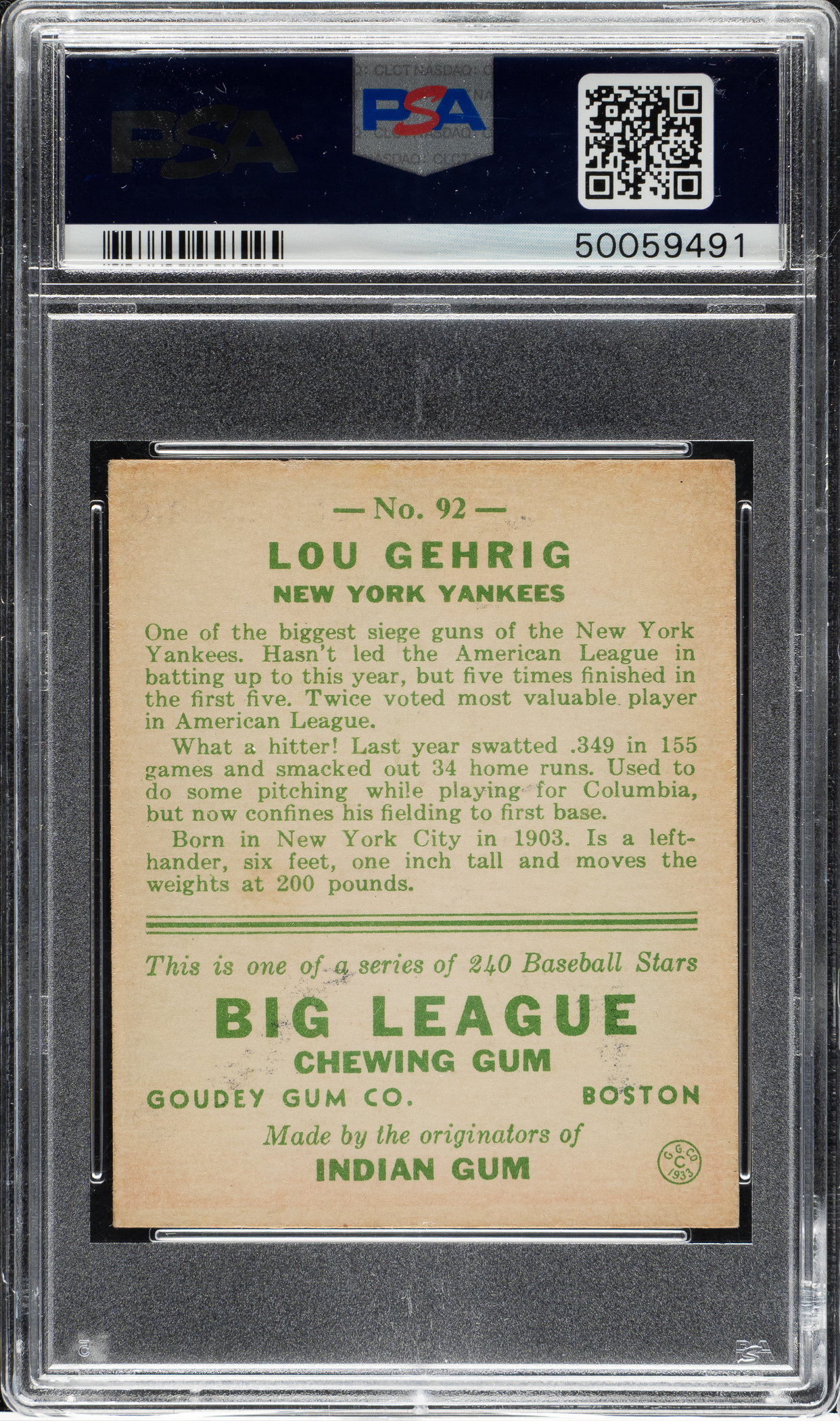 Graded NM 7 by PSA. Extremely high-grade example of one of the most popular of all Lou Gehrig cards and one of the most desirable of all 1930s bubble-gum cards. Bright and clean, both front and back, with a crisp image, and strong corners. Bold green text on the reverse. This is a tremendous example of one of Lou Gehrig's most important and highly prized baseball cards.