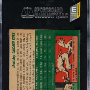 Graded NM+ 7.5 by SGC. Outstanding high-grade rookie card of Chicago Cubs Hall of Famer Ernie Banks from the 1954 Topps issue. This well-centered example has bright colors, a crisp image, and strong corners (weaker top left). Clean, boldly printed reverse. High-grade Banks rookies are offered with less frequency than other Hall of Fame rookie cards or stars from this set. This is a tremendous high-grade example of Ernie Banks' rookie card.